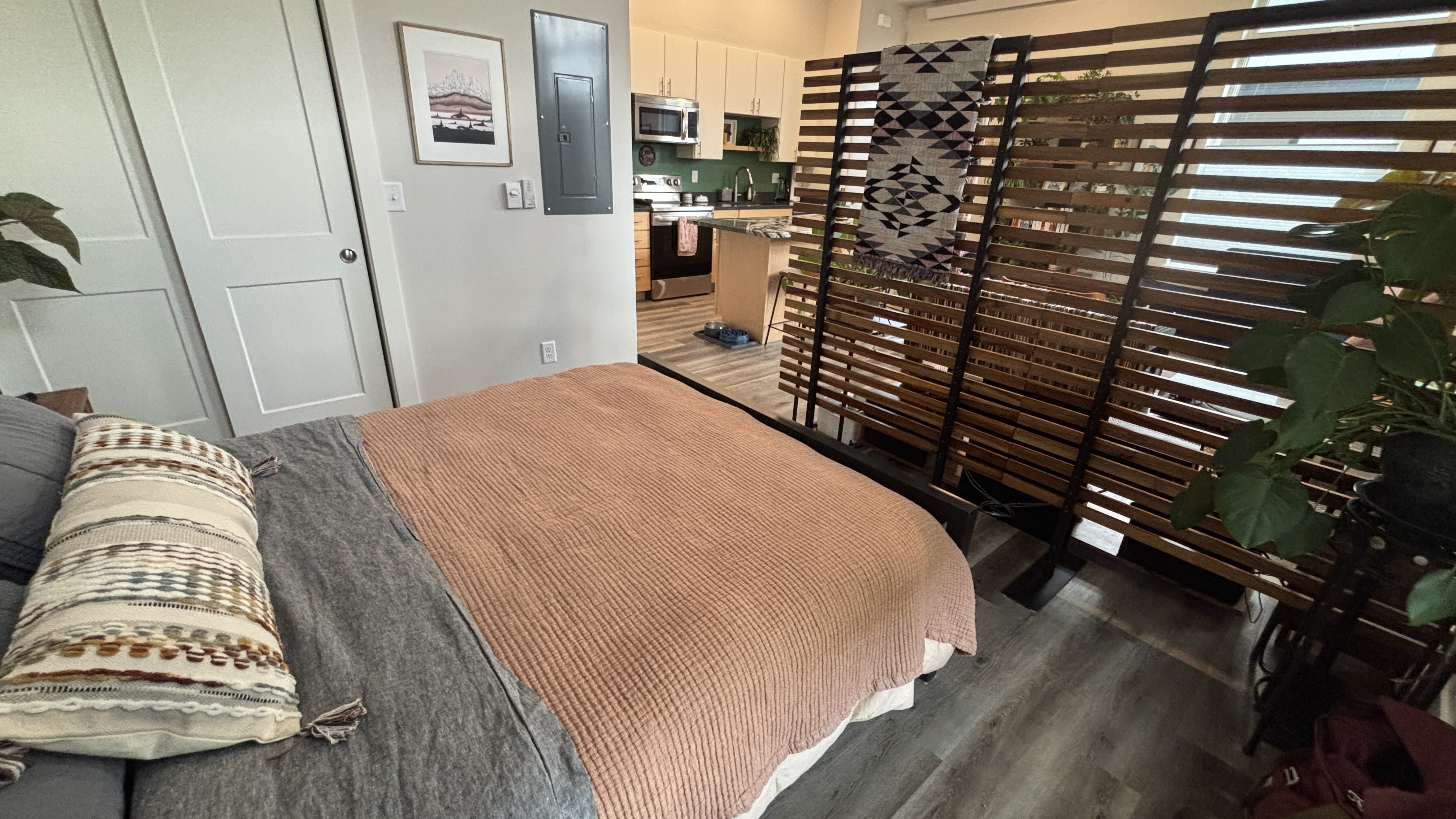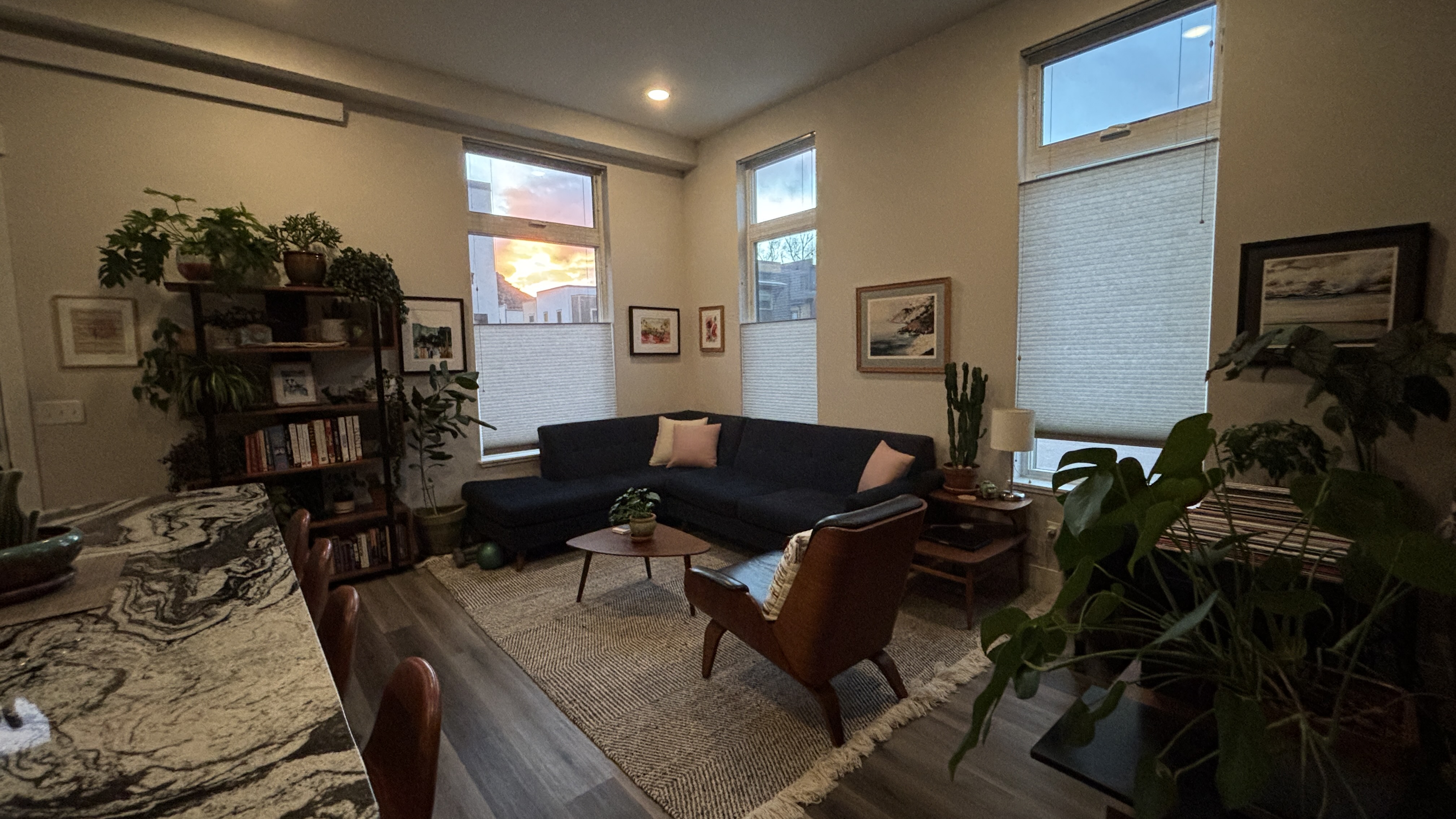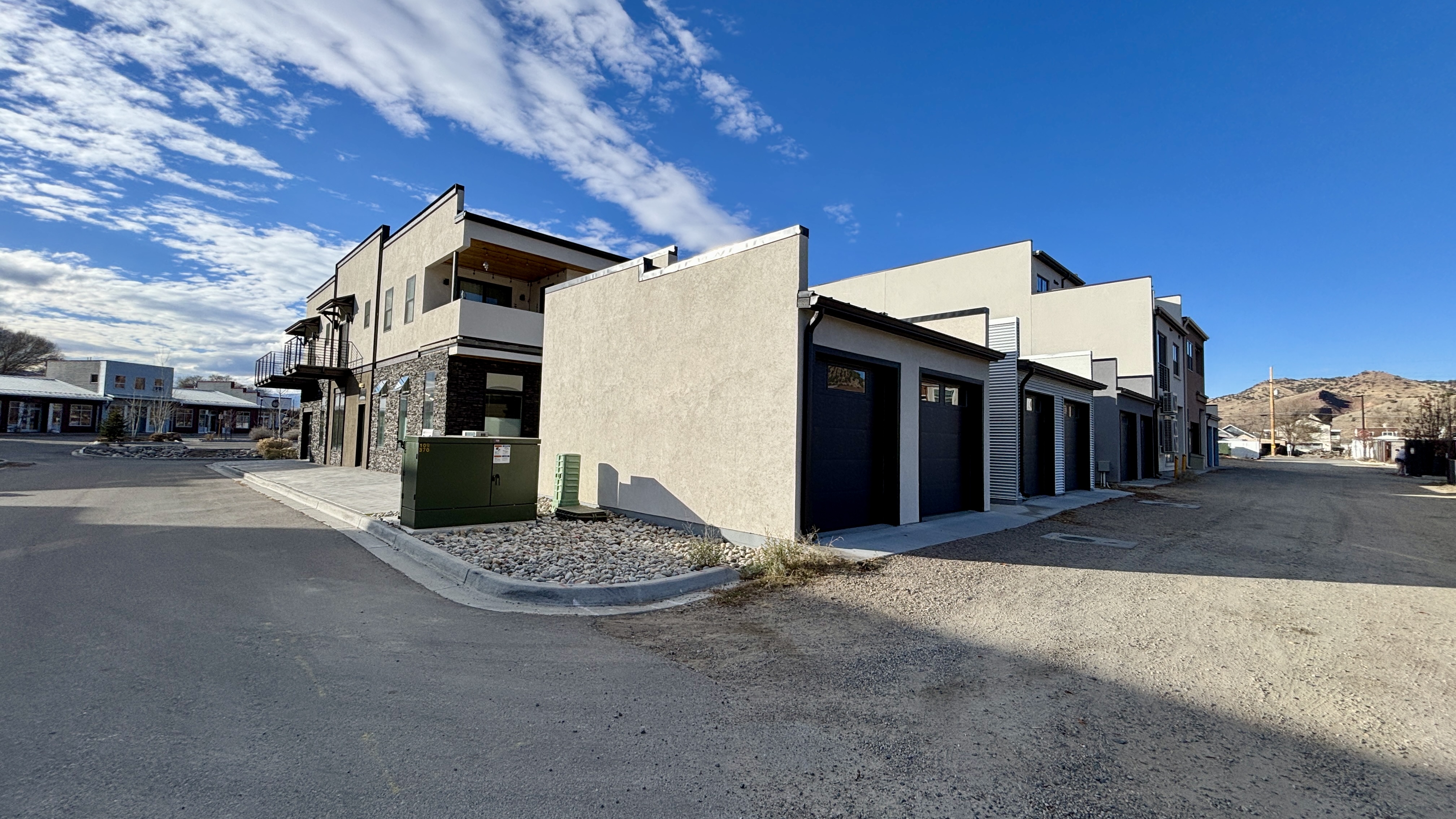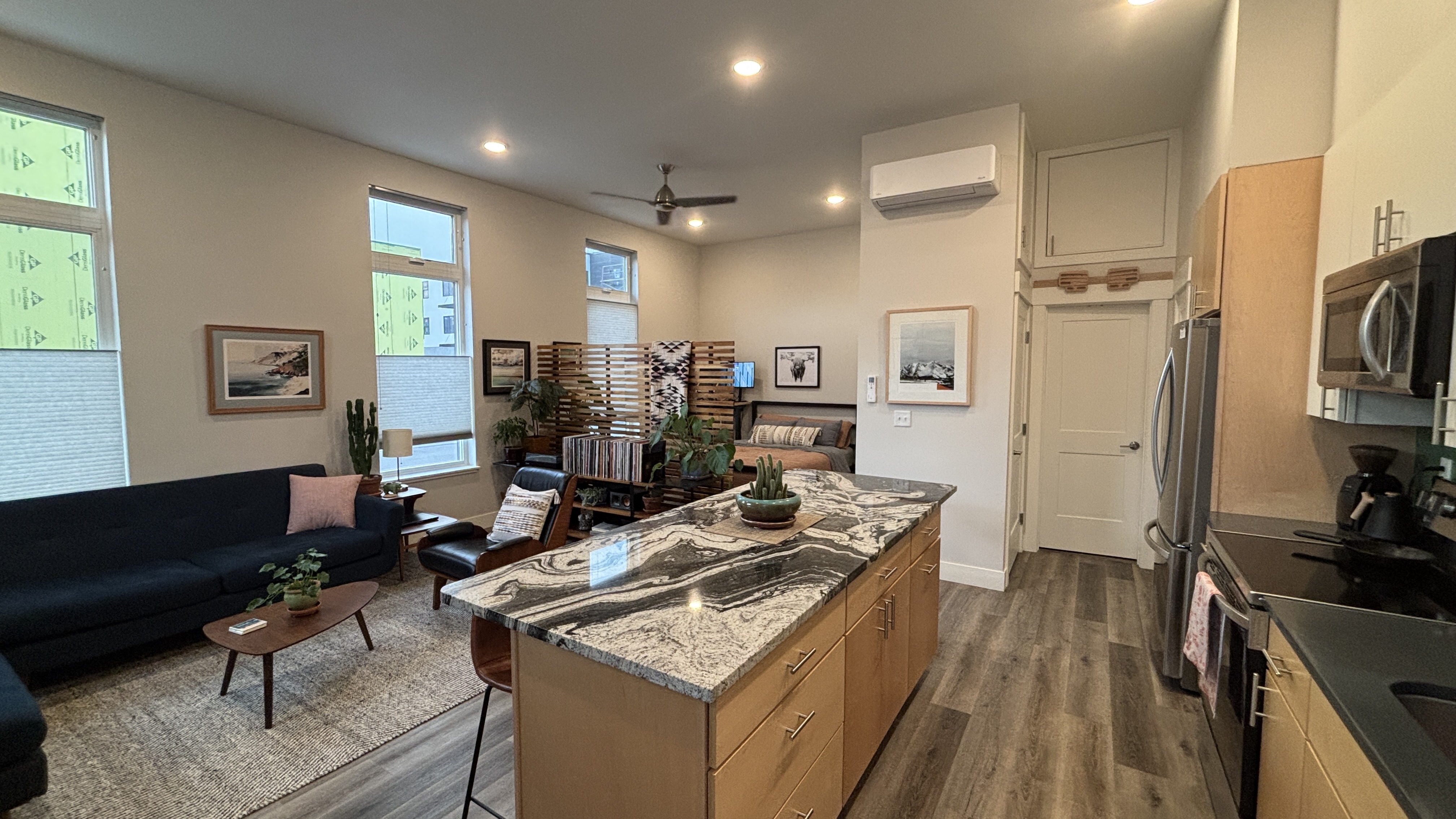 Inside, soaring 11-foot ceilings and expansive floor-to-ceiling windows create a bright and open atmosphere. The living area blends into the open kitchen providing inviting space for company. Lighting can be controlled to perfection with overhead LEDs on dimmer switches. Thoughtful design provides a dedicated bedroom area with closet, overhead storage, and in-unit laundry (stackable LG washer/dryer included). The bathroom has a walk-in shower with a beautifully tiled surround, designer wallpaper, and premium Benjamin Moore paint. The kitchen features modern slab-front cabinetry with white uppers, maple lowers, and quartz countertops. A striking granite topped island doubles as both dining space and extra storage. The exterior features industrial-modern architecture with a low-maintenance stucco, stone, and custom structural steel. This unit is steps from Silver Whisker Bakery, Liberty Hall Cocktail Bar, Mojos Eatery, and Kim’s Gym with more amenities to come!