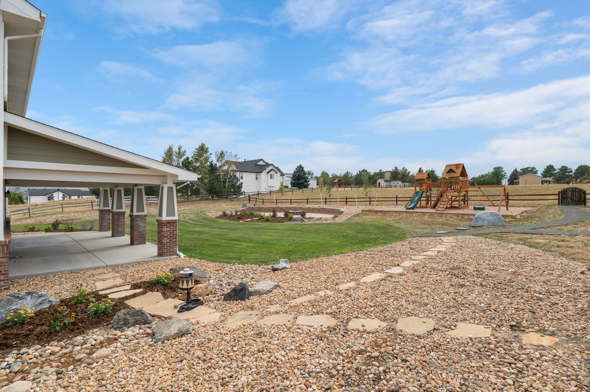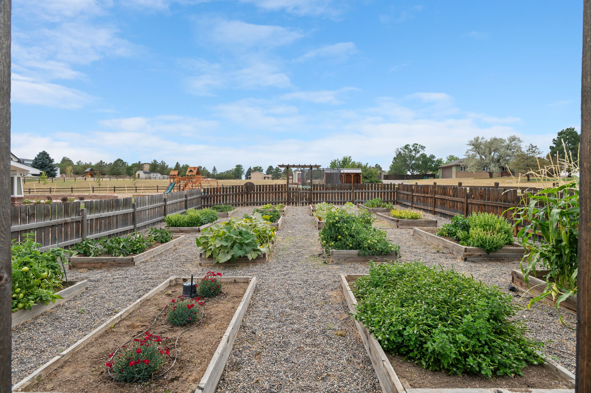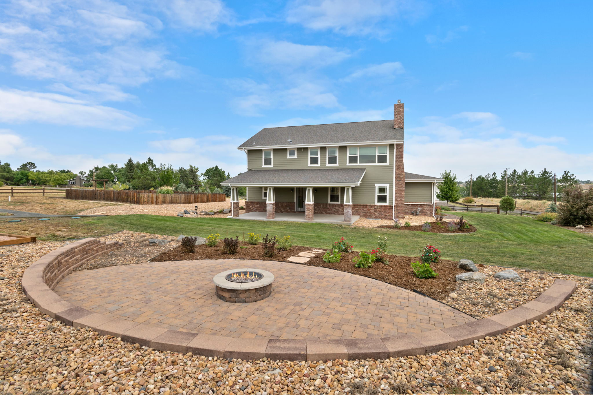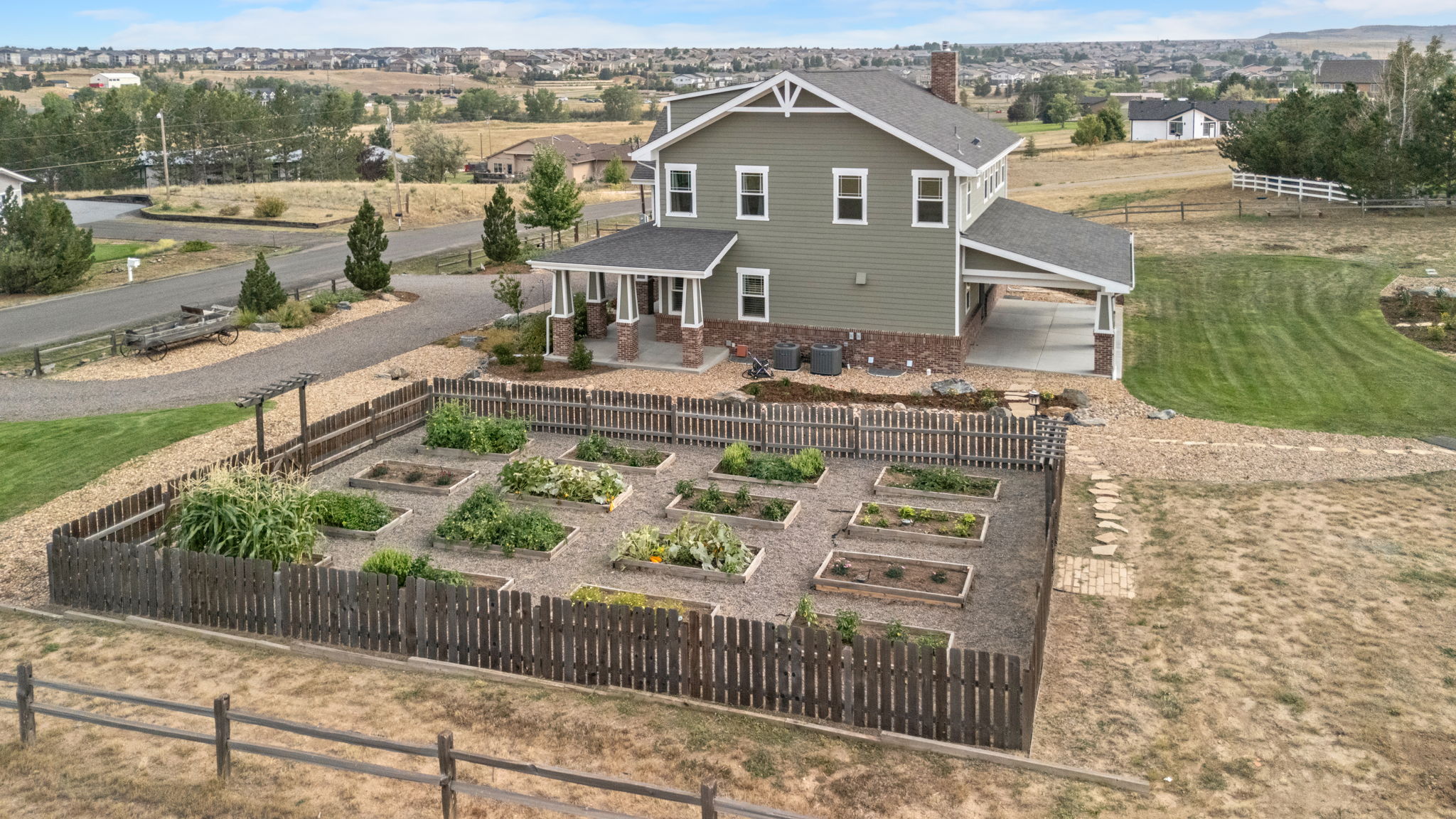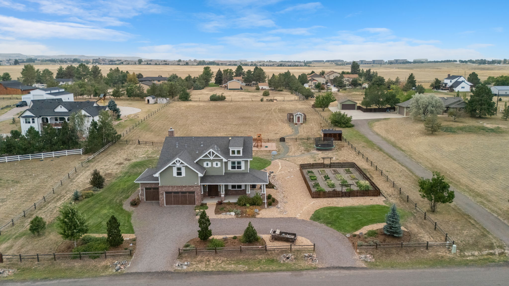 Truly extraordinary farmhouse-style two-story custom home on 2 acres in Parker featuring west-facing property on beautifully landscaped flat lot with native shrubs and flowers. Beyond alder wood front door, discover arched doorways and gleaming espresso-stained oak hardwood floors with walnut inlay, plus millwork that rivals high-end residences. Gourmet kitchen boasts coffered ceiling with top-quality white cabinetry, soapstone counters and marble island, luxury Thermador stainless appliances, 48" six-burner commercial range, and built-in column refrigerator and freezer. Interior highlights include 10' ceilings, plantation shutters, 8' doors, family room with wood-burning fireplace, master retreat with coved ceiling and barn door, plus spa-like en-suite with clawfoot tub, glass shower, marble vanity and Kohler fixtures. Three secondary bedrooms upstairs with California Closets, plus two basement bedrooms with 2024 build-out featuring bar with wine cooler and Control4 automation movie theater with surround sound. Energy features include triple-pane windows, spray foam insulation, private well (no water costs), sixteen raised cedar garden beds, clothesline, firewood shed, and chicken coop. Outdoor living includes covered patio and fire pit area with room for outbuildings within fenced 2 acres plus three-car garage. Property offers reduced utilities, lower carbon footprint, and benefits for sustainable luxury living.