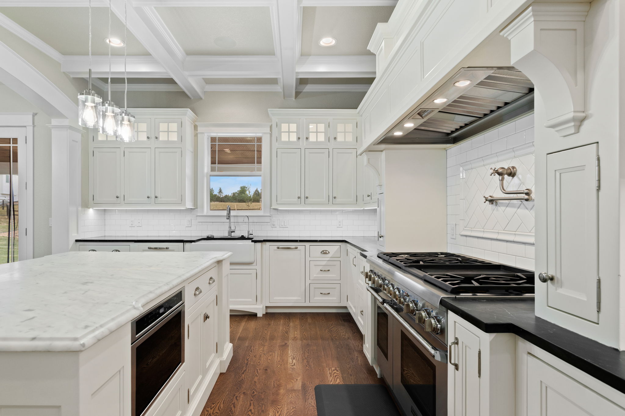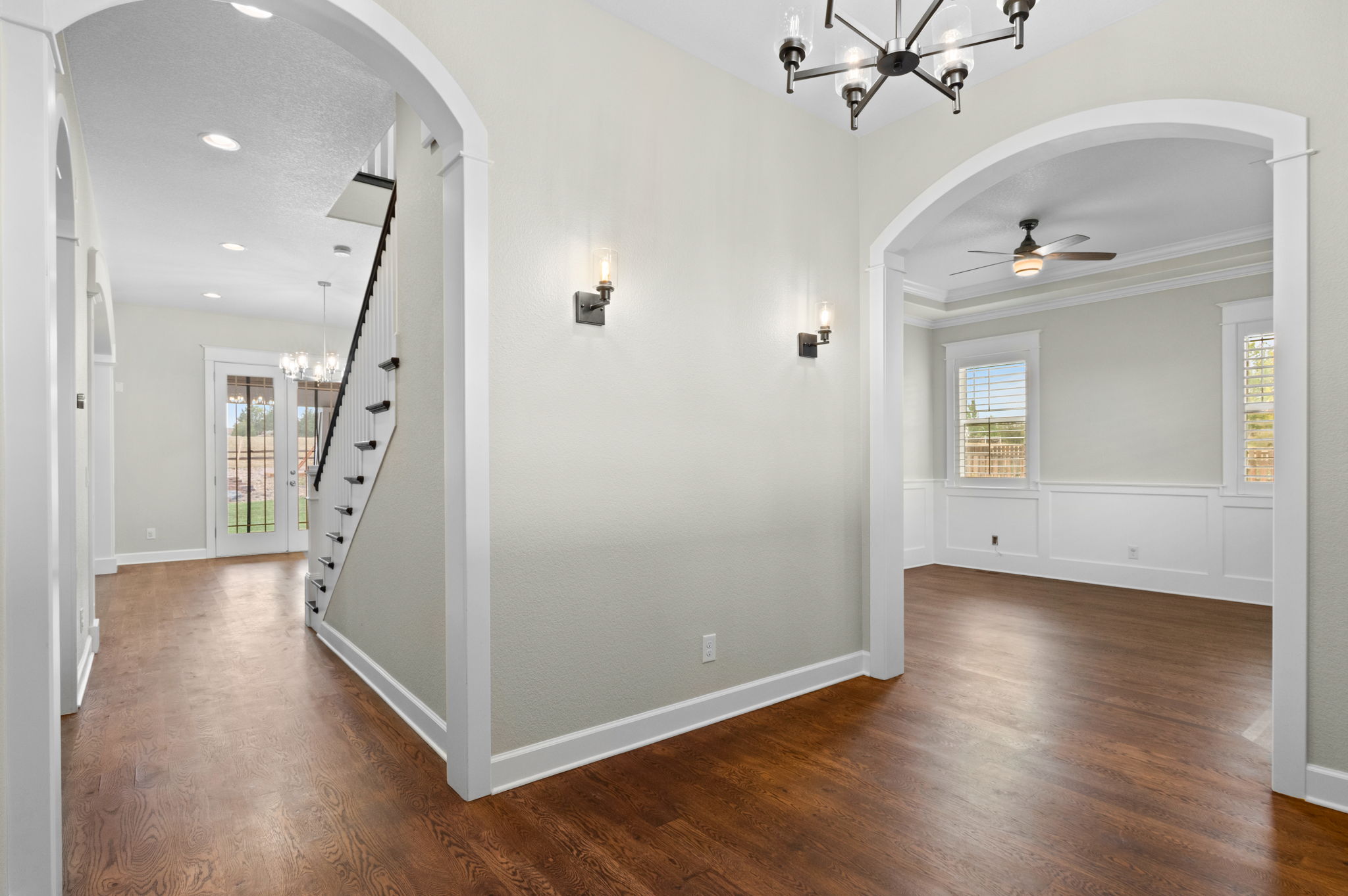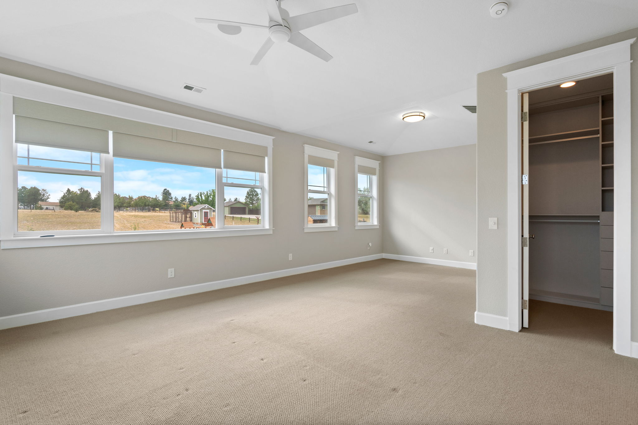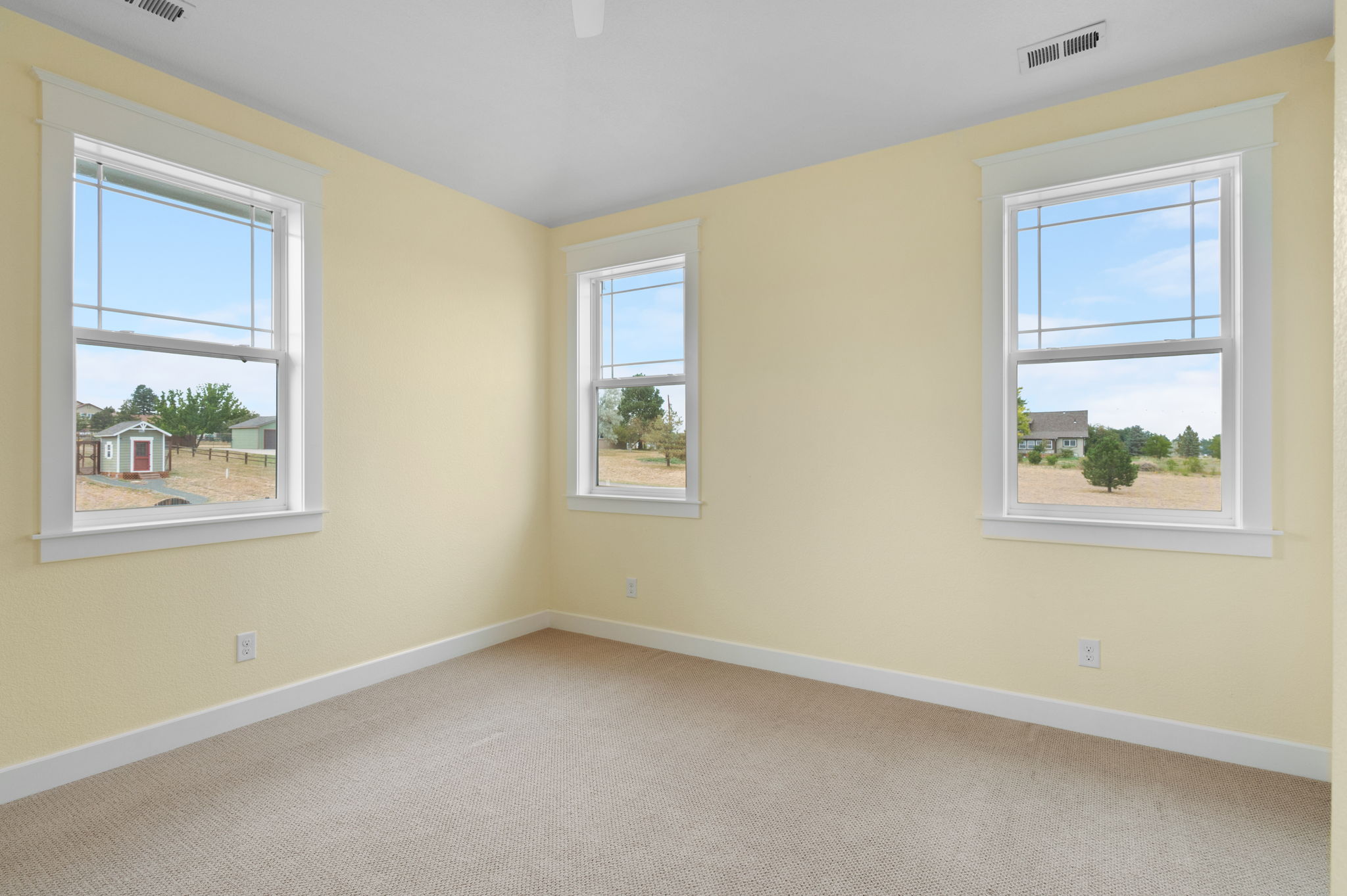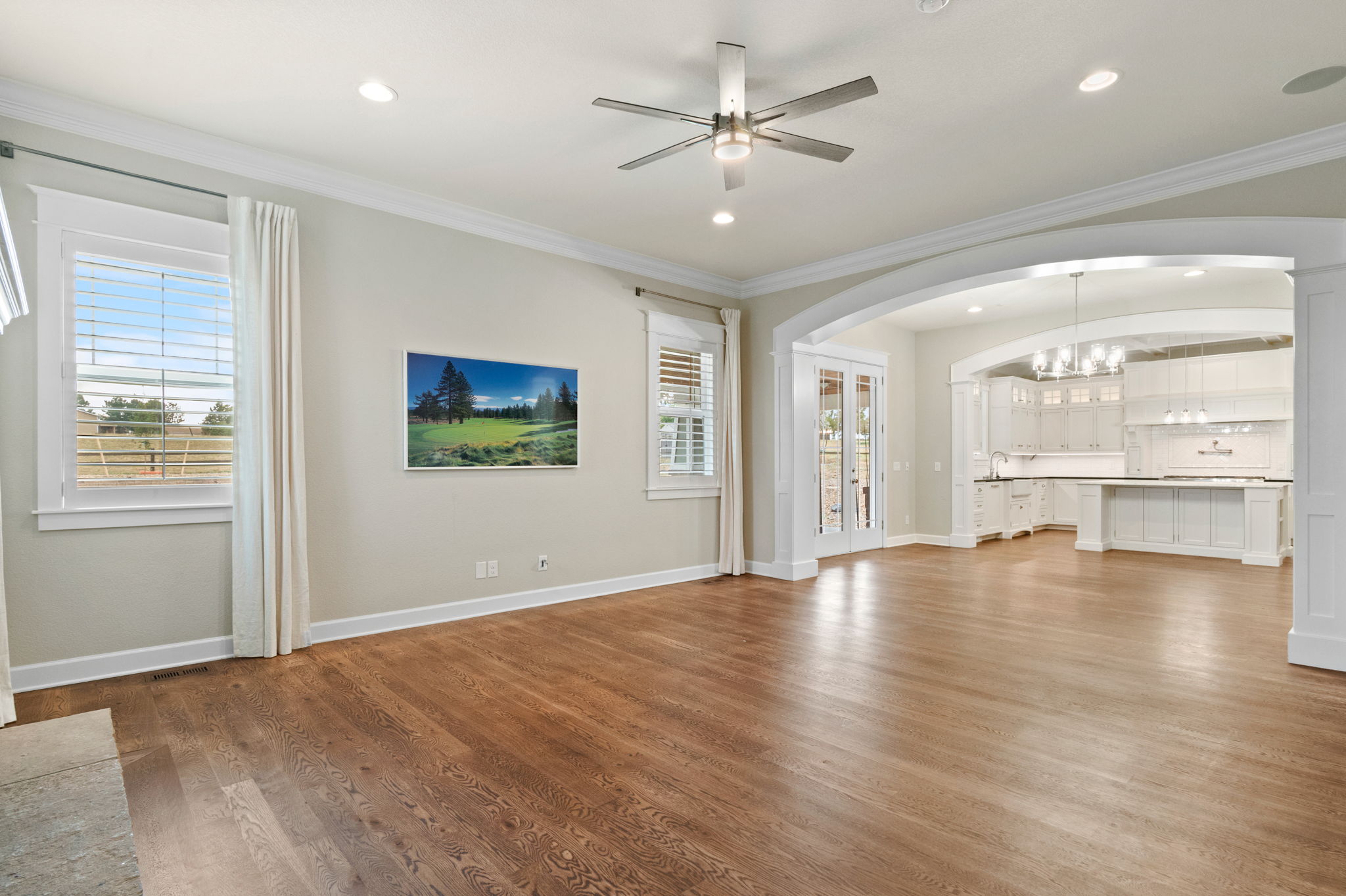Truly extraordinary farmhouse-style two-story custom home on 2 acres in Parker featuring west-facing property on beautifully landscaped flat lot with native shrubs and flowers. Beyond alder wood front door, discover arched doorways and gleaming espresso-stained oak hardwood floors with walnut inlay, plus millwork that rivals high-end residences. Gourmet kitchen boasts coffered ceiling with top-quality white cabinetry, soapstone counters and marble island, luxury Thermador stainless appliances, 48" six-burner commercial range, and built-in column refrigerator and freezer. Interior highlights include 10' ceilings, plantation shutters, 8' doors, family room with wood-burning fireplace, master retreat with coved ceiling and barn door, plus spa-like en-suite with clawfoot tub, glass shower, marble vanity and Kohler fixtures. Three secondary bedrooms upstairs with California Closets, plus two basement bedrooms with 2024 build-out featuring bar with wine cooler and Control4 automation movie theater with surround sound. Energy features include triple-pane windows, spray foam insulation, private well (no water costs), sixteen raised cedar garden beds, clothesline, firewood shed, and chicken coop. Outdoor living includes covered patio and fire pit area with room for outbuildings within fenced 2 acres plus three-car garage. Property offers reduced utilities, lower carbon footprint, and benefits for sustainable luxury living.