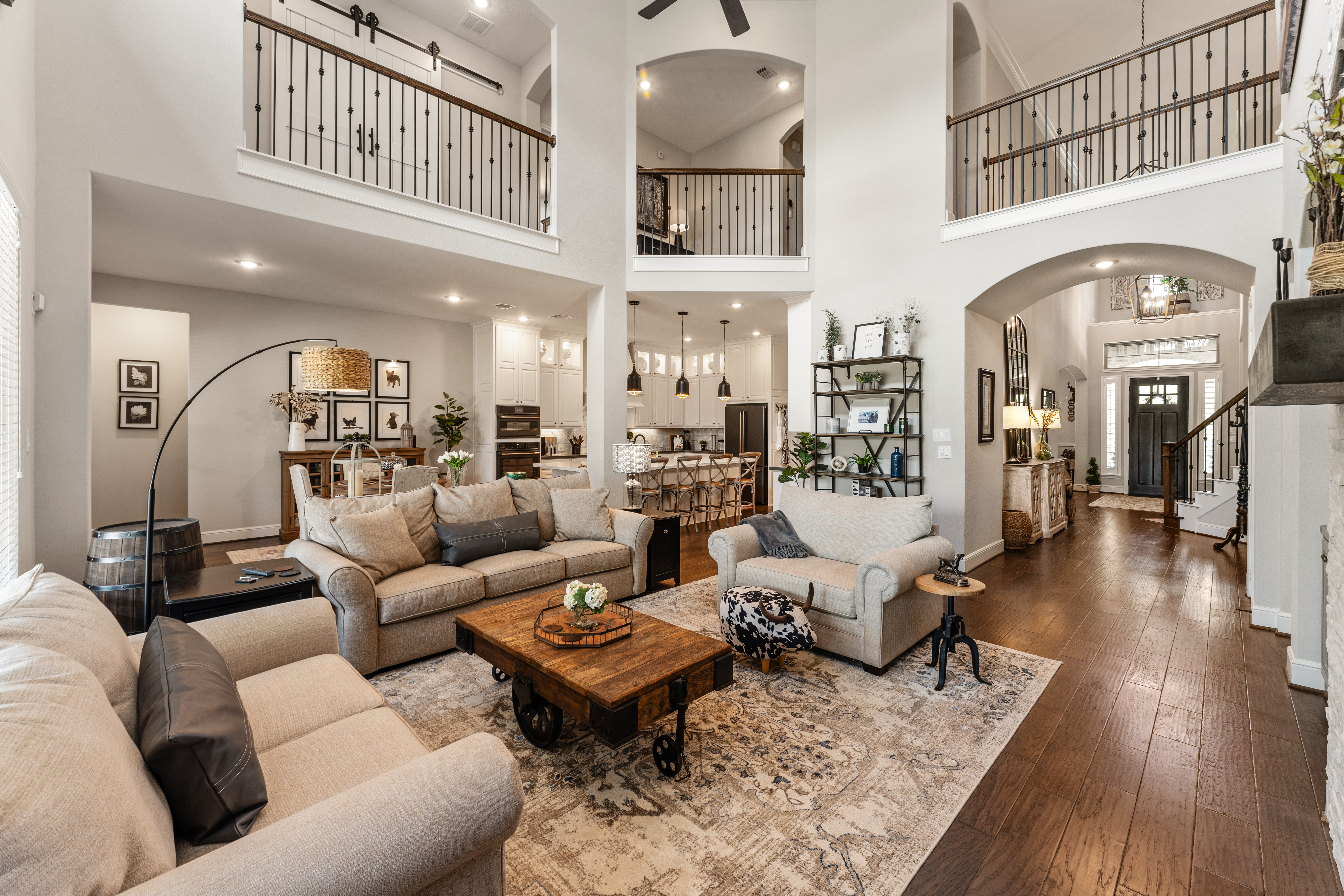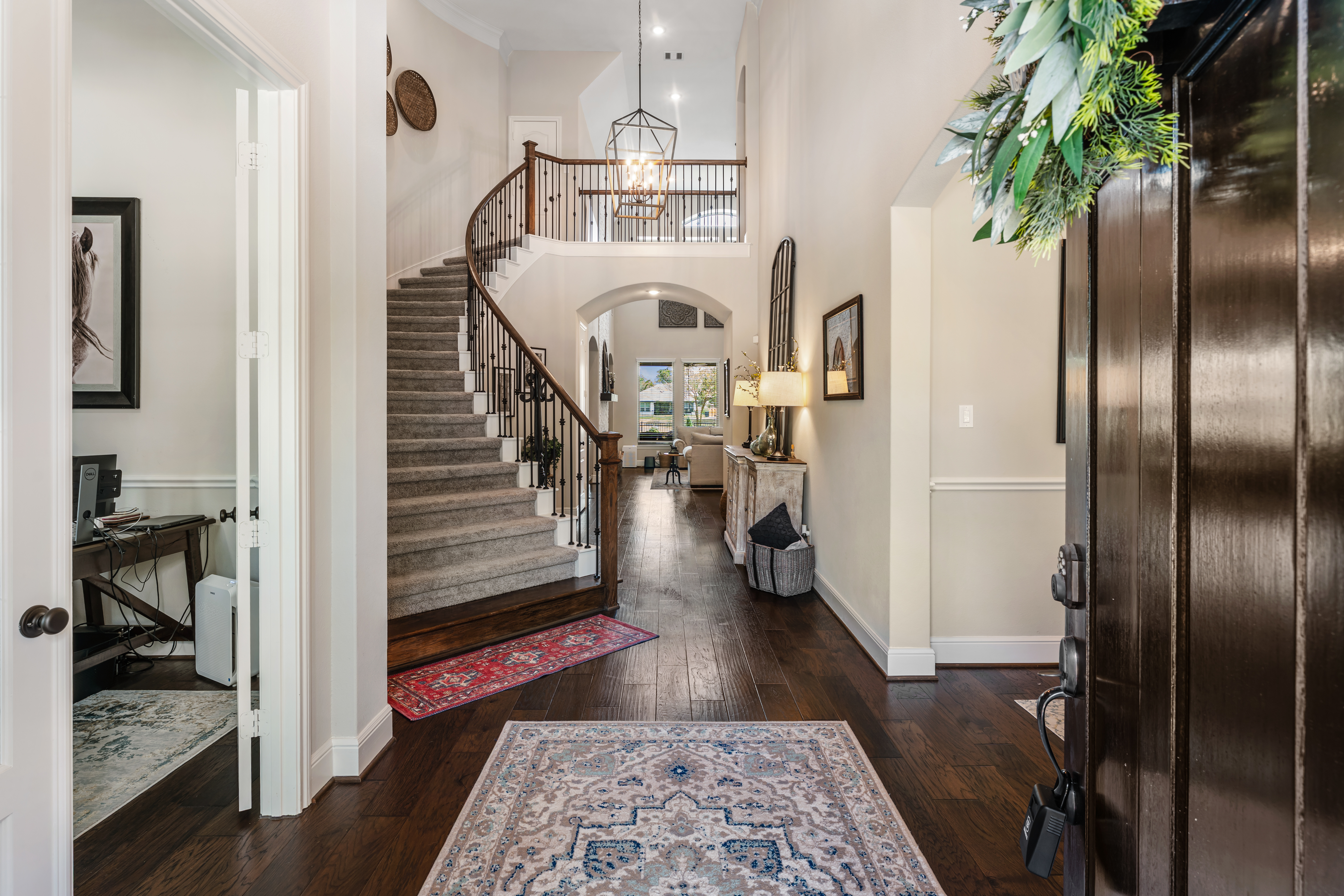 Grand foyer with soaring 21’ ceilings and sweeping staircase