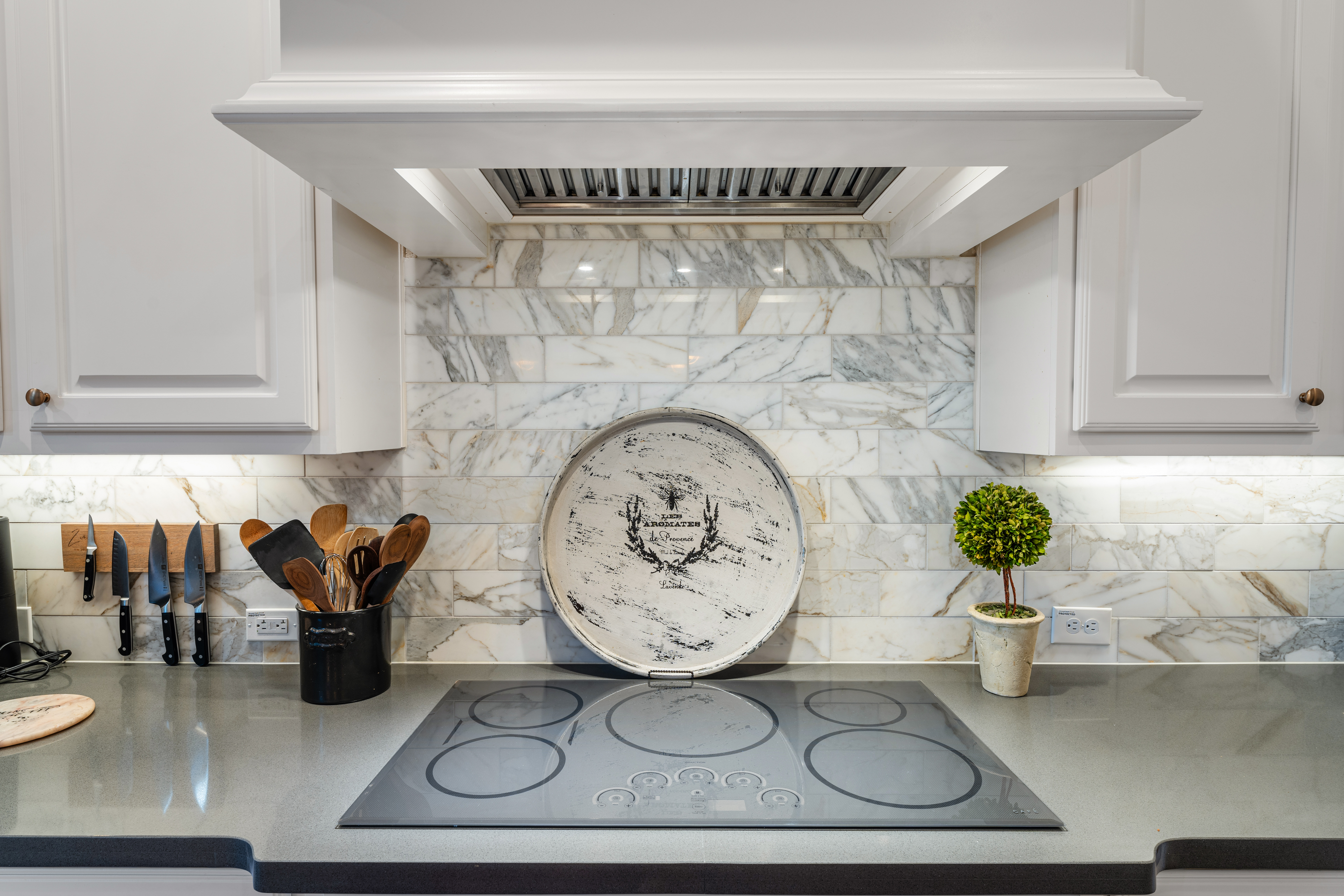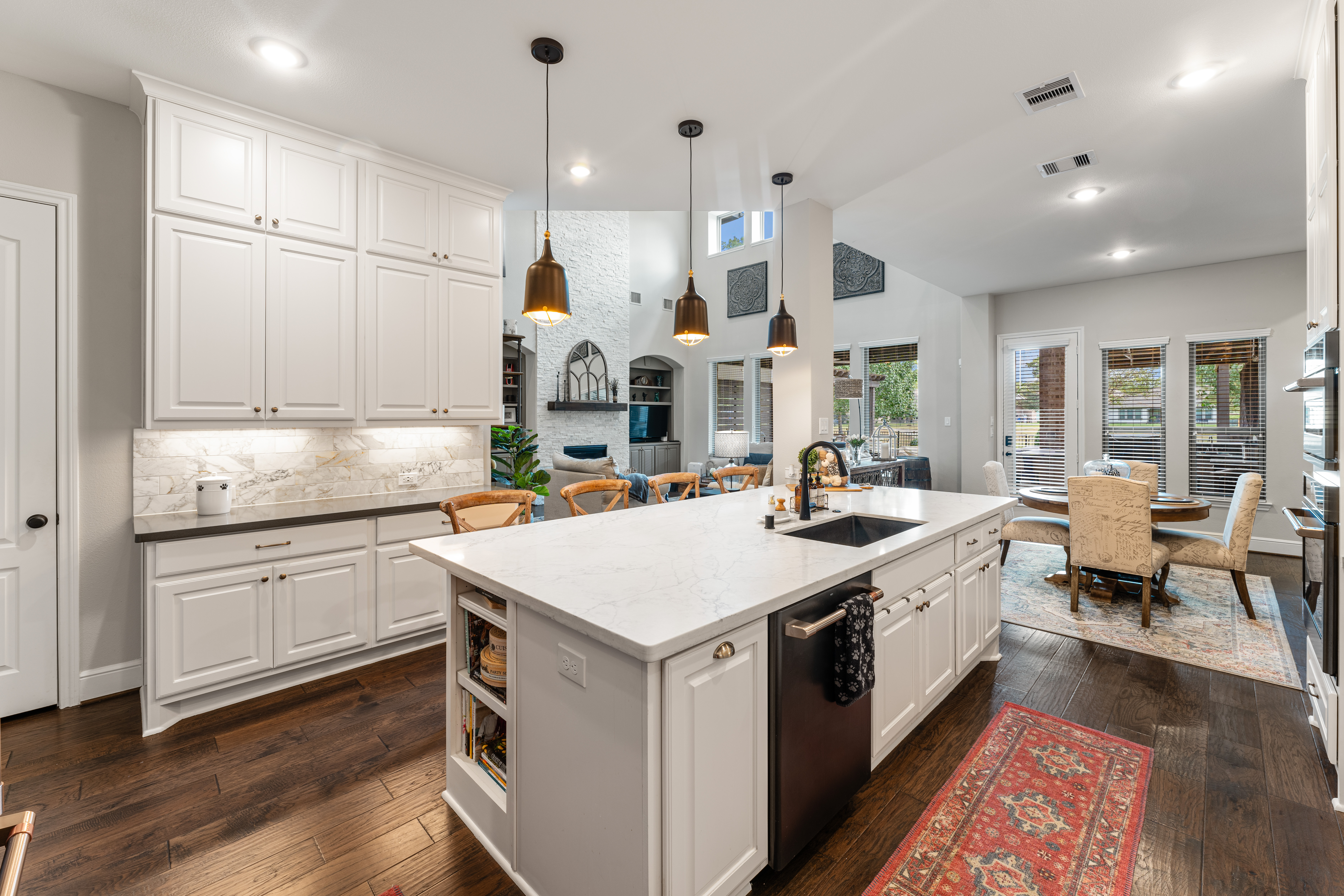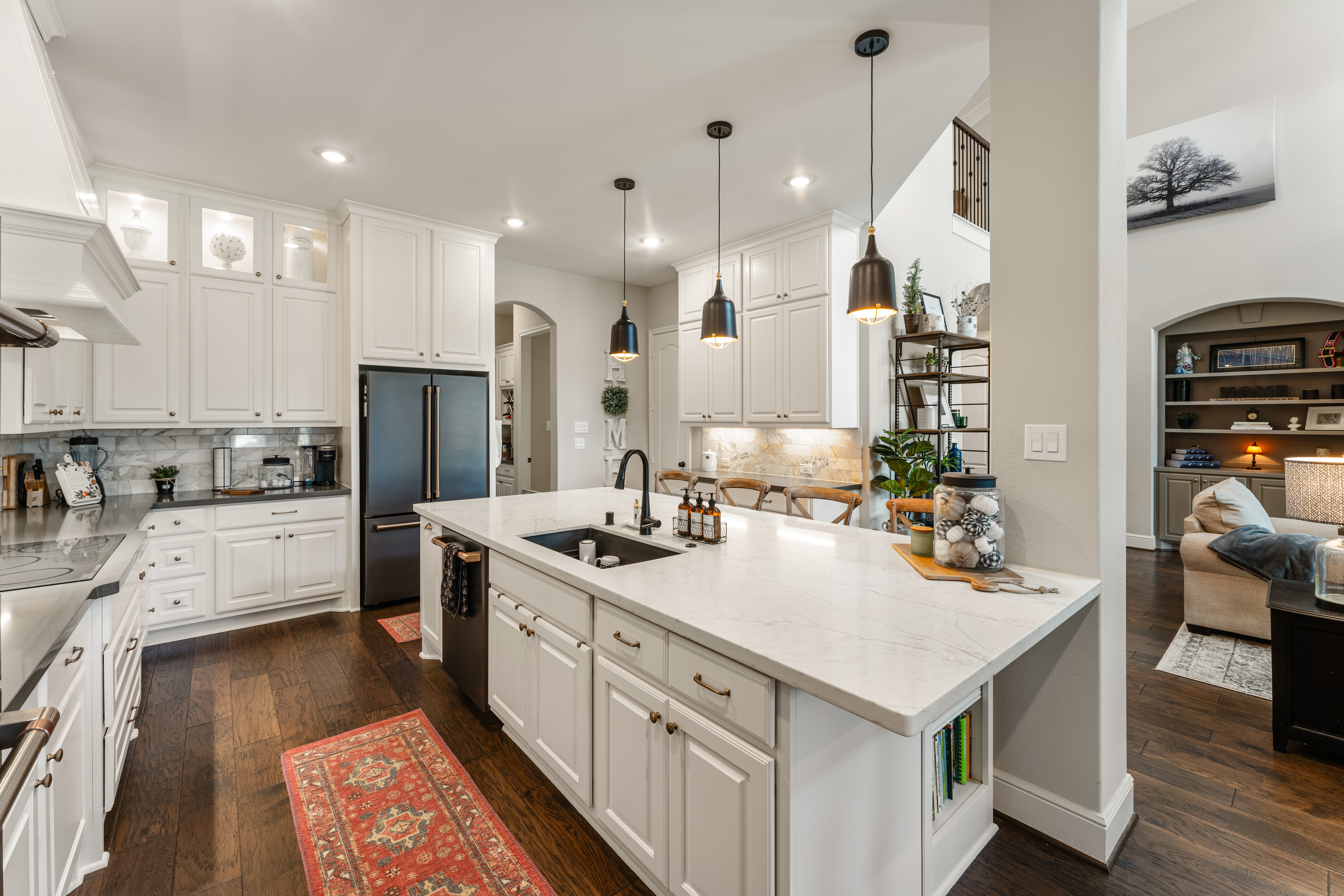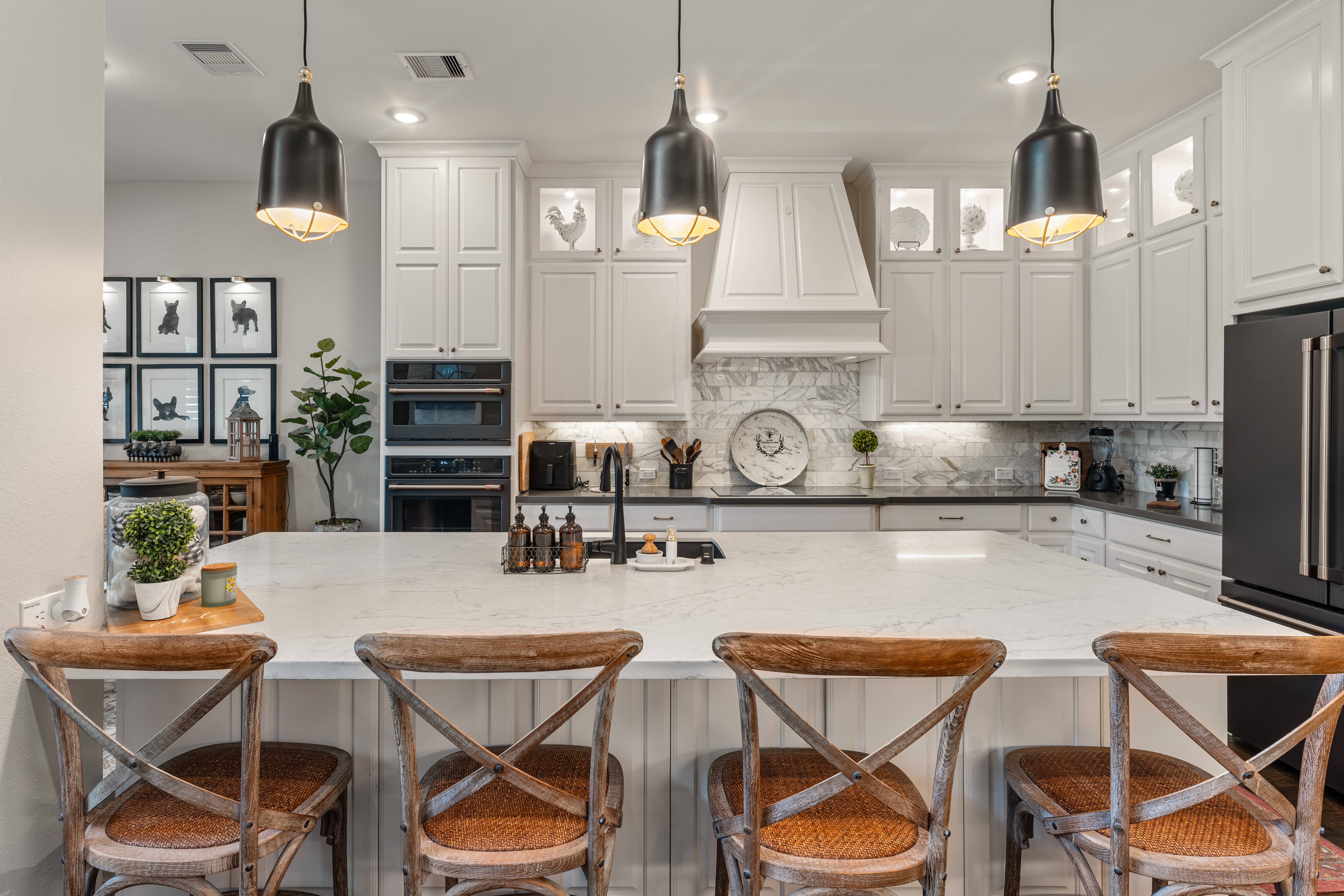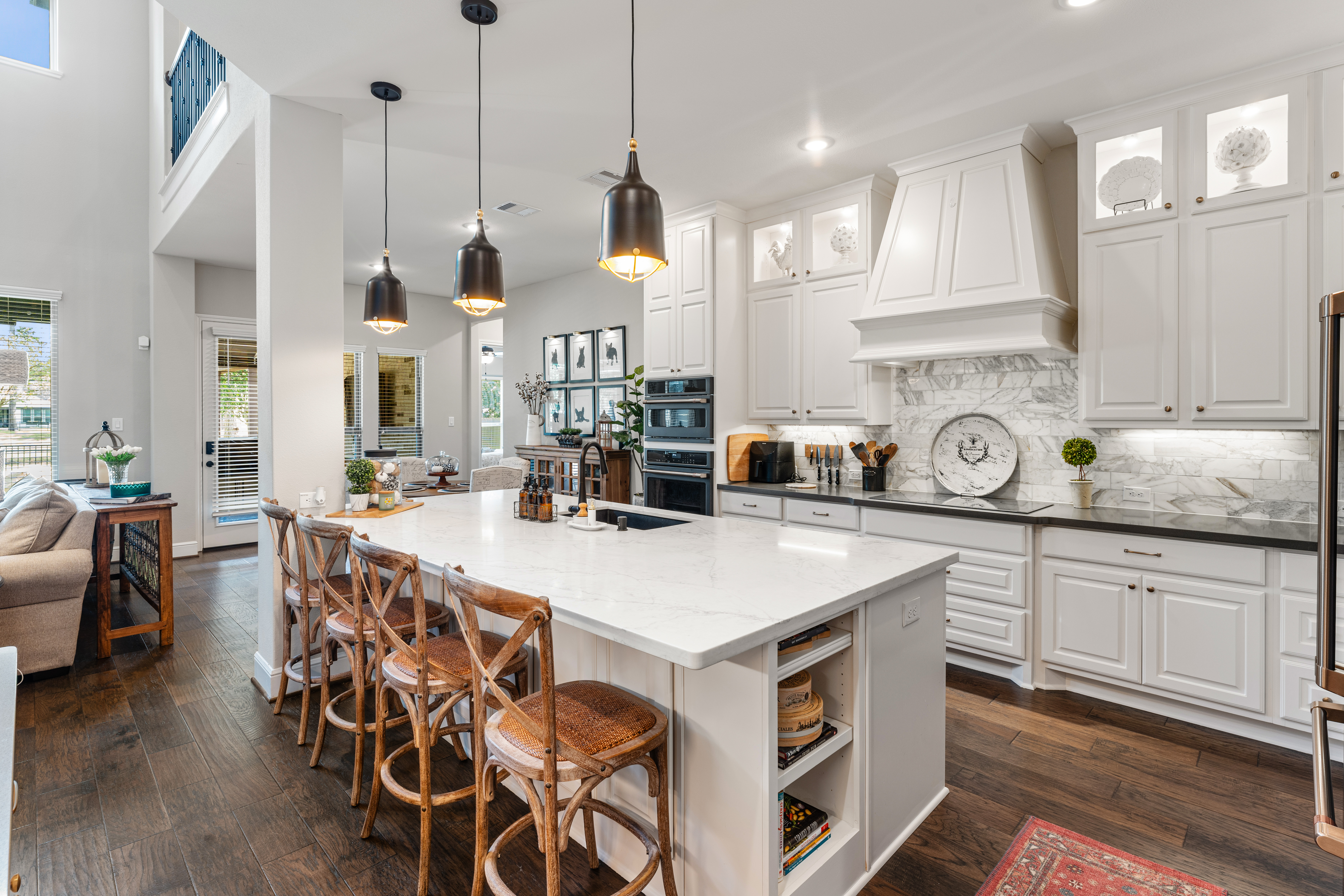 Entertainer’s kitchen featuring floor-to-ceiling cabinets, quartz counters, oversized island (5x10’), GE Café matte black appliances with champagne bronze hardware, butler’s pantry, large pantry, and under/upper cabinet lighting