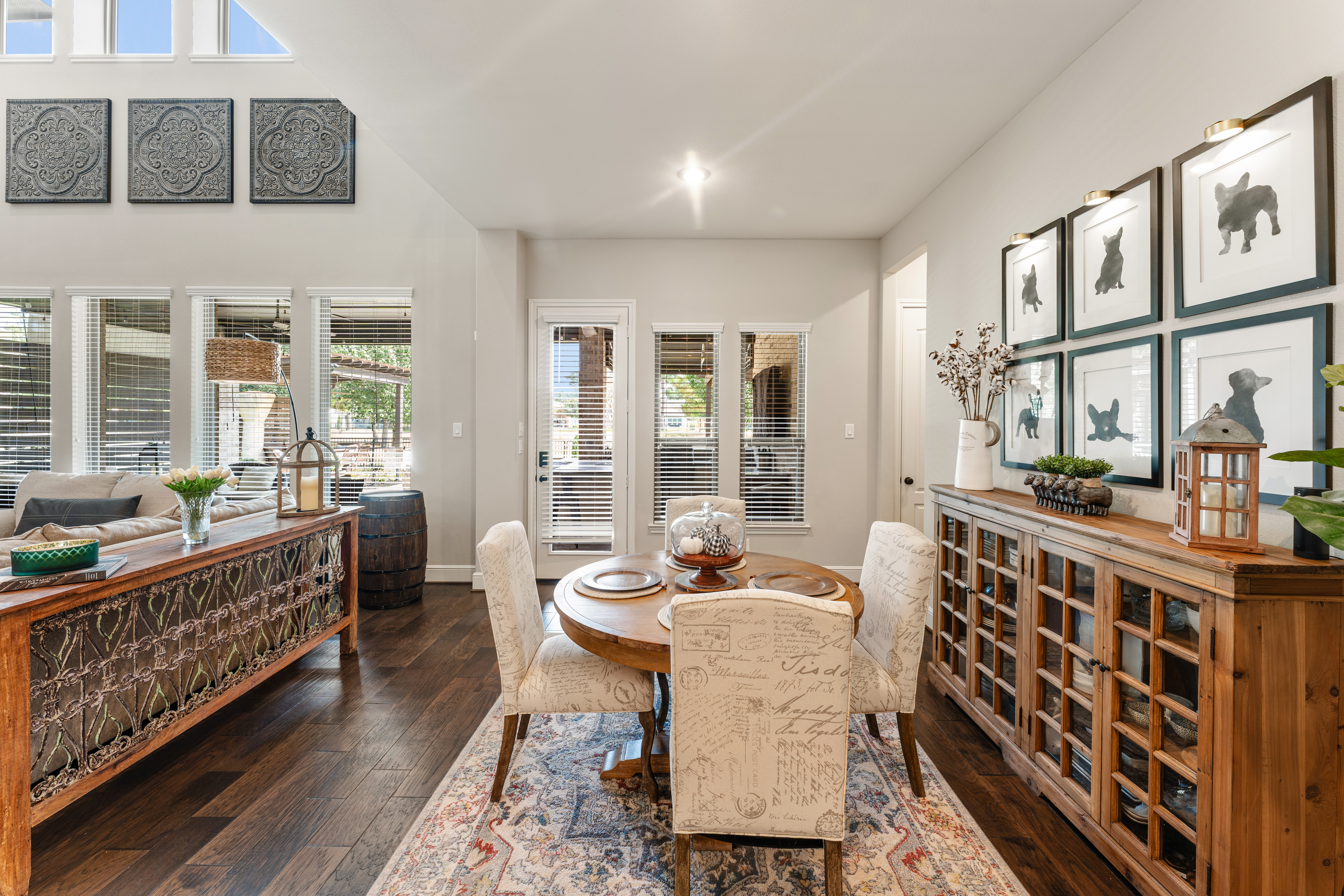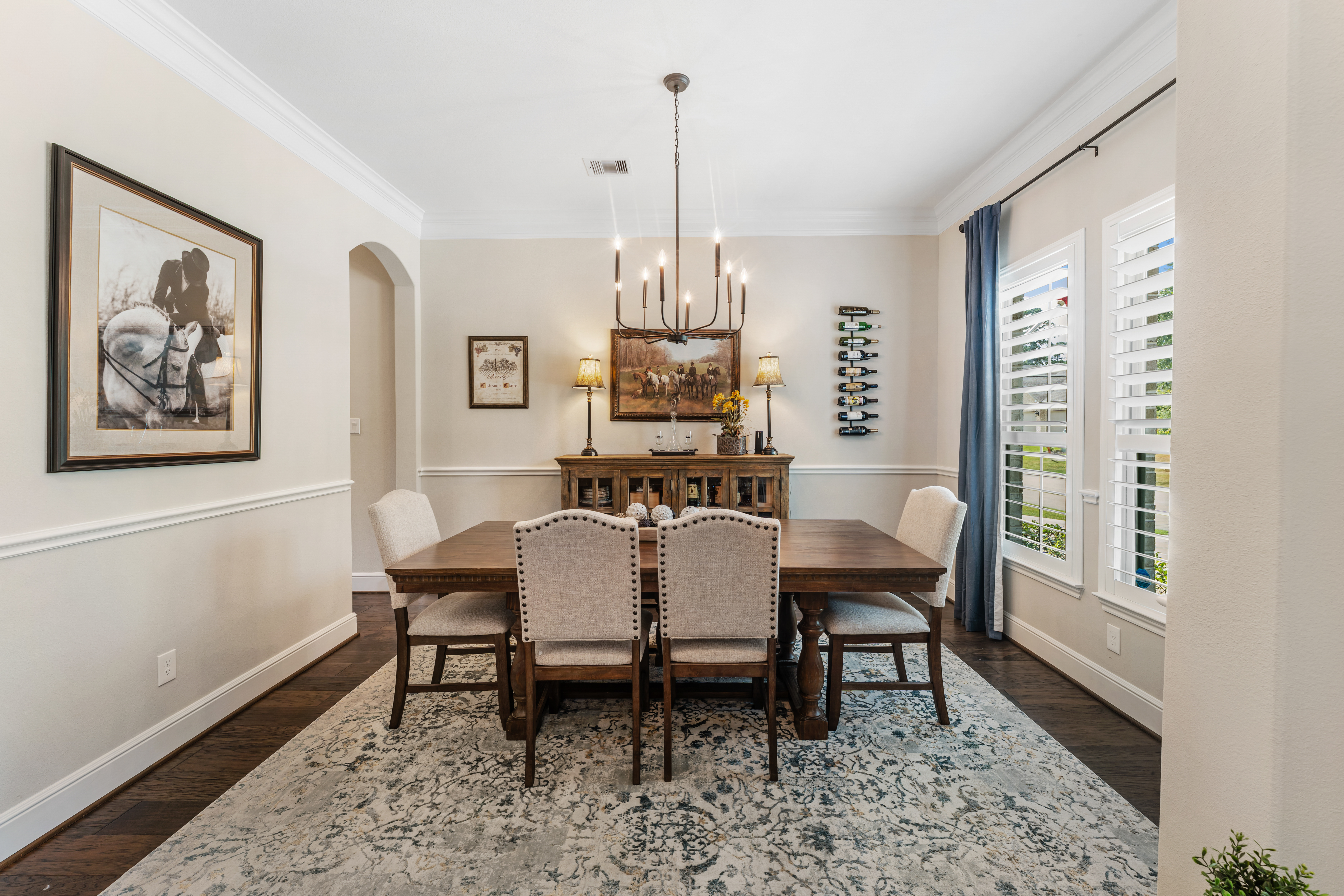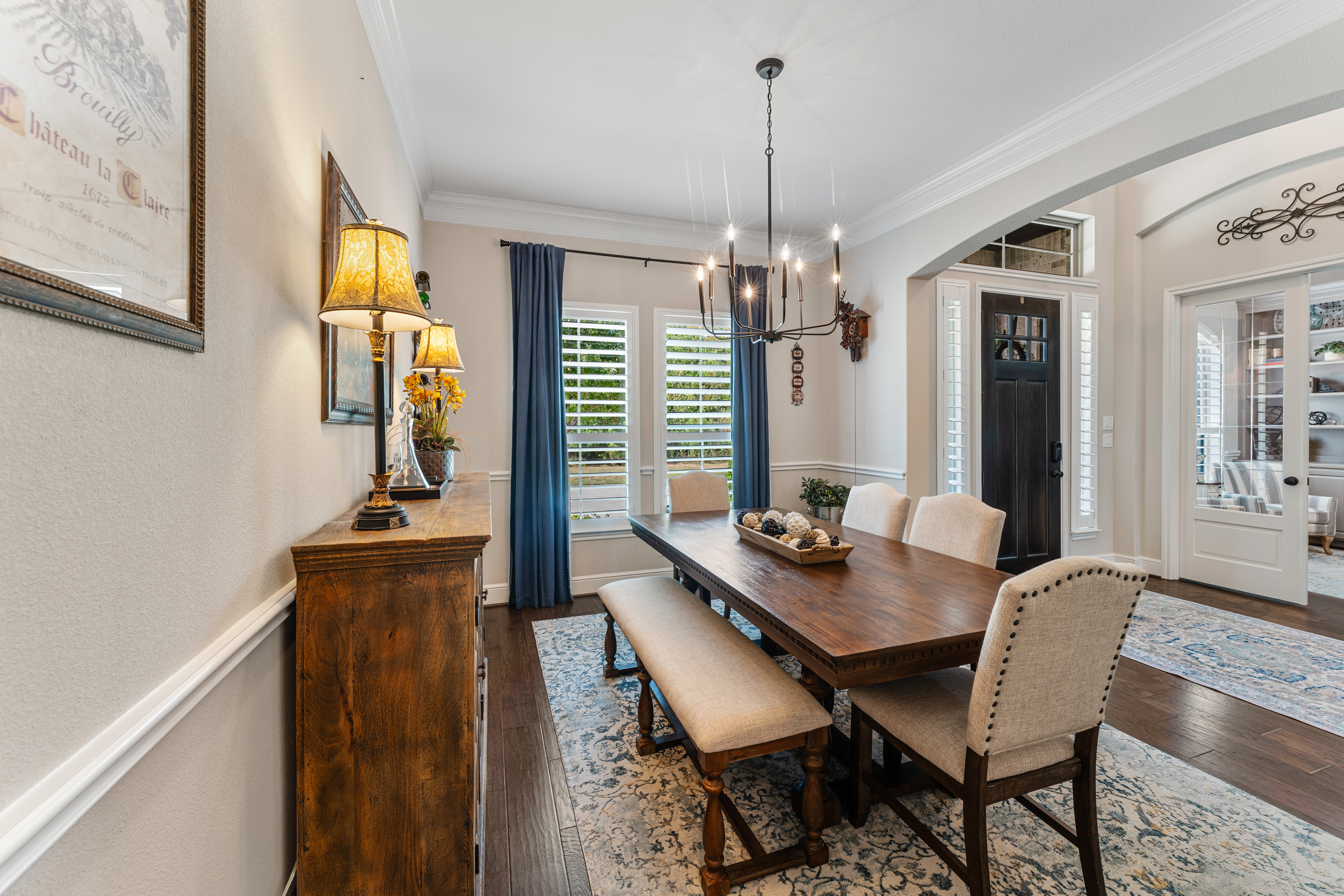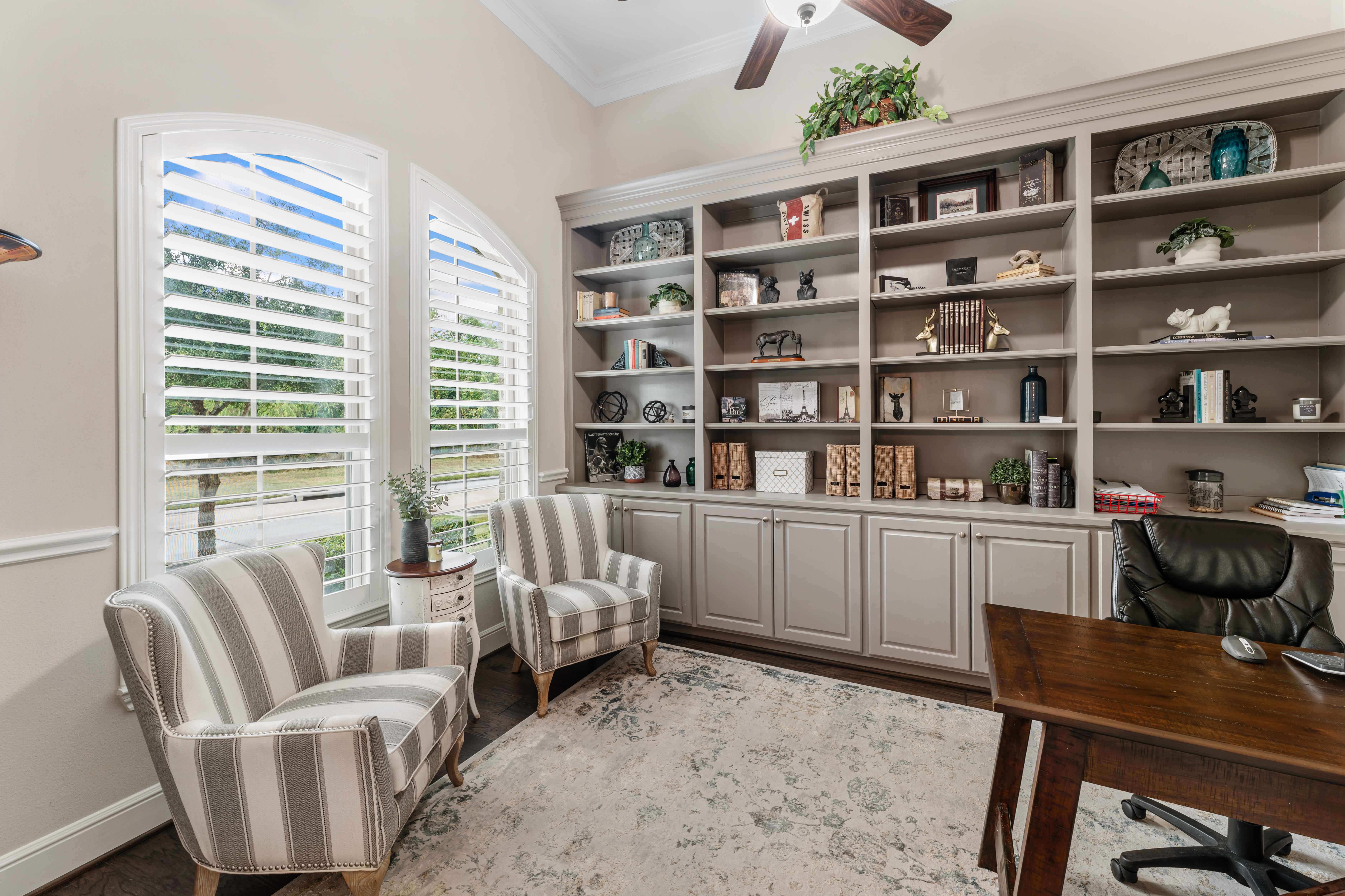 Formal dining room and dedicated home office with 12’ ceilings and custom built-ins