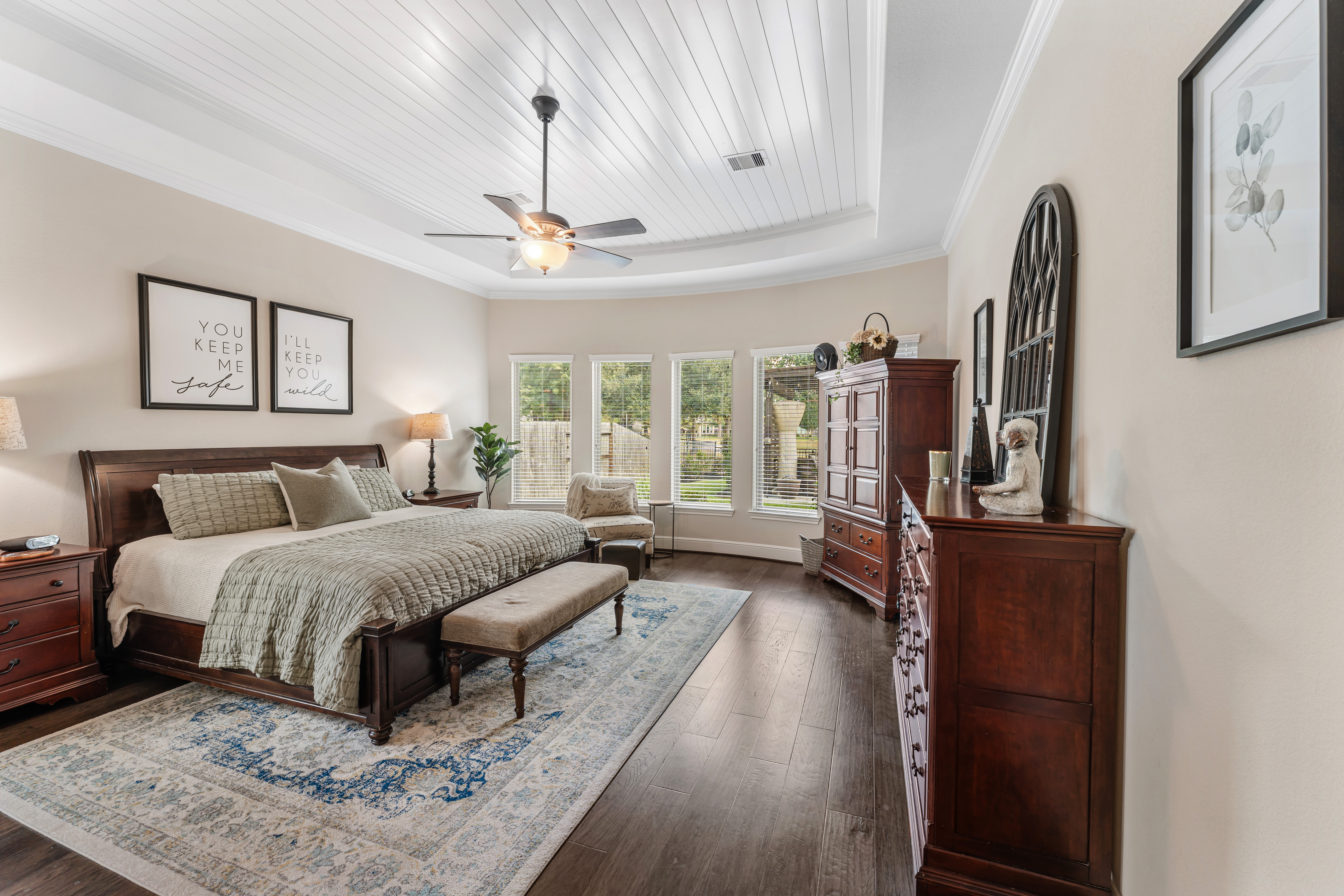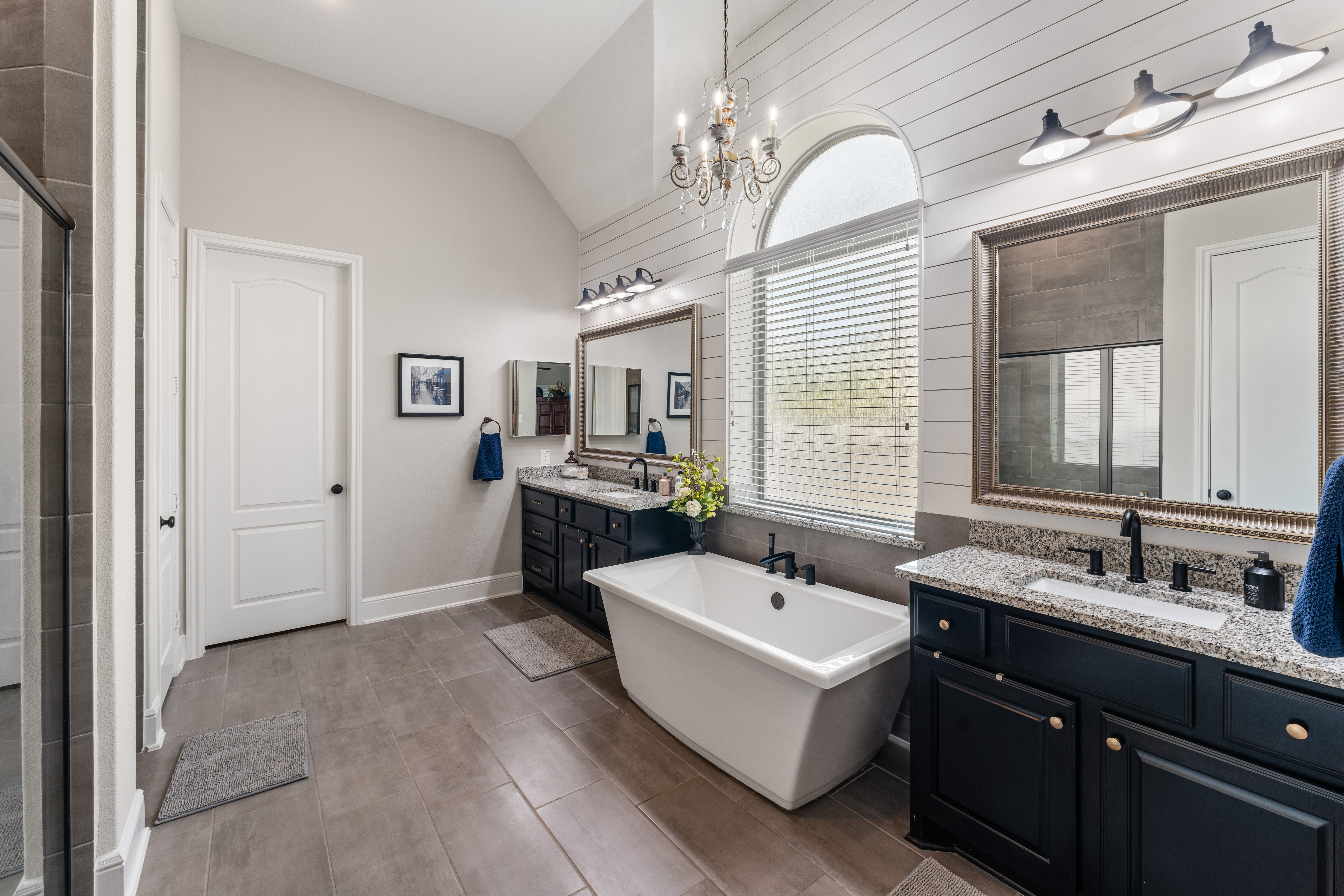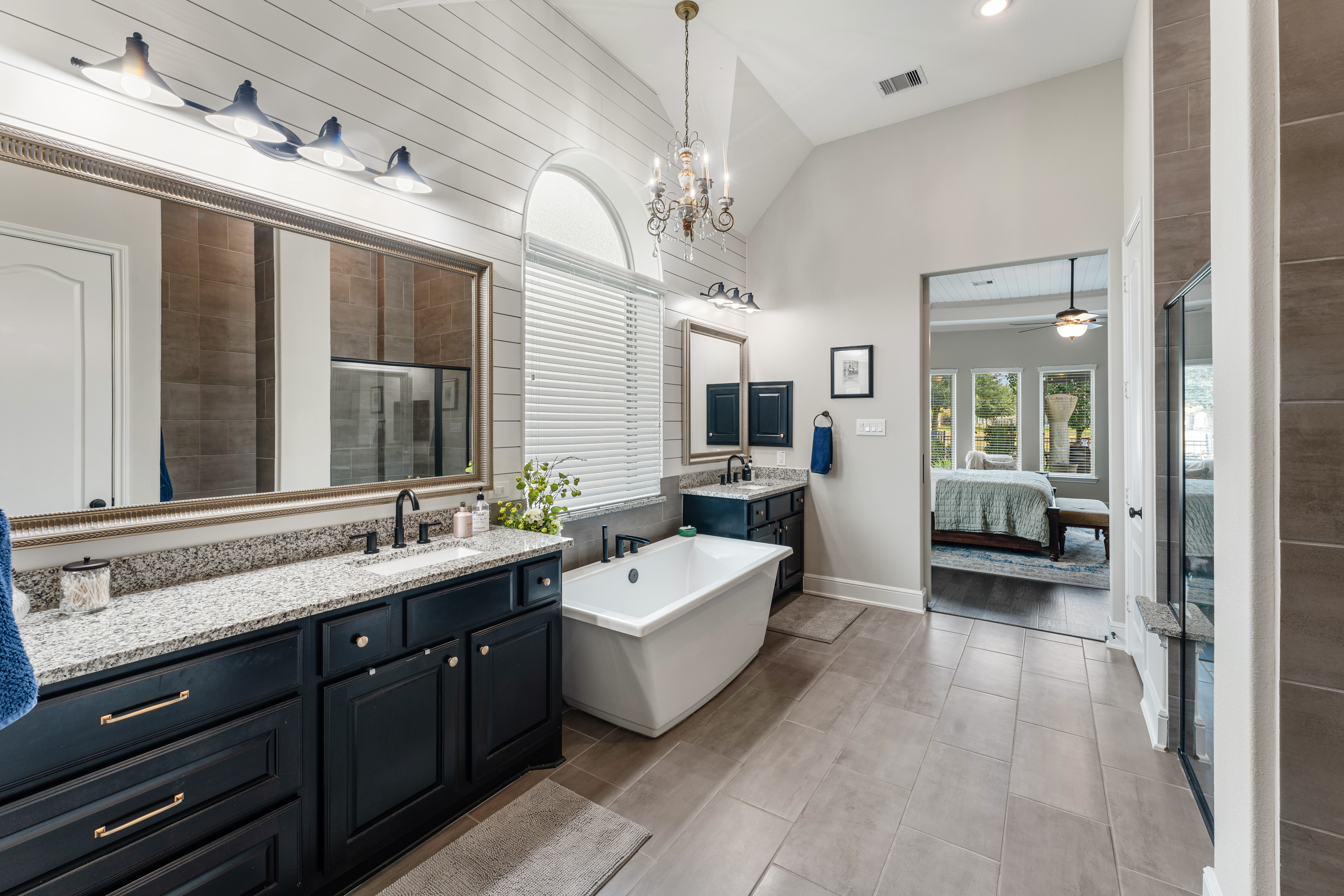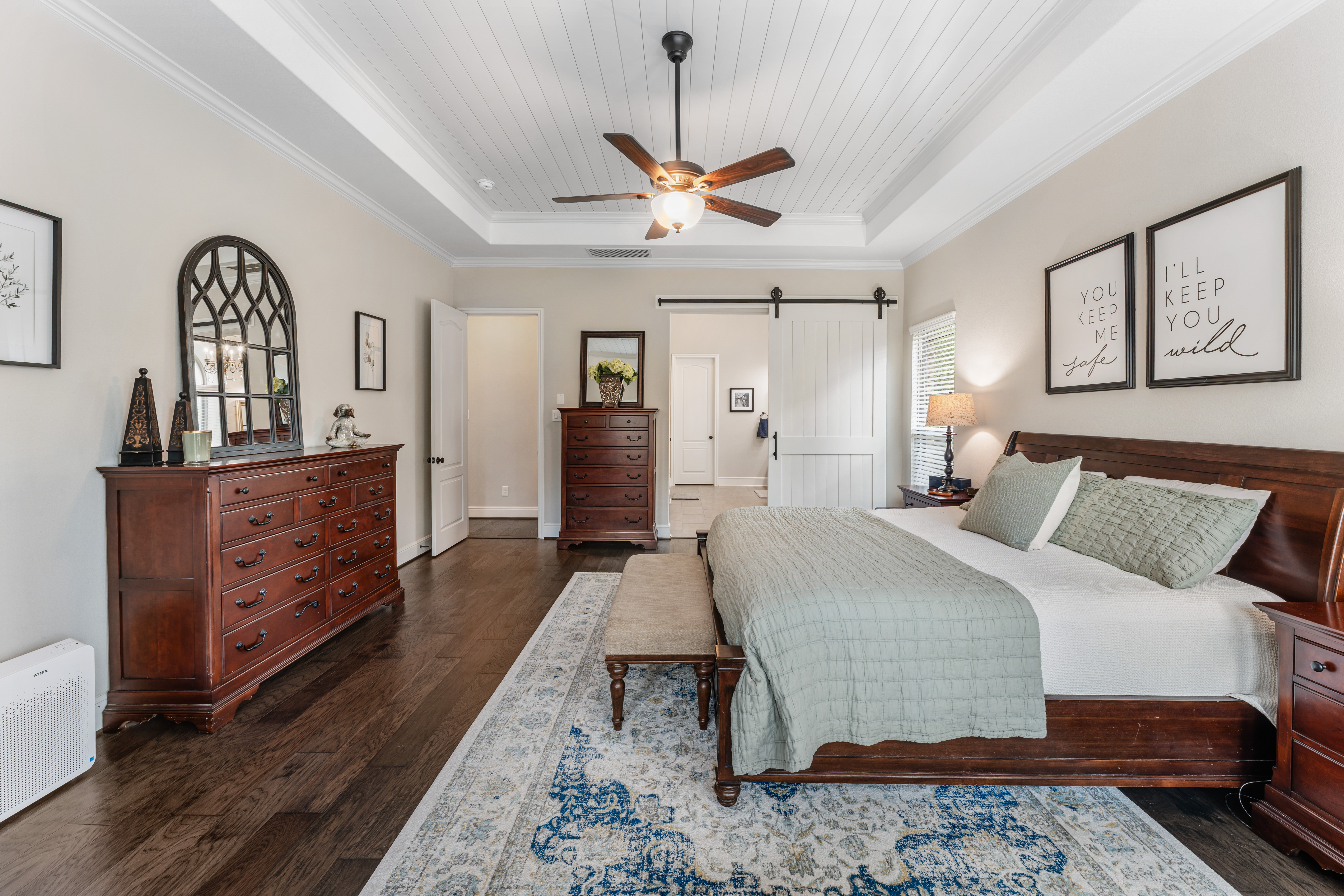 Primary suite with shiplap ceiling, spa-inspired bathroom.