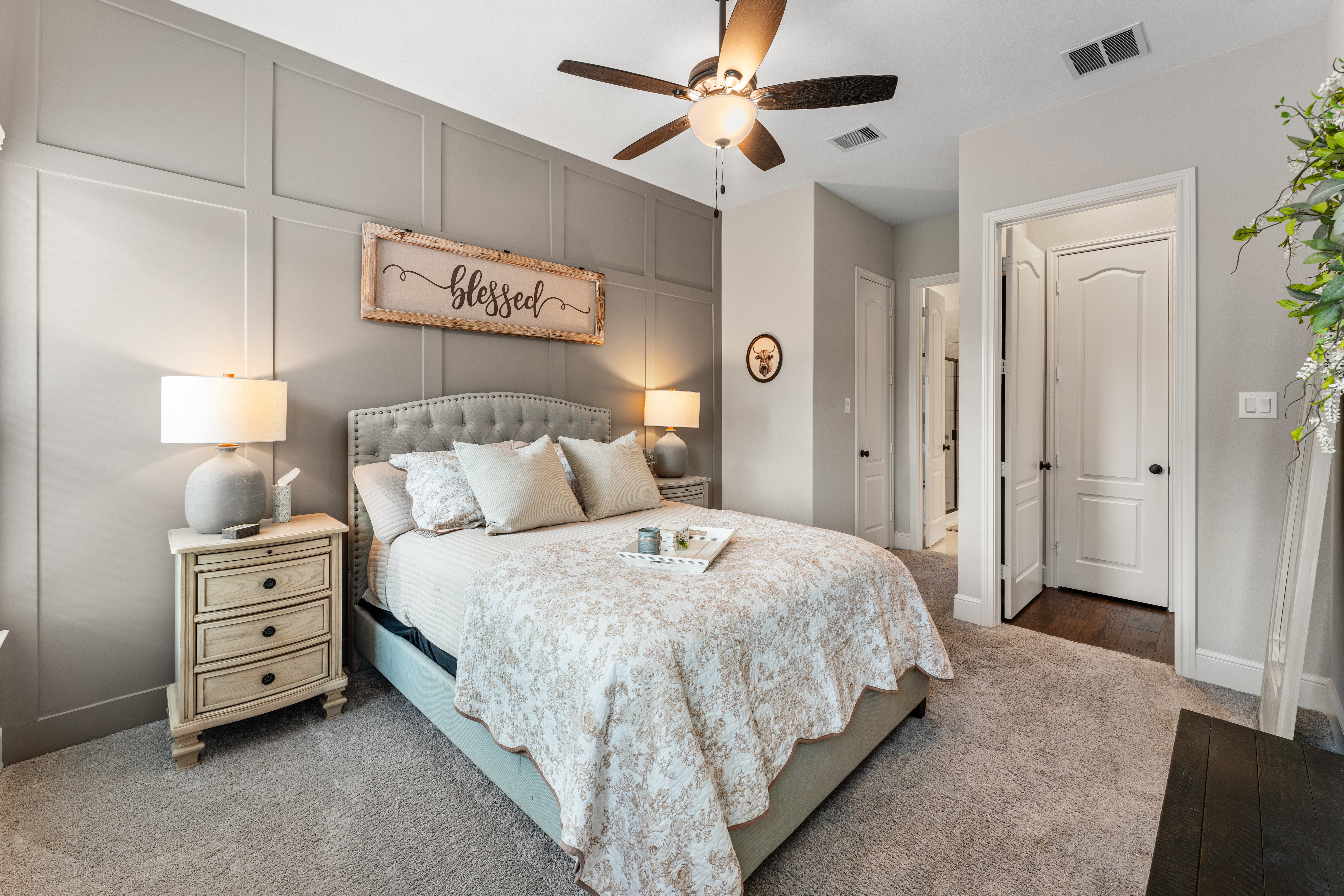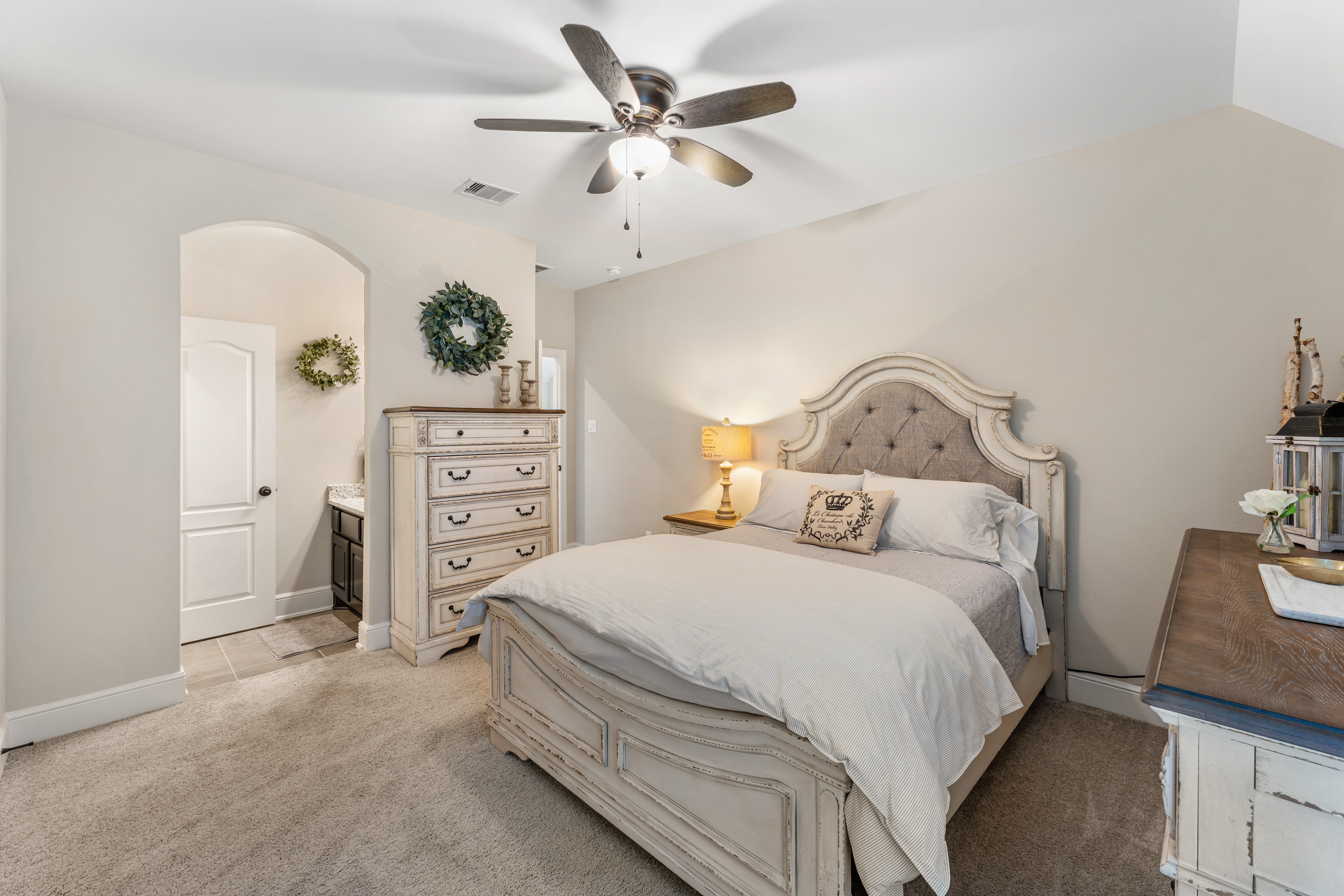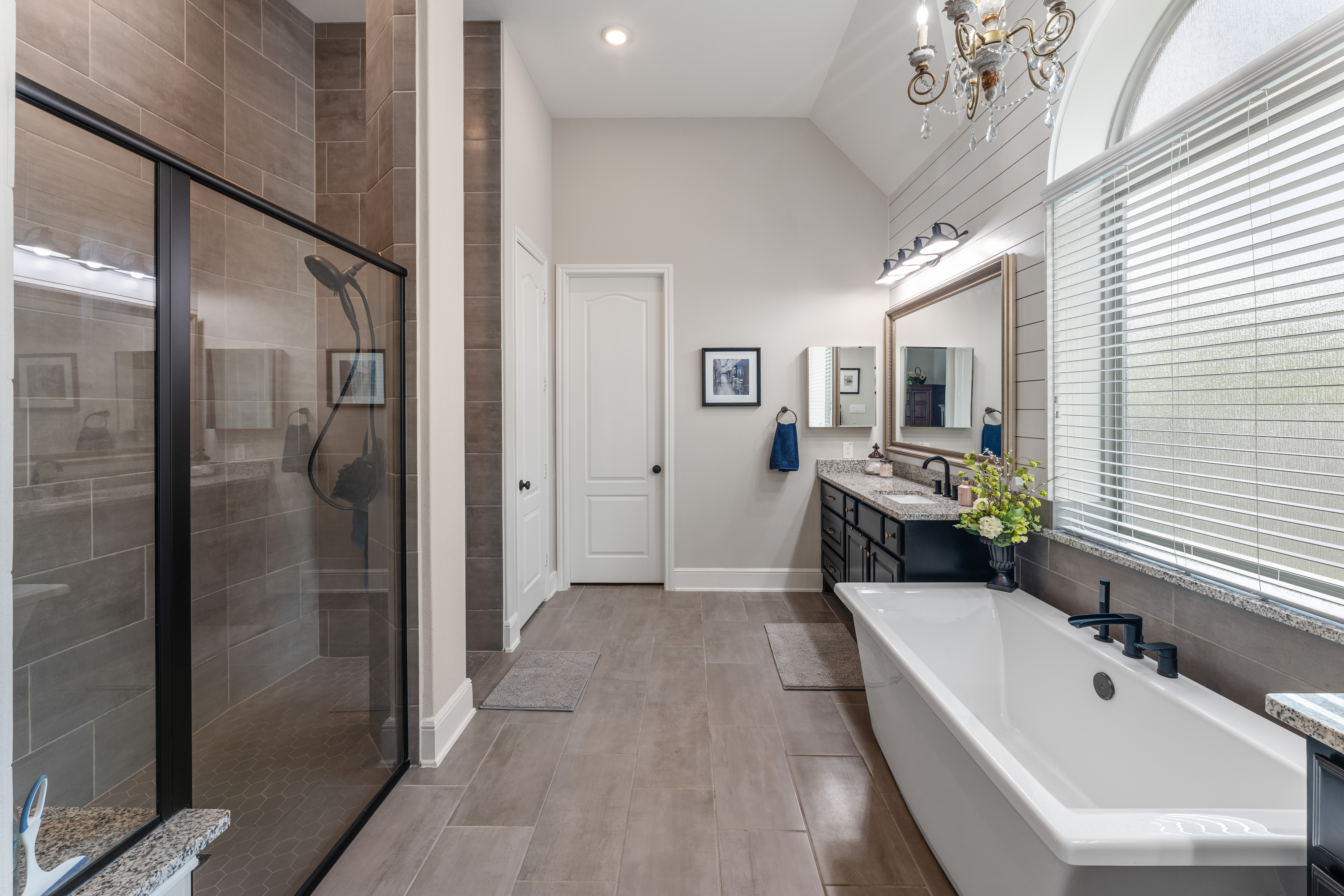 Primary suite with shiplap ceiling, spa-inspired bathroom.