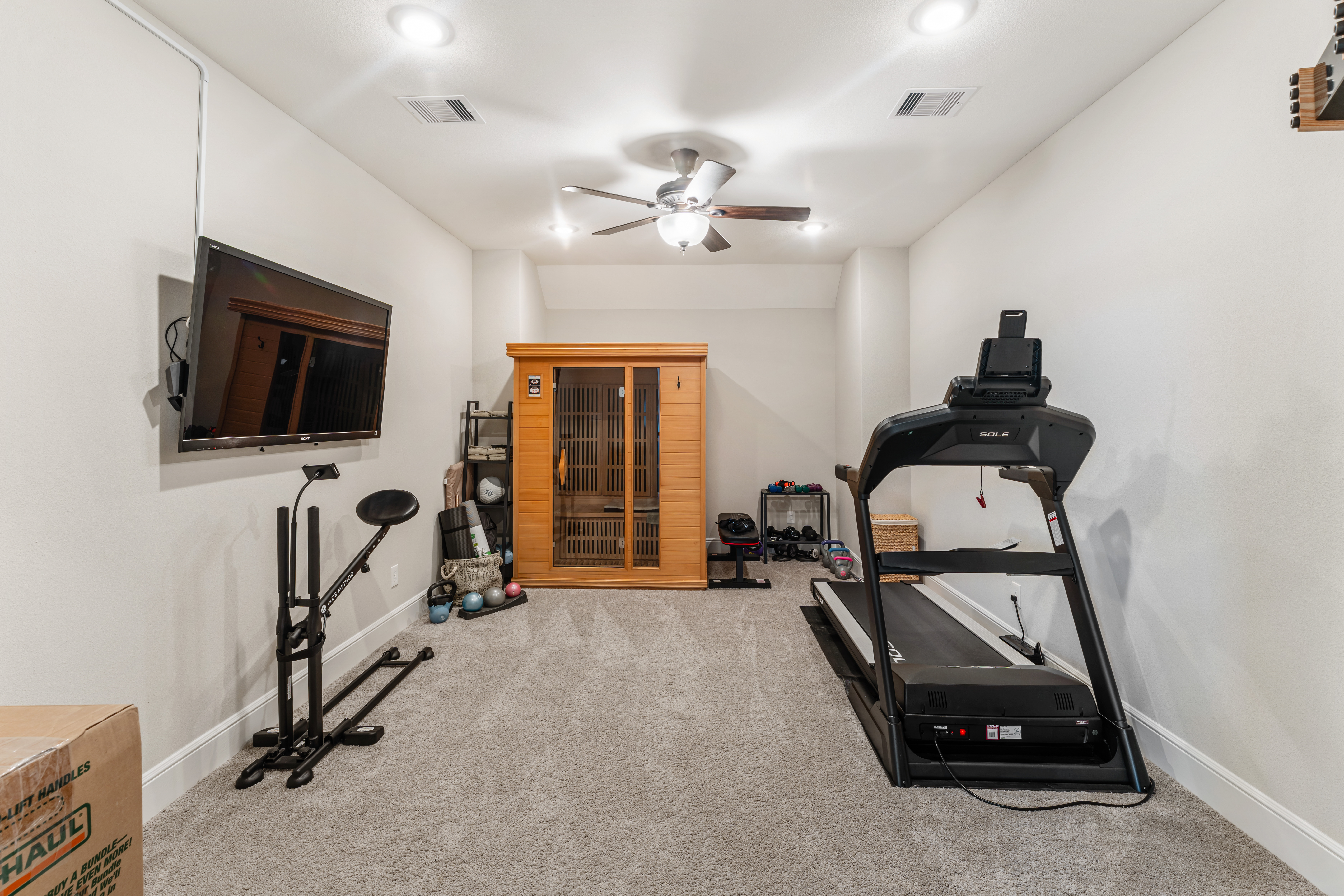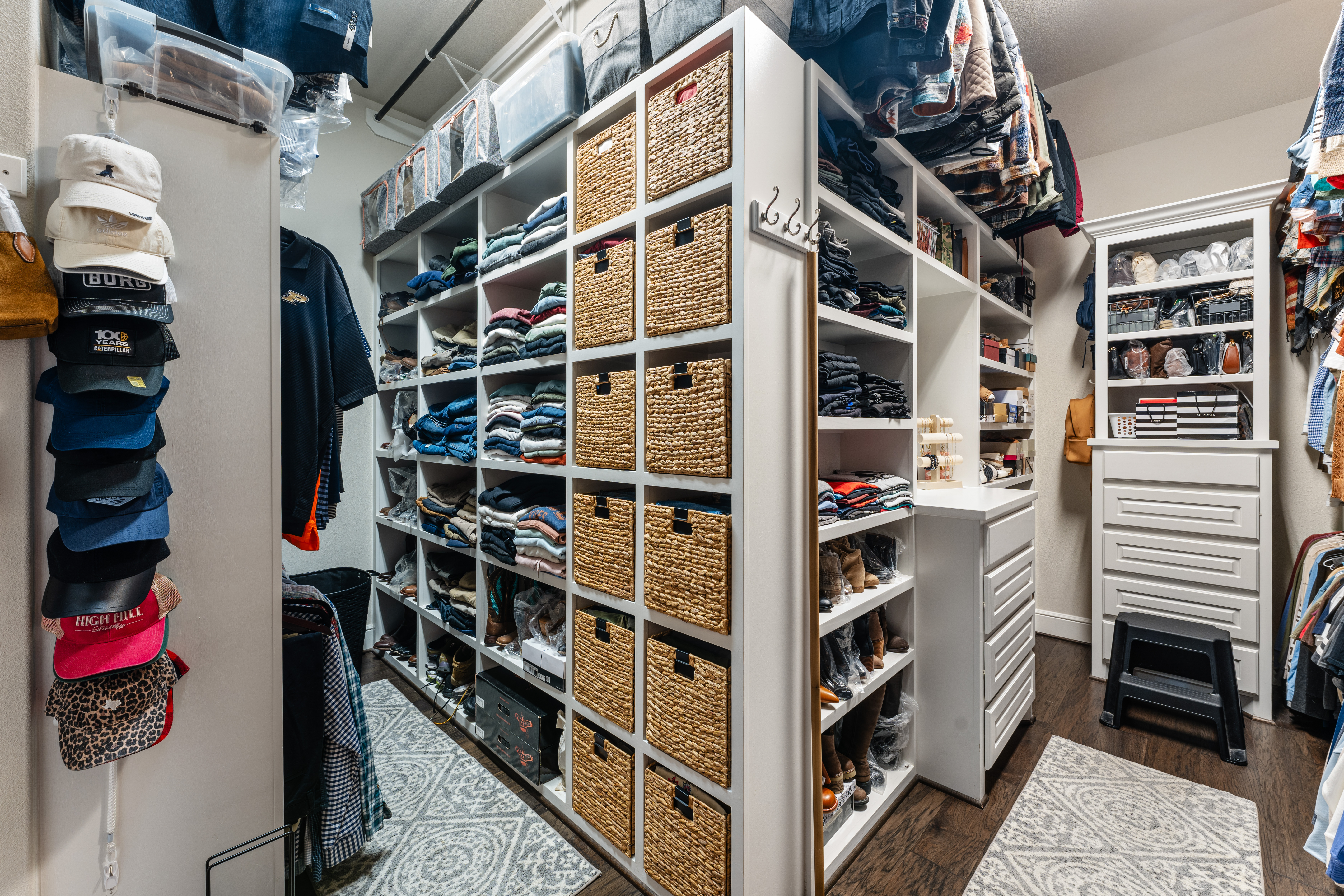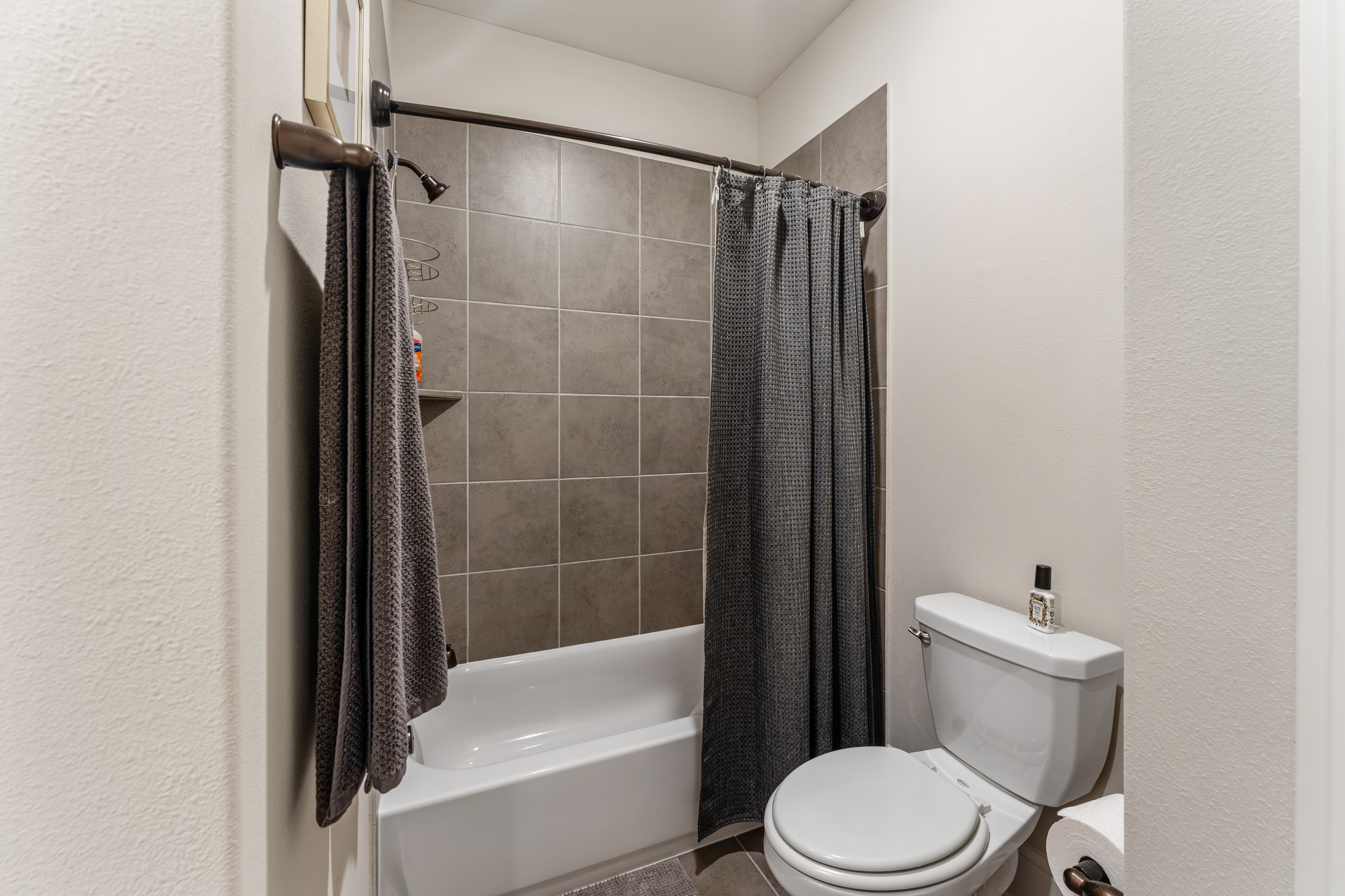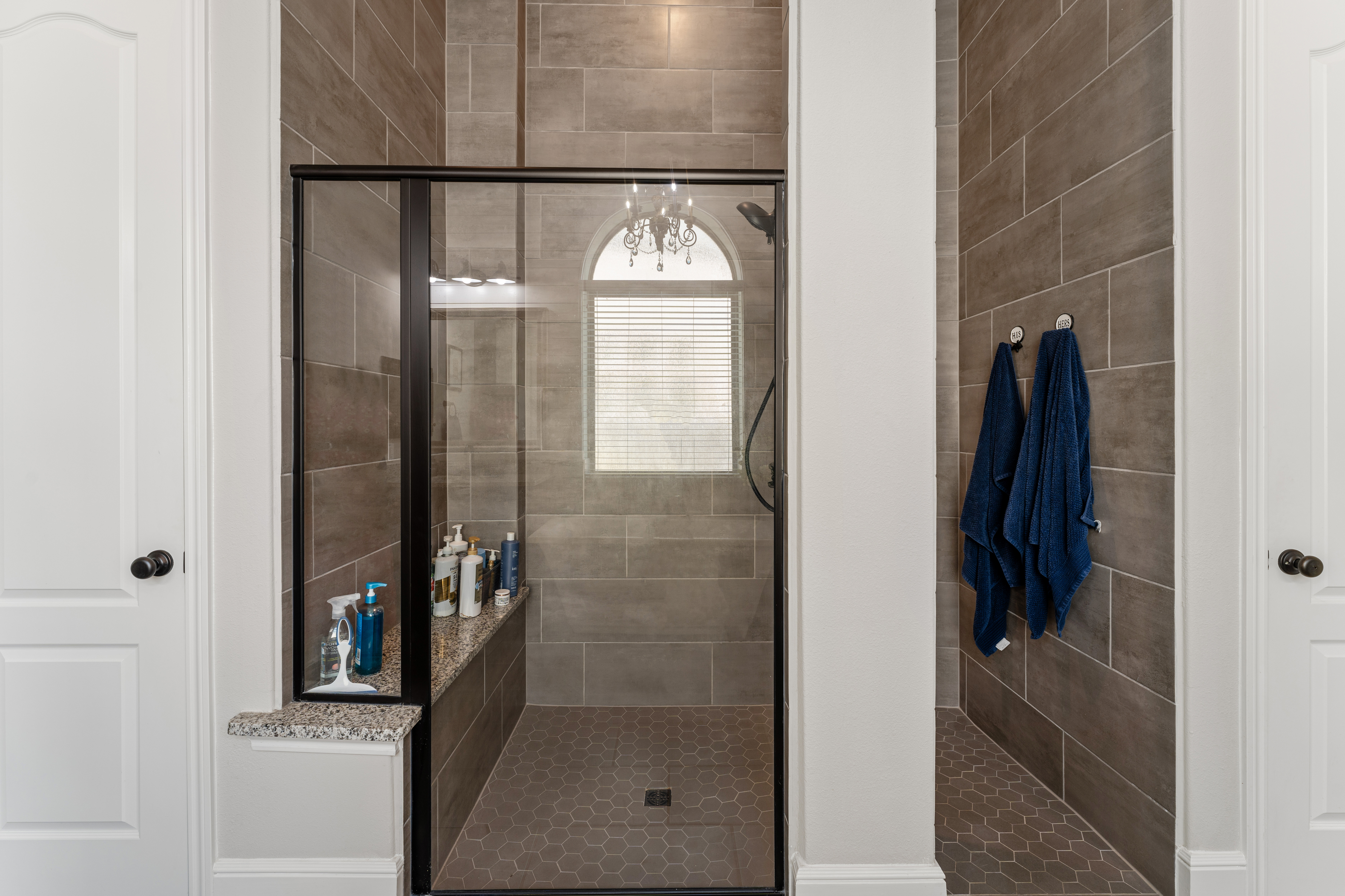 Primary suite with shiplap ceiling, spa-inspired bathroom.