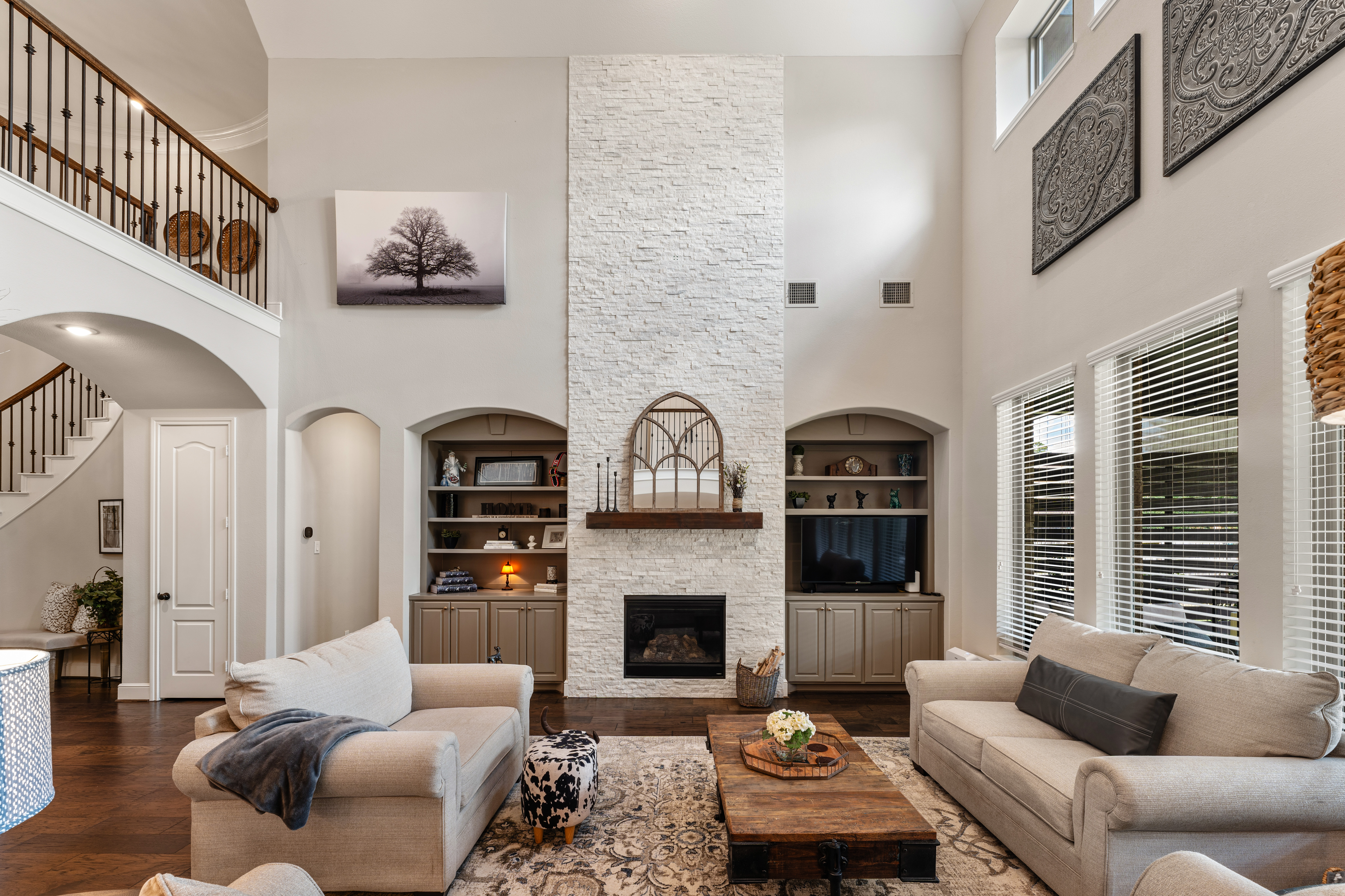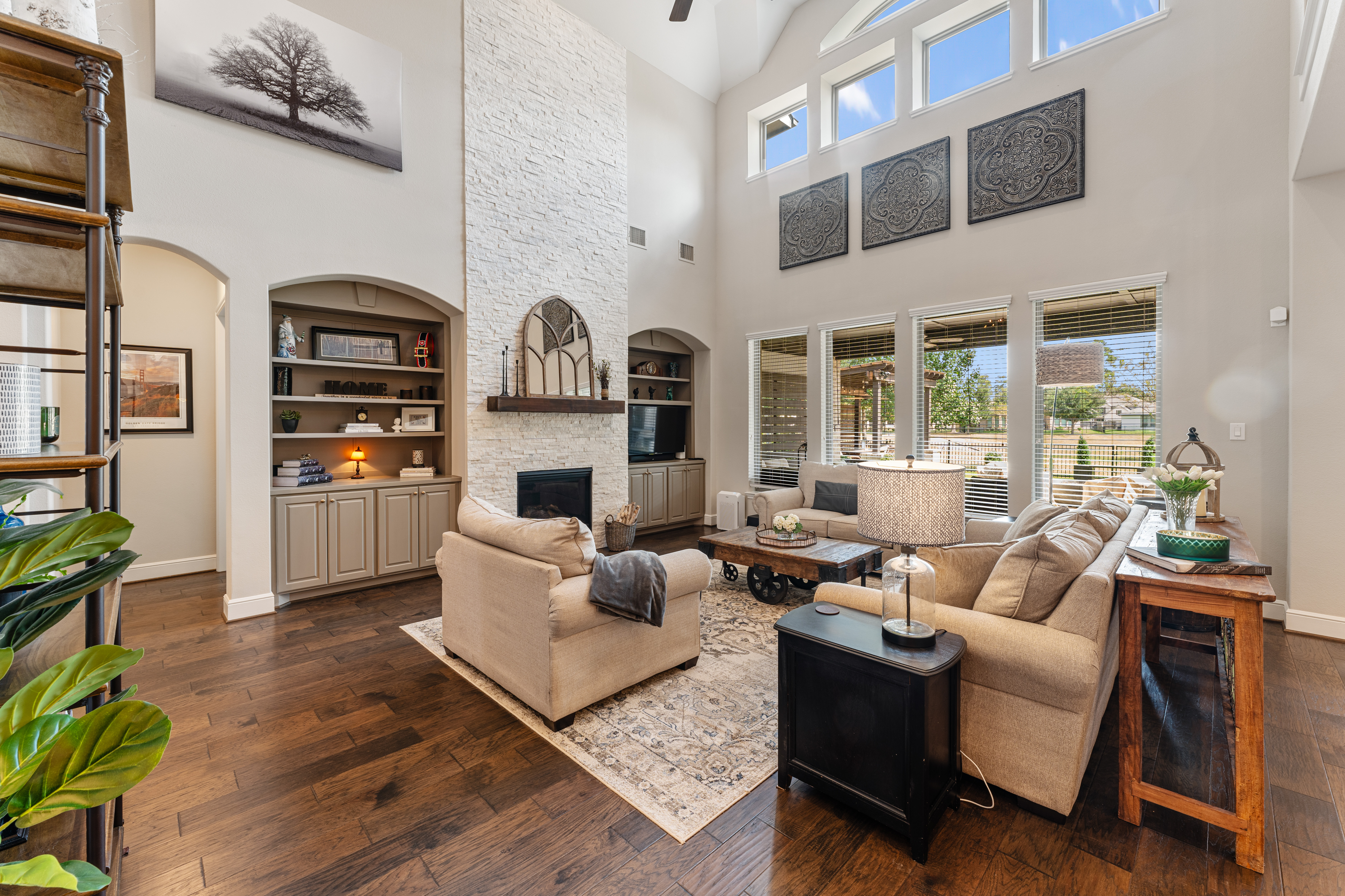 Expansive living room with a 20’ stone fireplace and custom bookcases