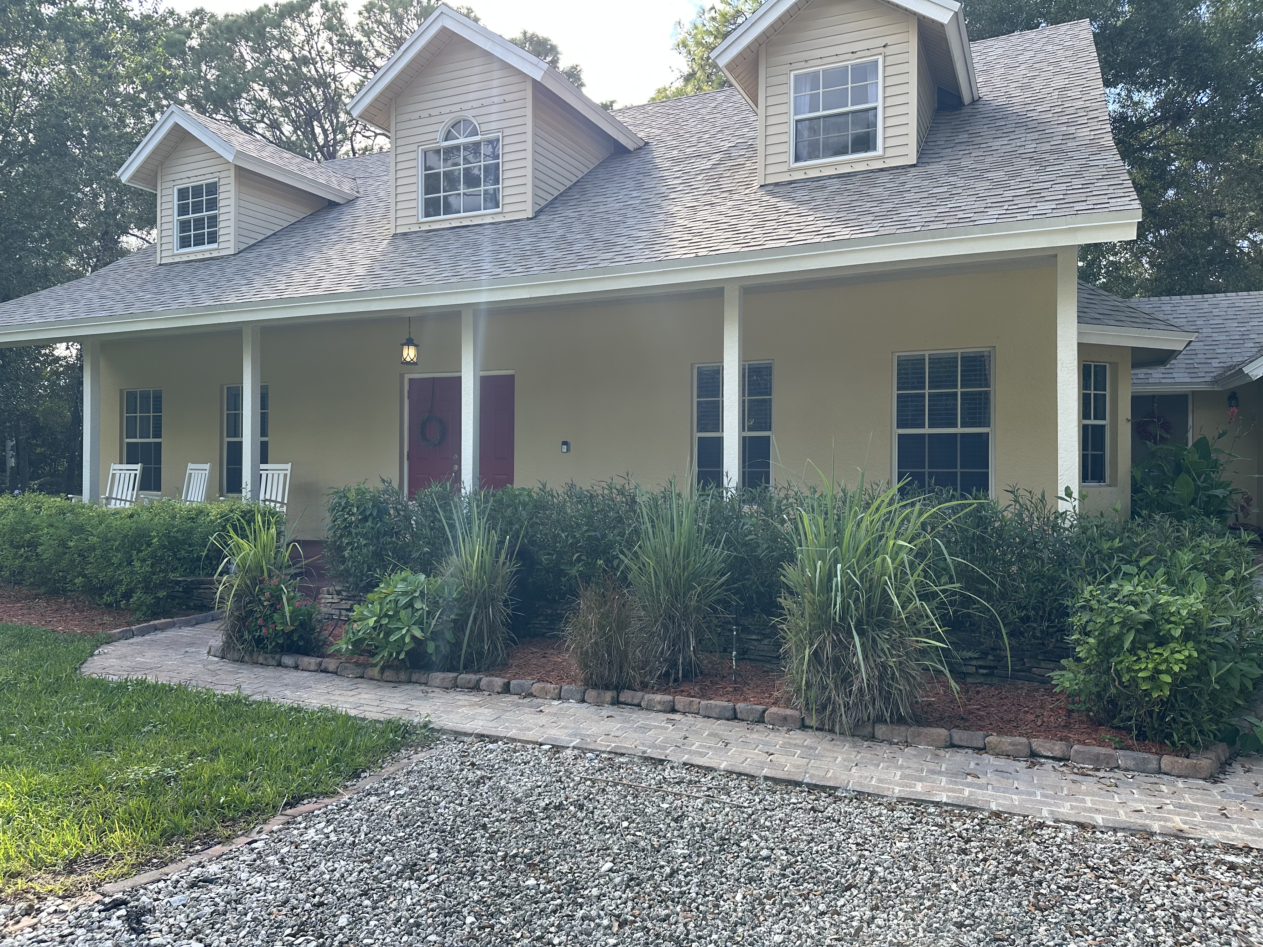 Discover your dream home in this picturesque farmhouse nestled on a spacious 2-acre cleared fenced property with Florida trees in Jupiter Farms, an equestrian community that seems rural and private, yet has a family feel and is minutes drive to shopping, restaurants, hiking, and the beach. The first floor features a large primary suite with two closets and an en suite bathroom. Expansive kitchen equipped with GE Profile slate appliances. Large island for guests and has an additional eat/in kitchen. Enjoy gatherings in extra-large family room boasting a 20-foot ceiling and a wood-burning fireplace. Also: private office; mud room/pantry; 40 ft enclosed porch; 2 car attached garage; shed. New roof 2025; new HVAC 2021; inground sprinklers and water softener.
