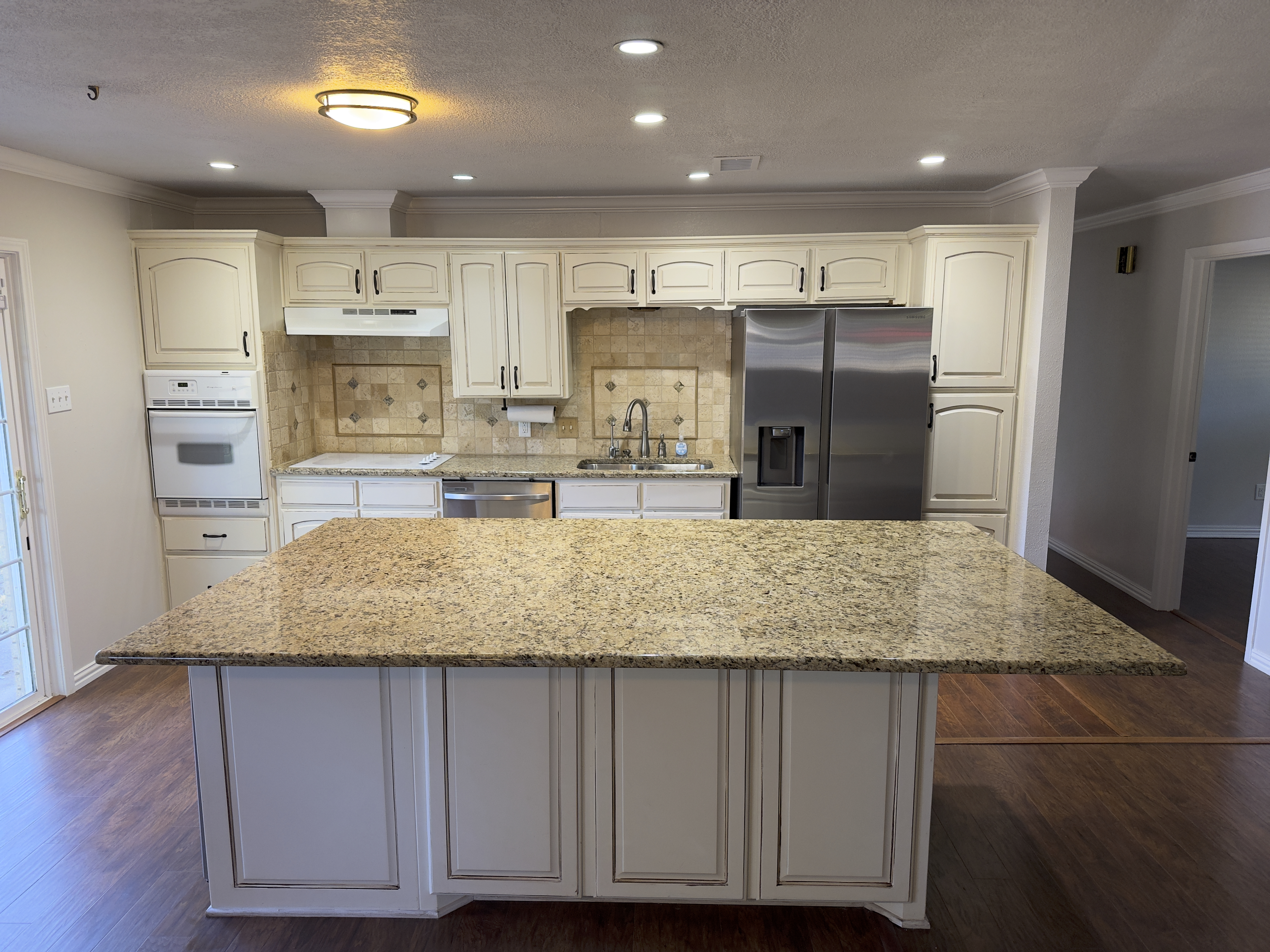 Granite countertops and an expansive center island with built-in beverage cooler perfect for gathering or prepping meals.