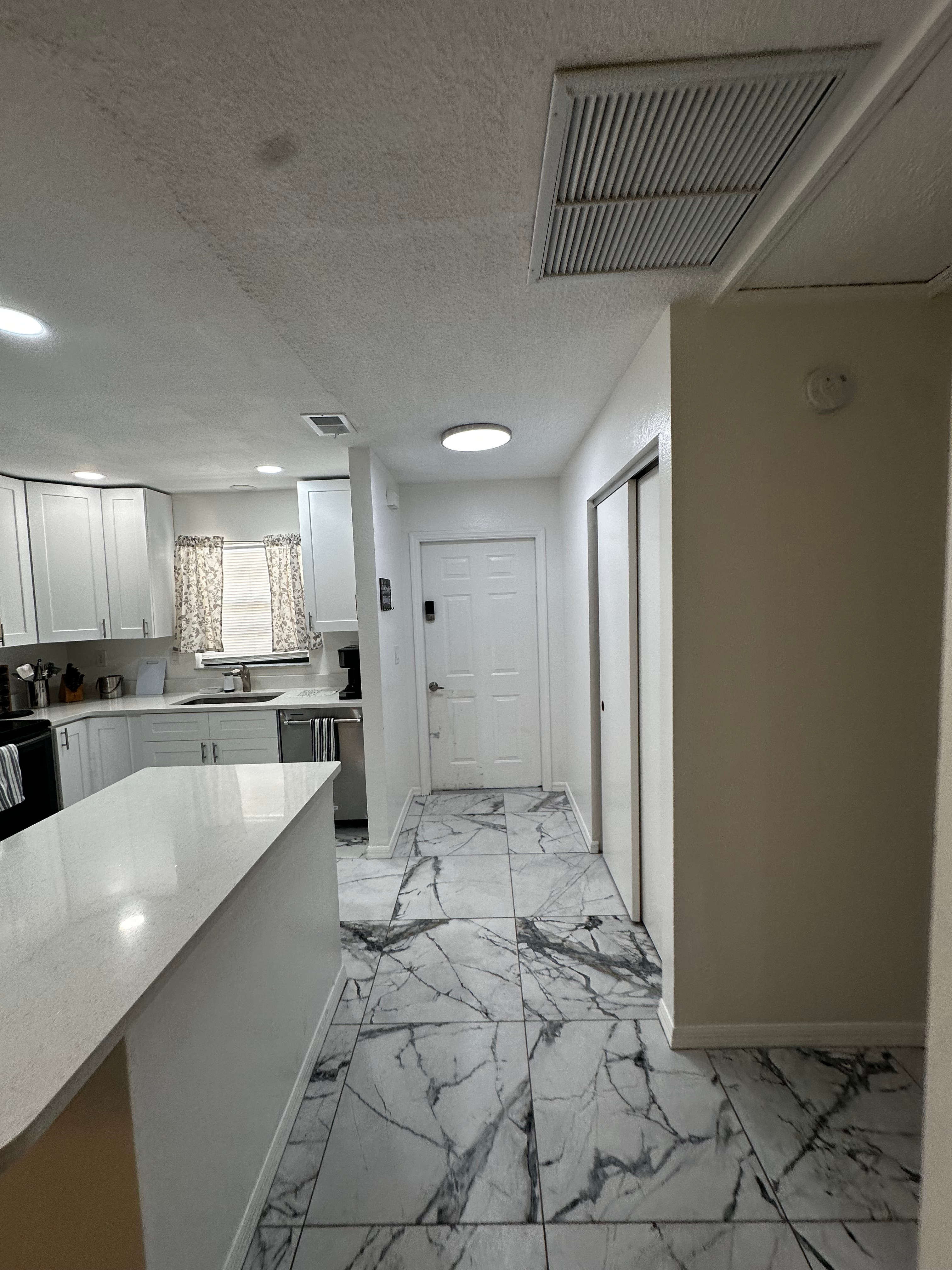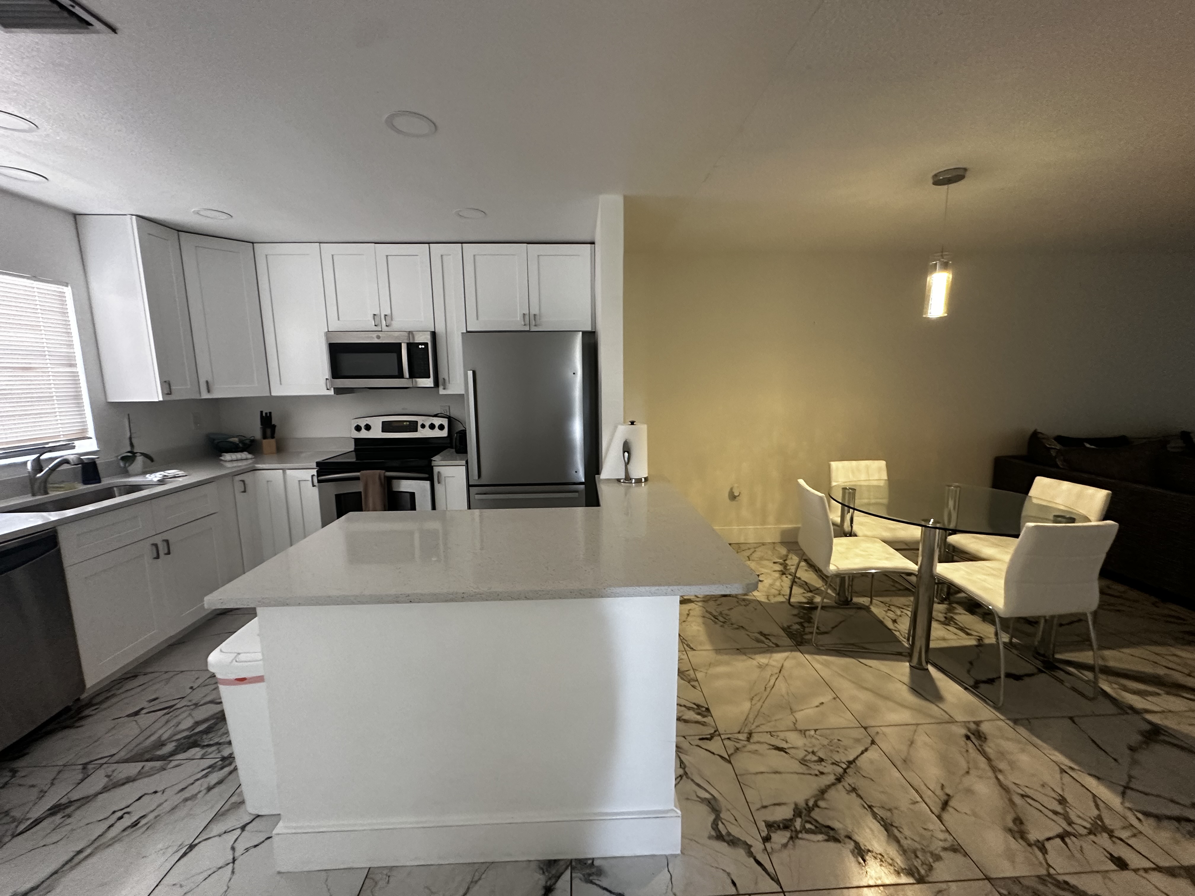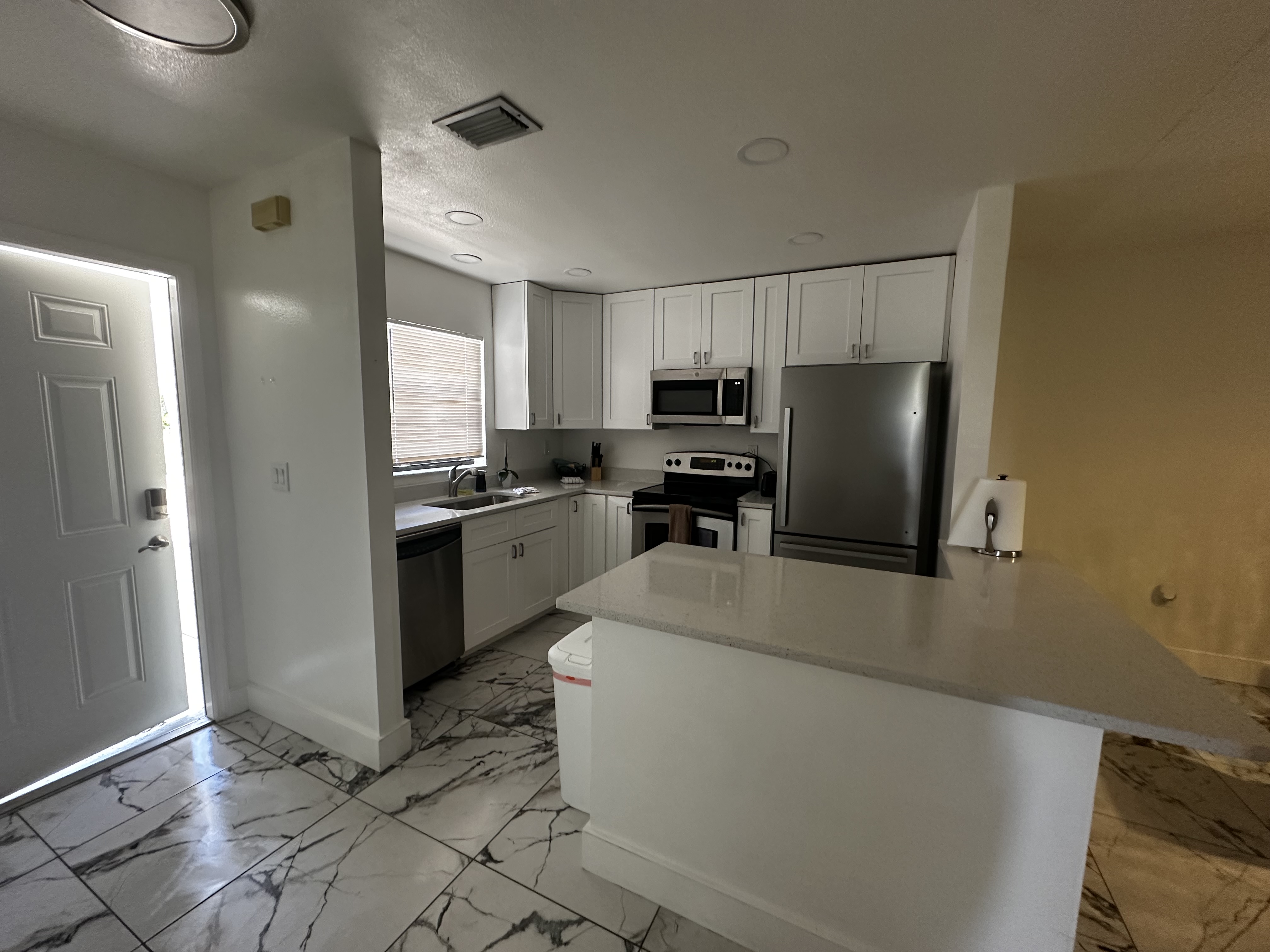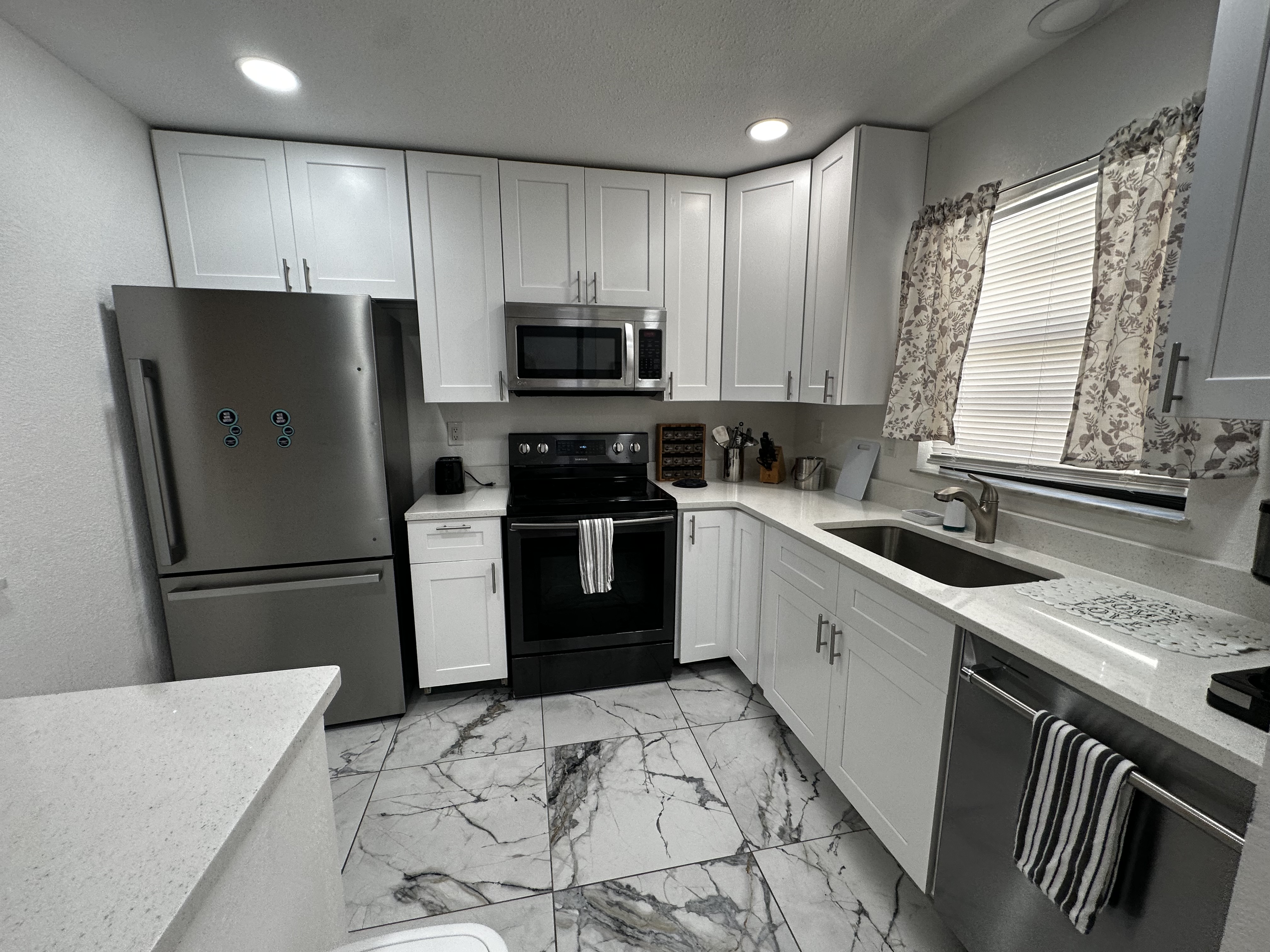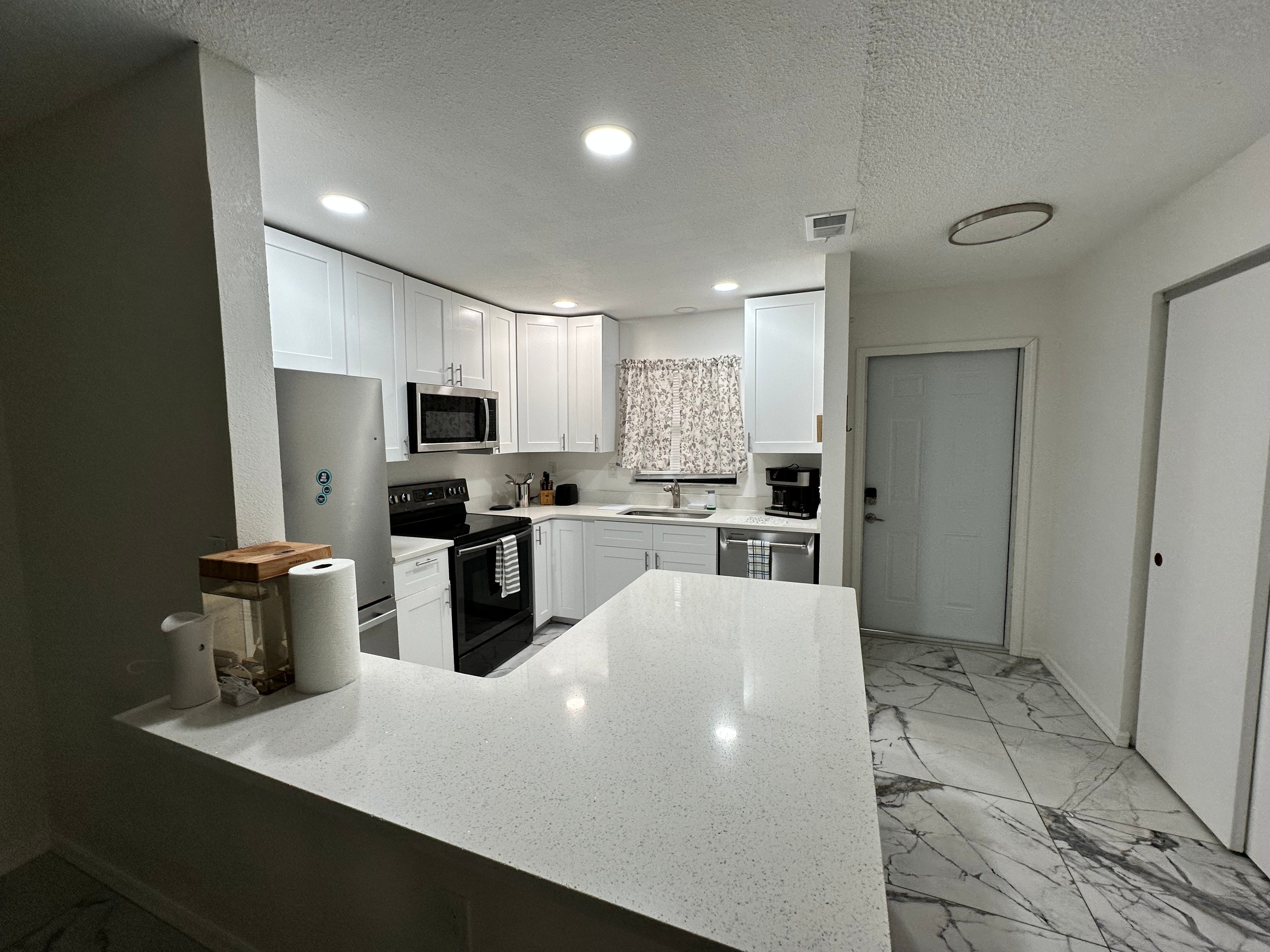 Brand new white kitchen cabinets were put in just a week ago. The kitchen has white Quartz countertops.
