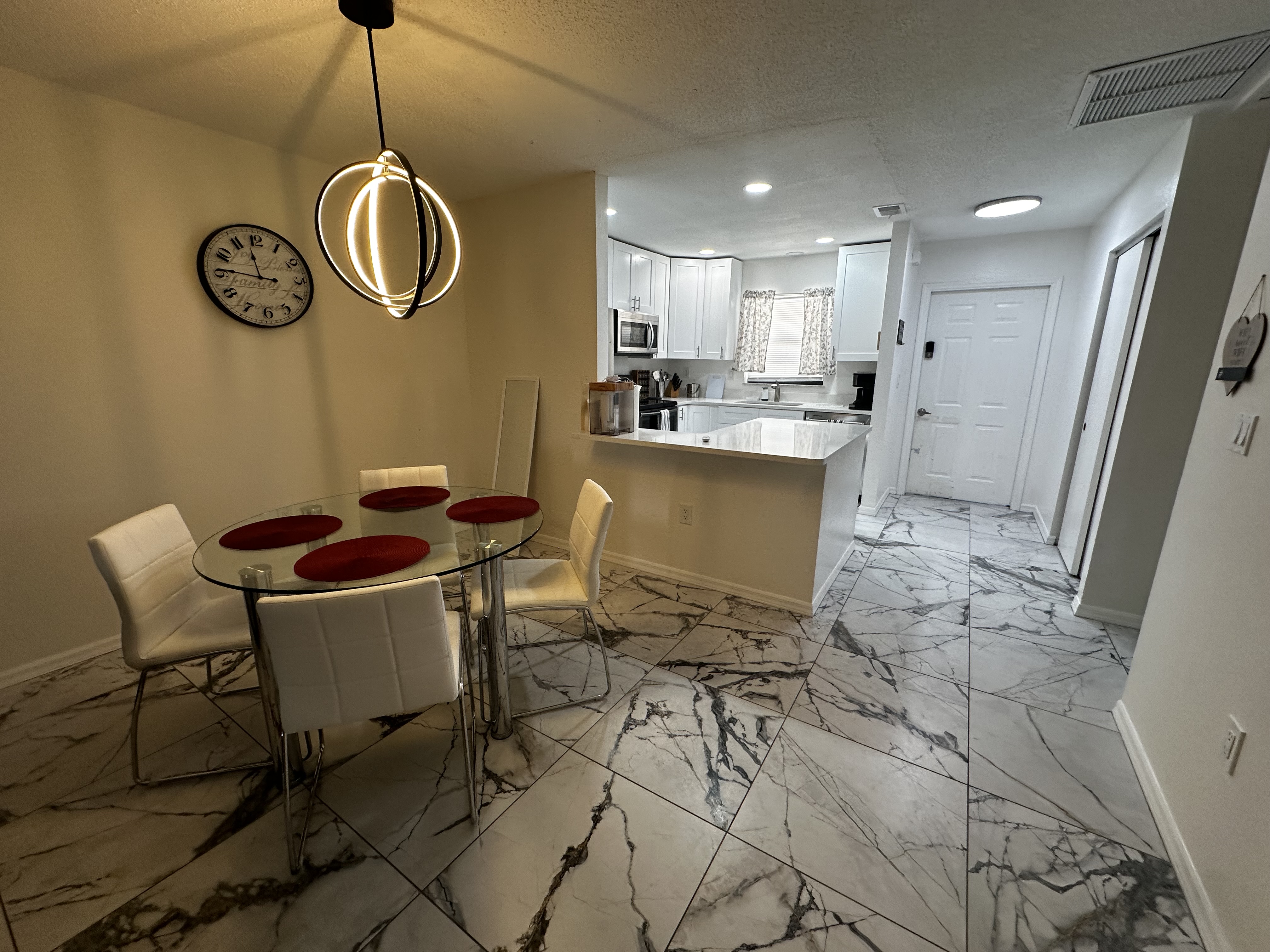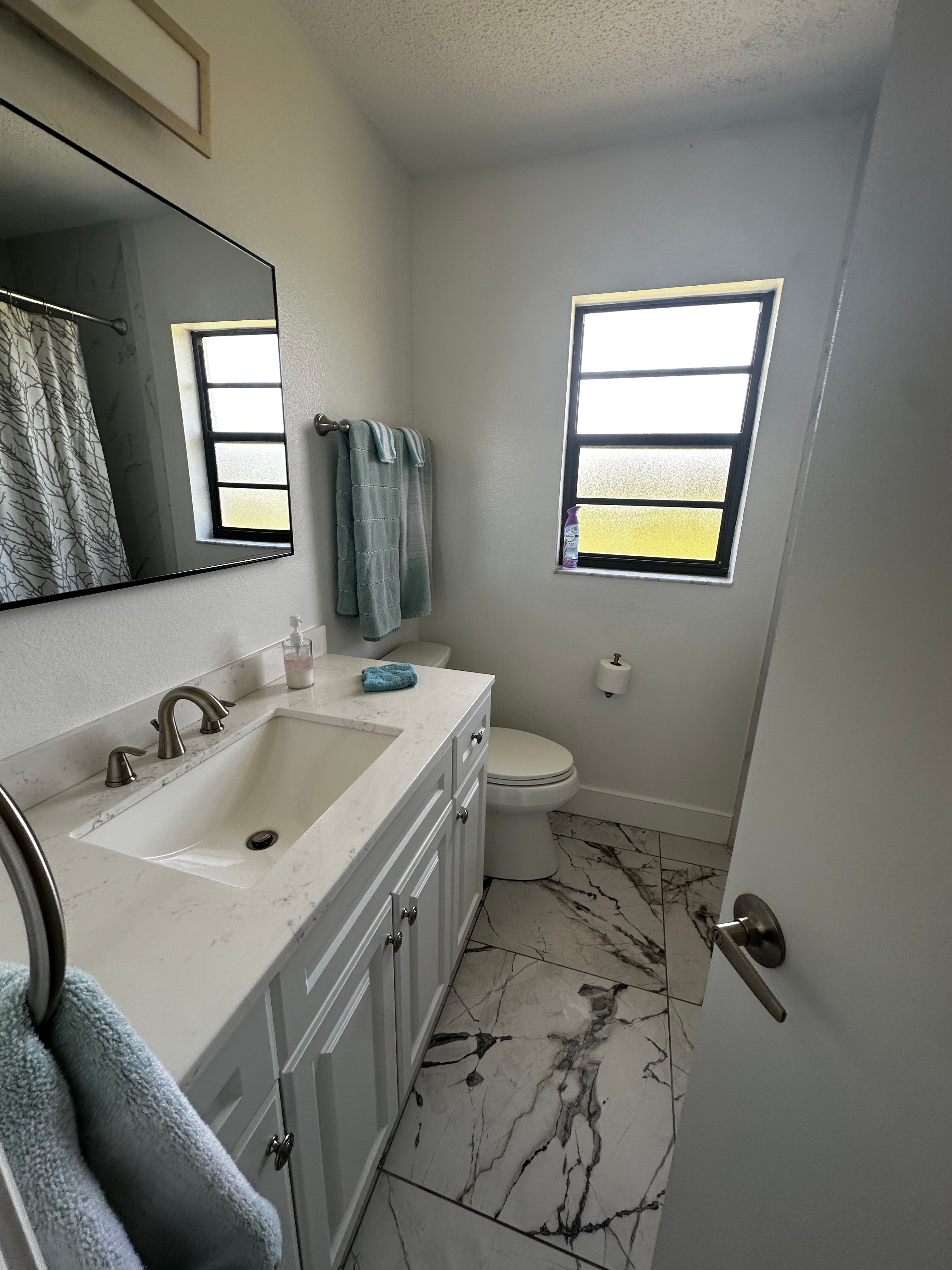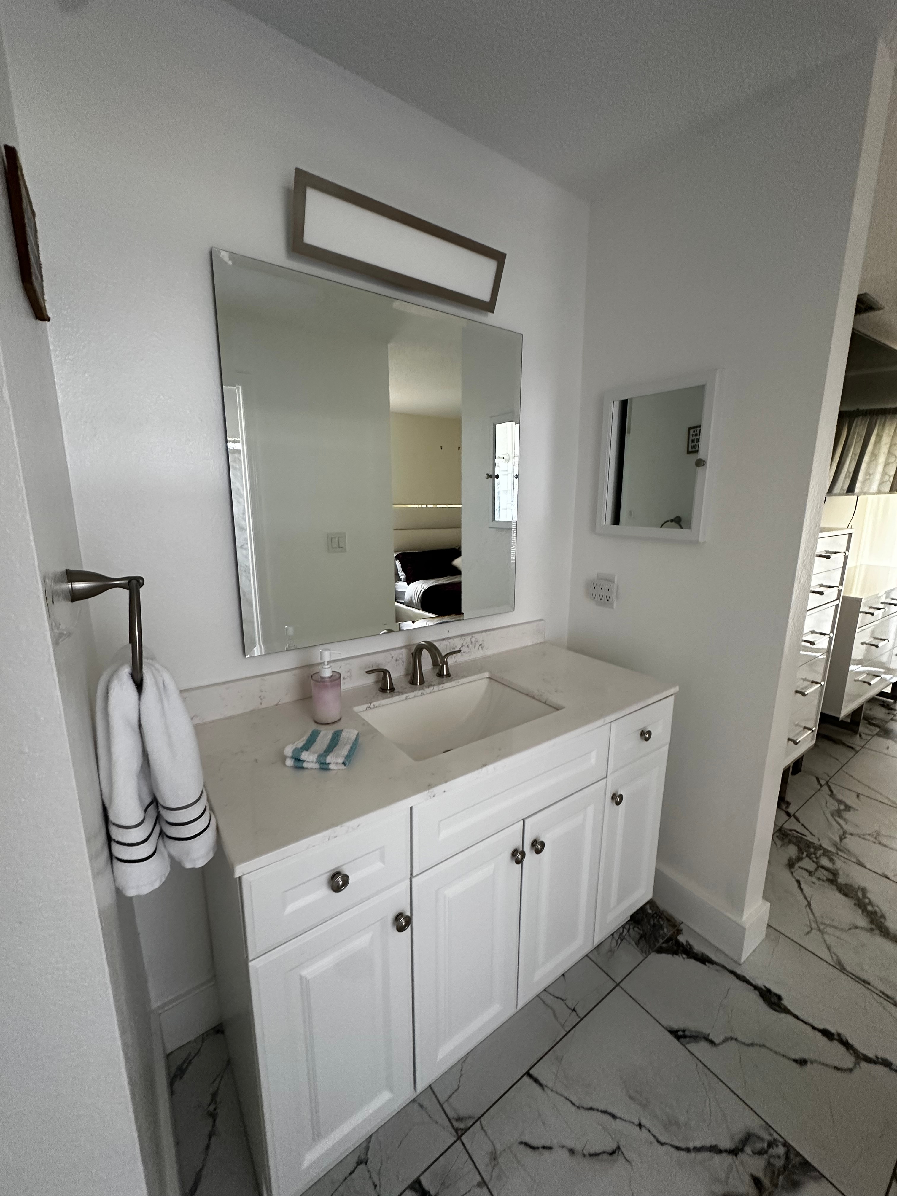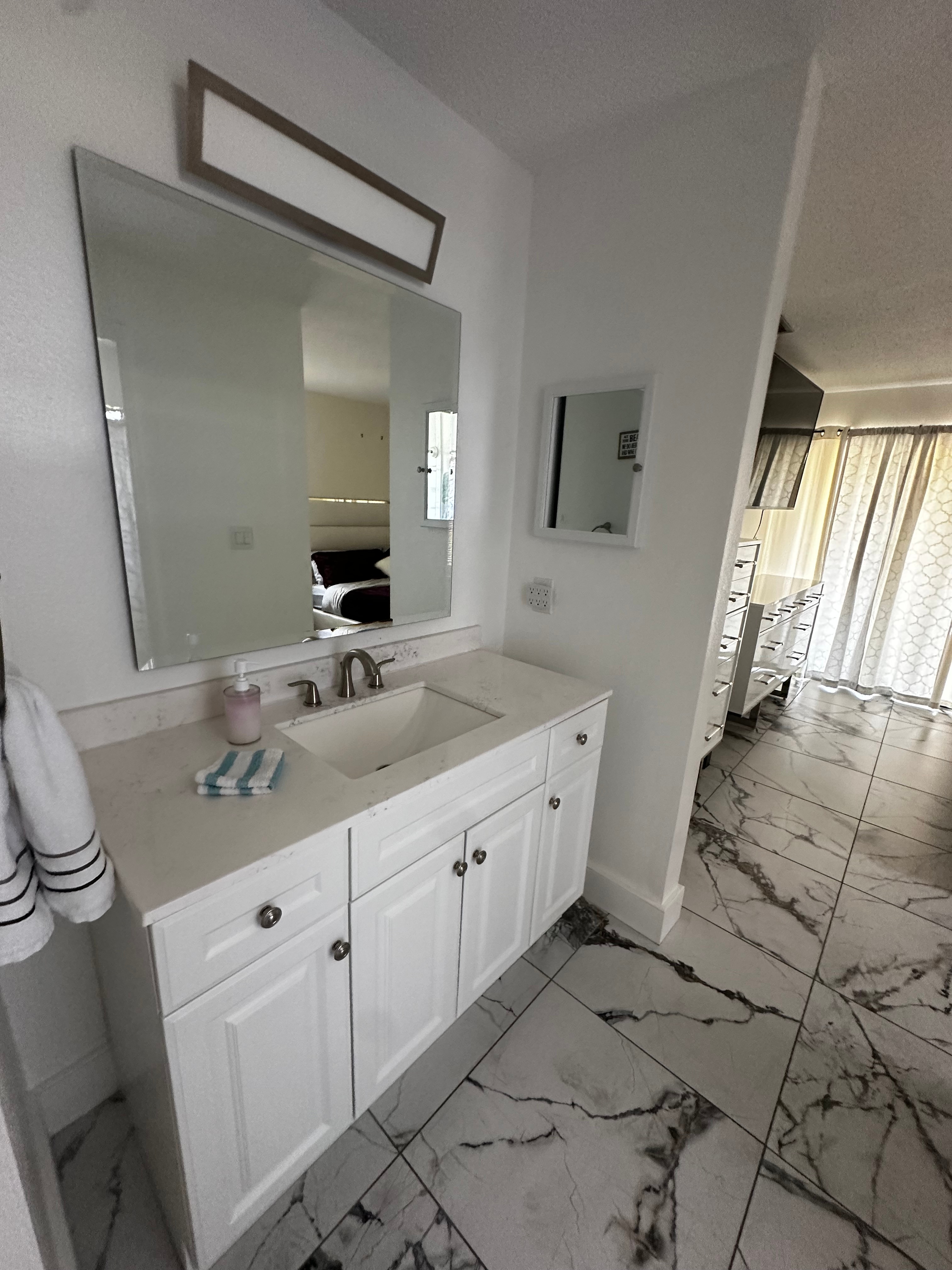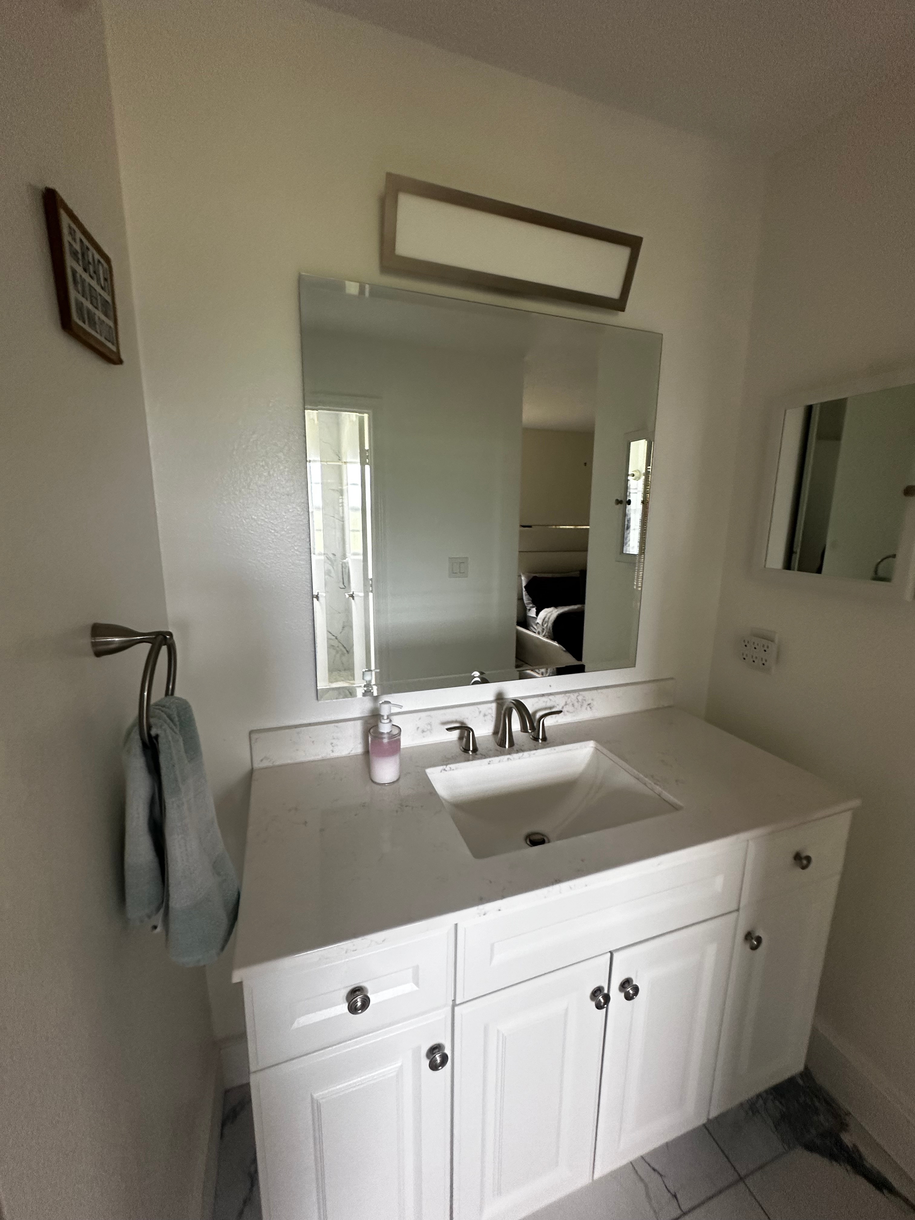Brand new white kitchen cabinets were put in just a week ago. The kitchen has white Quartz countertops.
