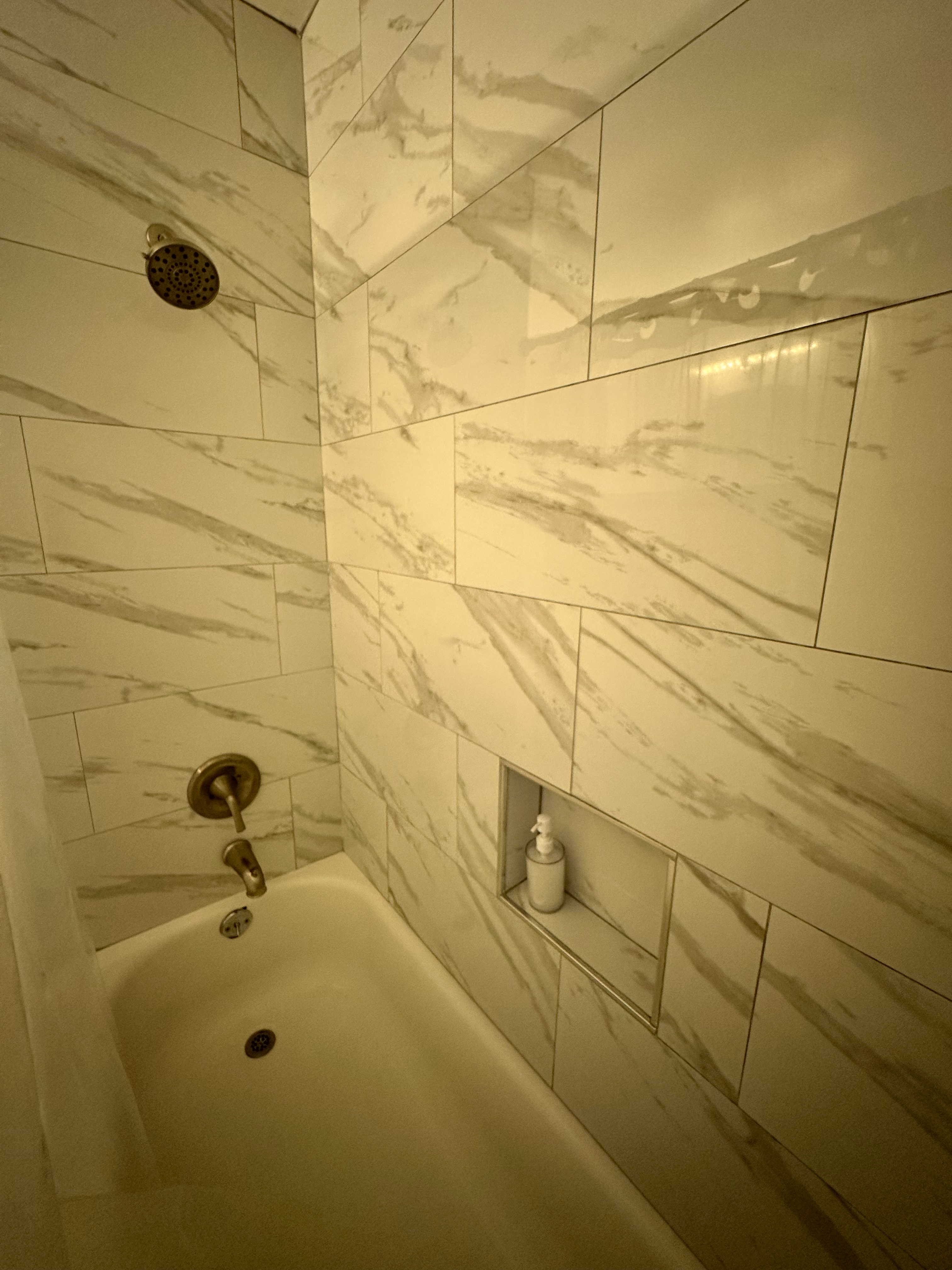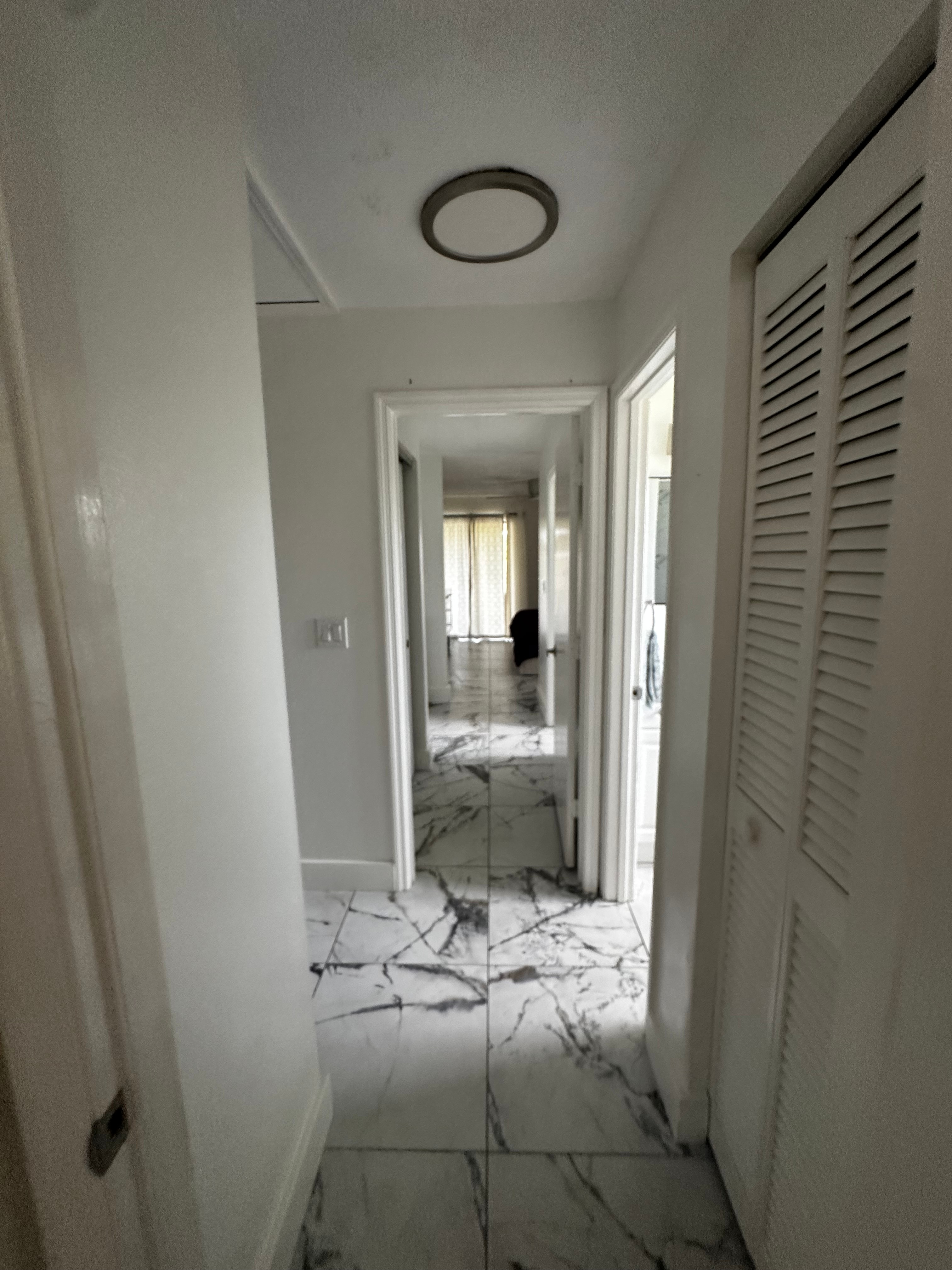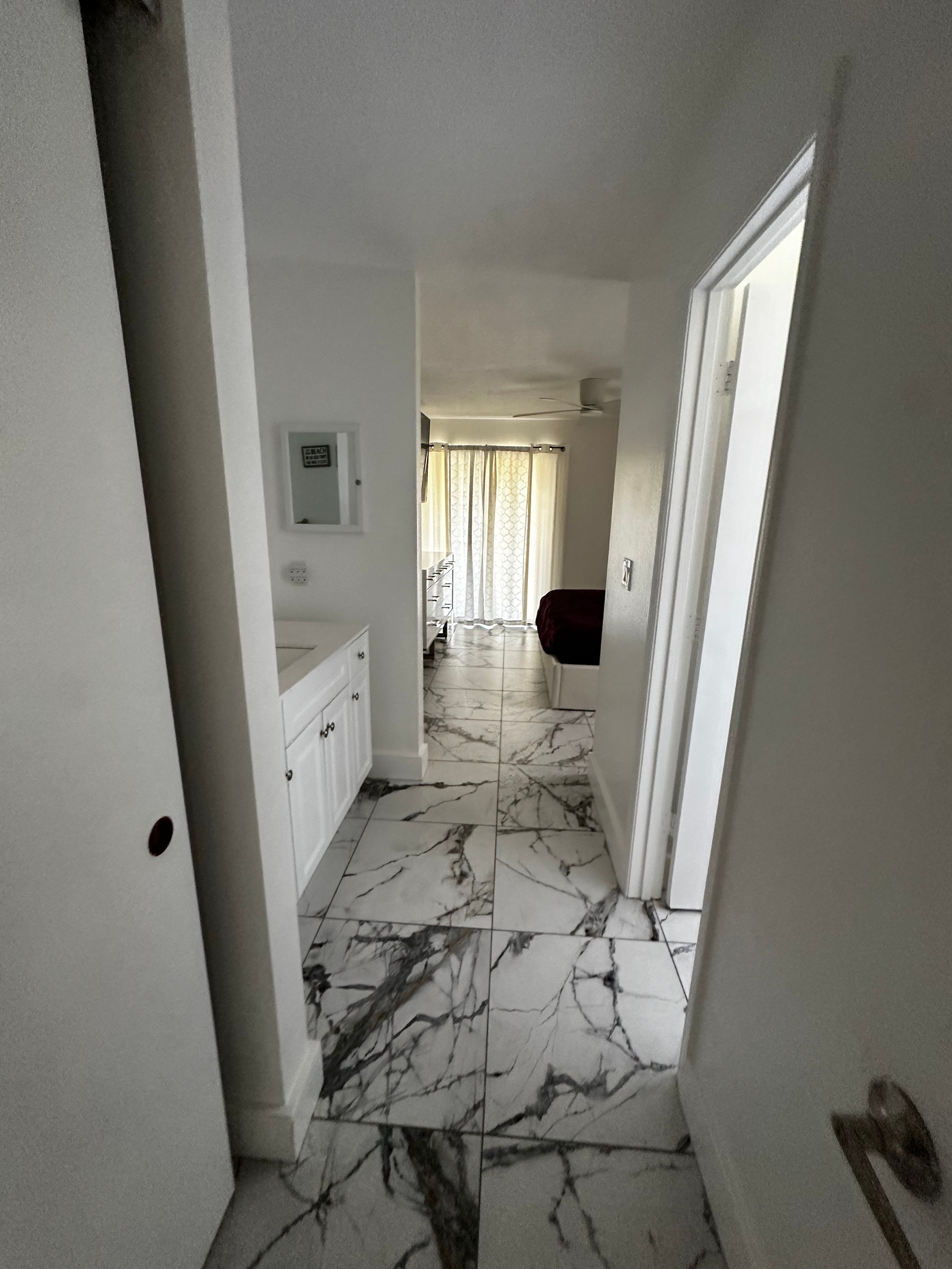 The FLoor is porcelain 24 inch tile and both bathrooms are tiled walls ;new large baseboards . Master shower walk in.