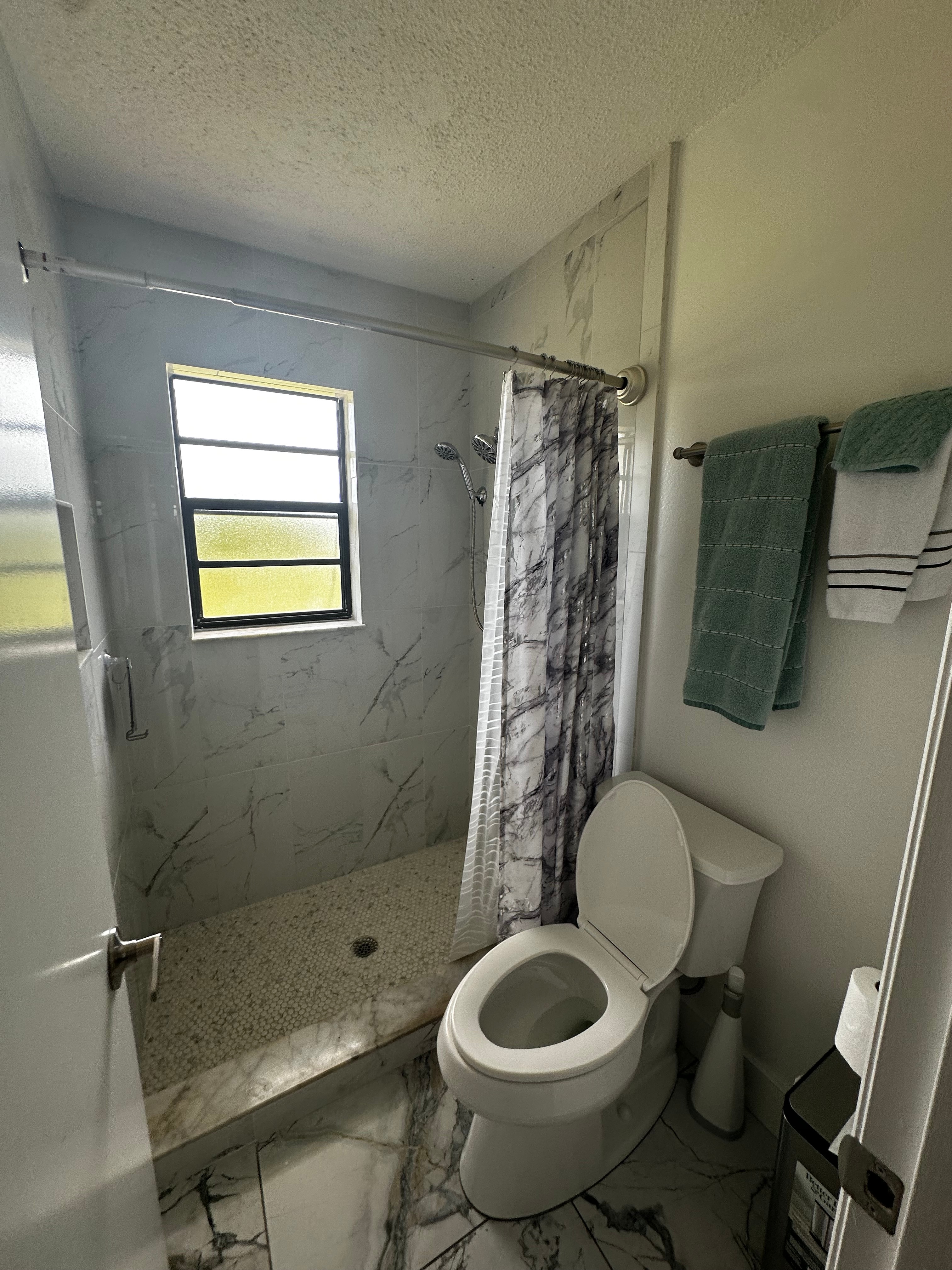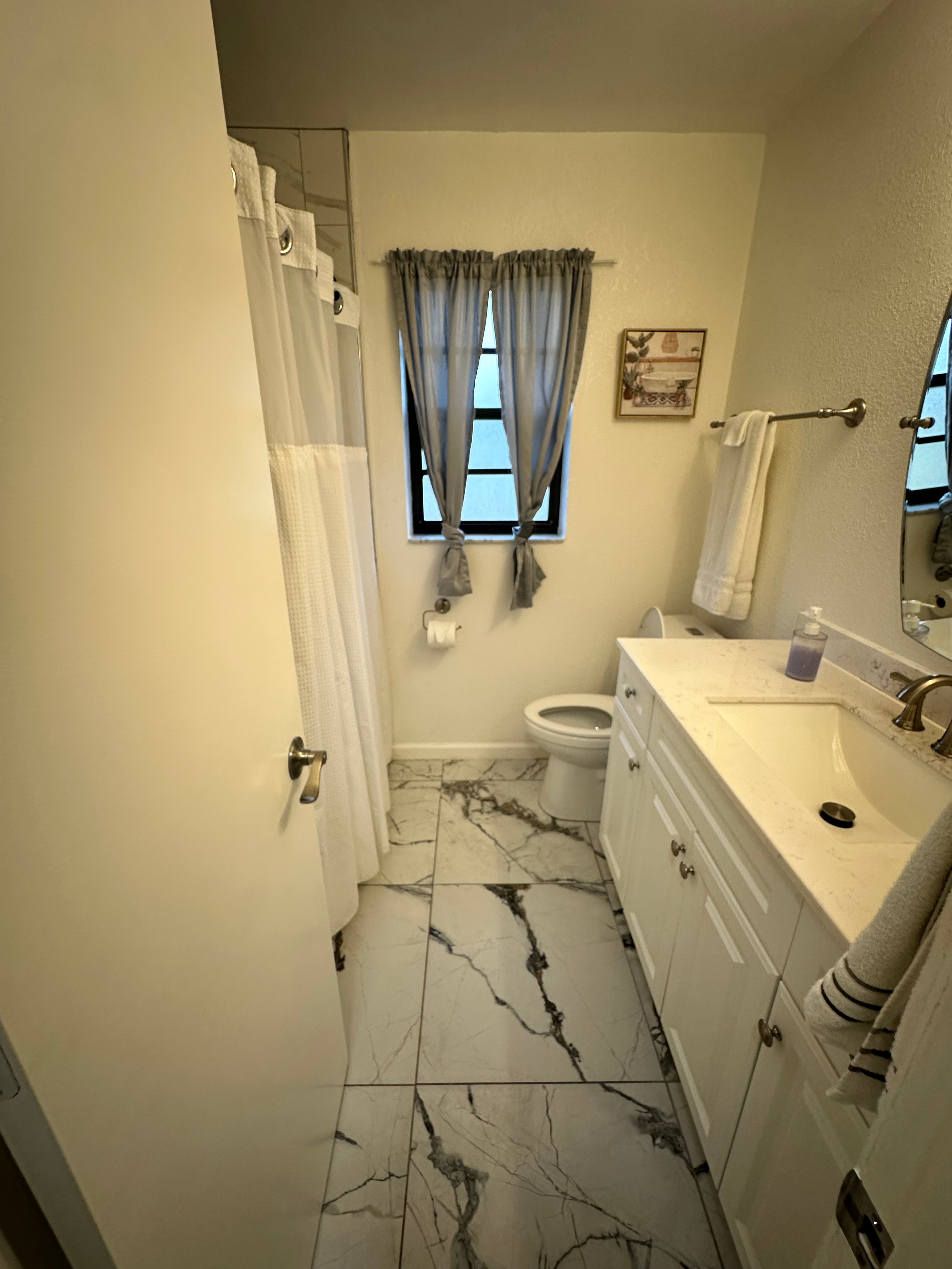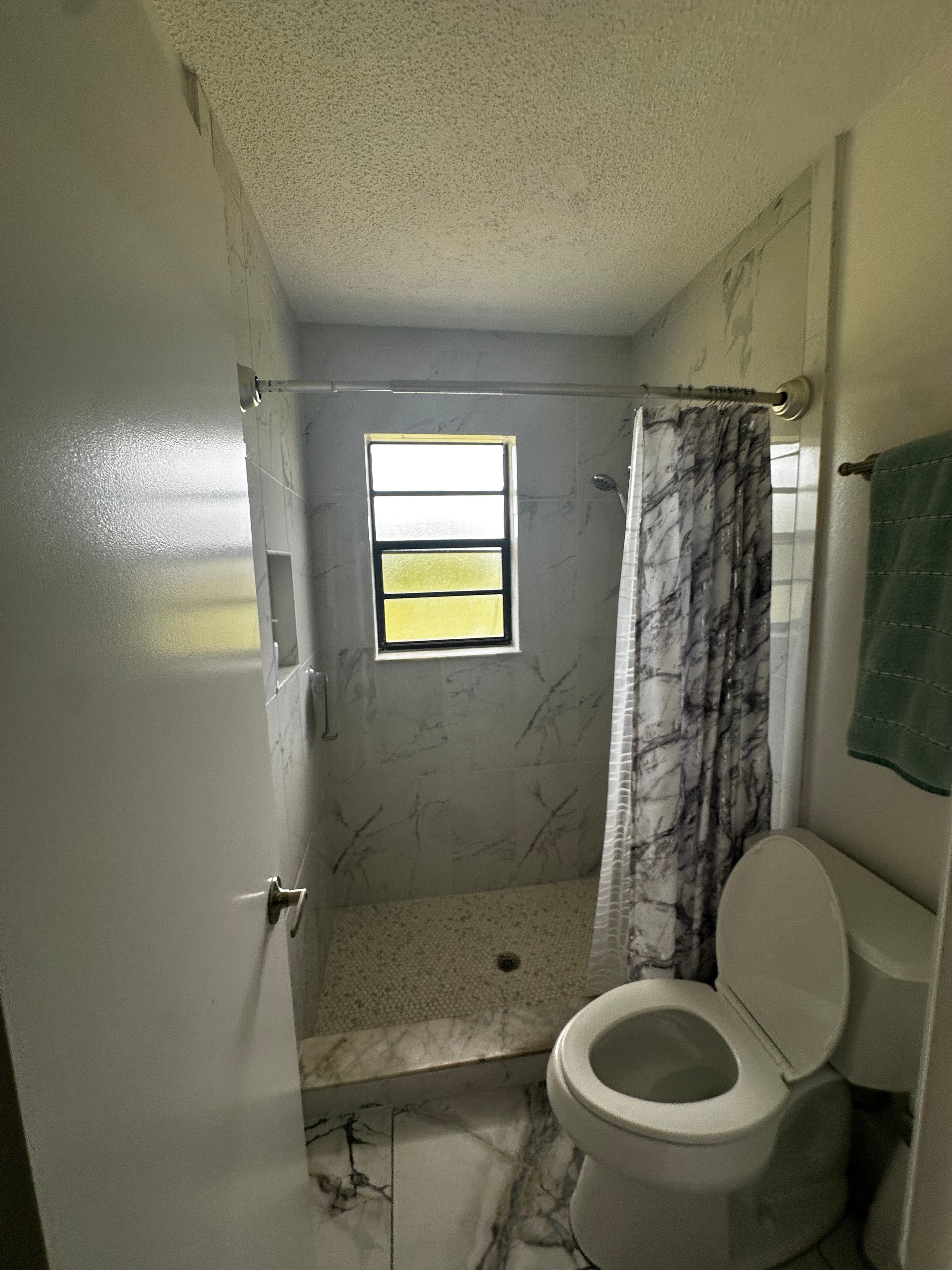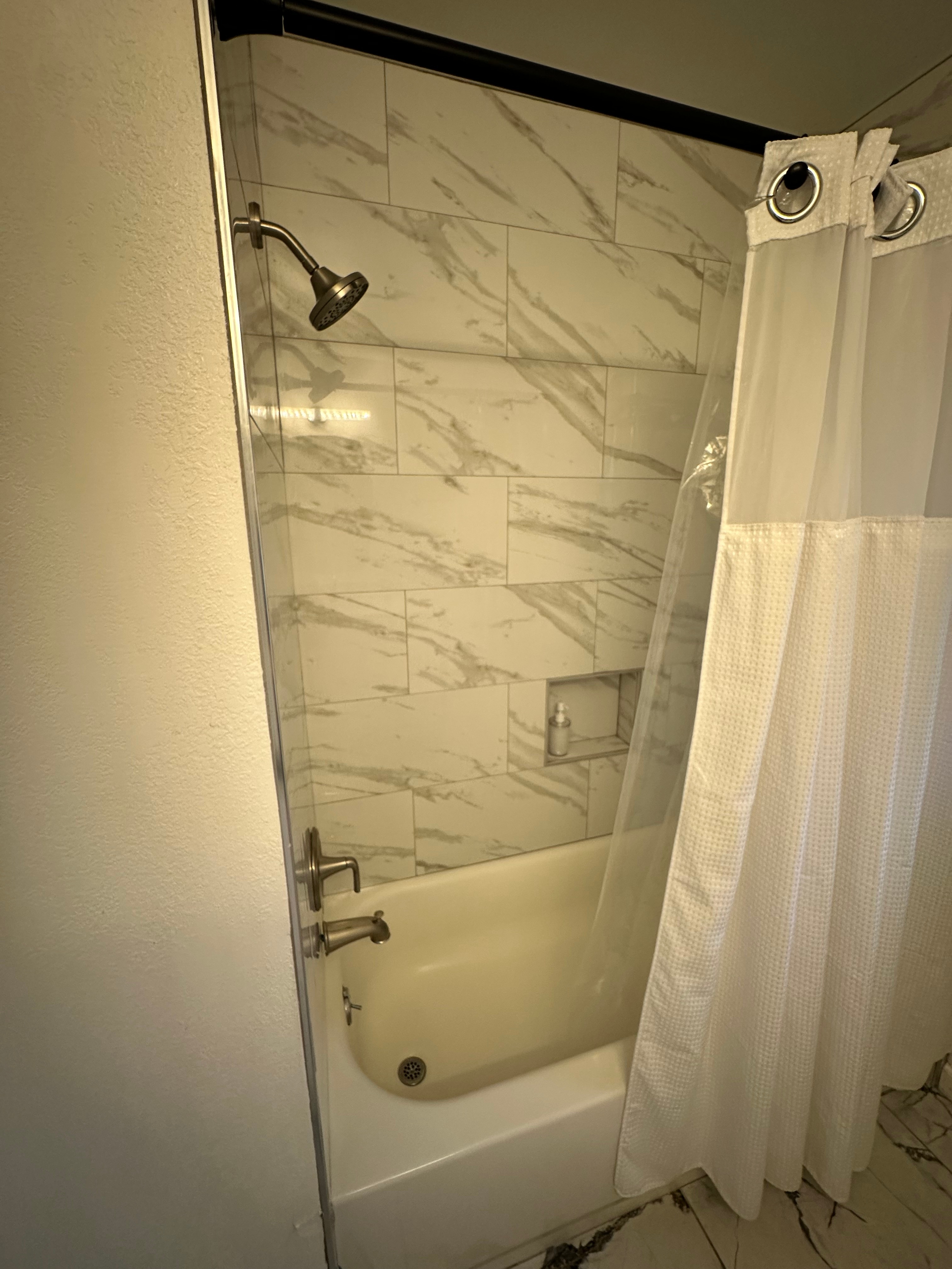 The FLoor is porcelain 24 inch tile and both bathrooms are tiled walls ;new large baseboards . Master shower walk in.