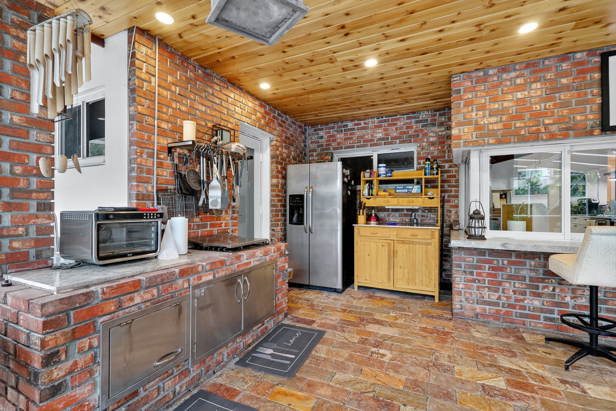 Indulge in your private outdoor oasis featuring a rectangular pool plunging to a thrilling 9.5-foot deep end, surrounded by a protective pool cage enclosure and elegant Travertine tile decking that extends to the lanai. Fire up the outdoor natural gas kitchen for al fresco dining, or entertain effortlessly from the full wet bar with pocket doors that open directly to the pool area, creating an indoor-outdoor flow that’s perfect for gatherings.