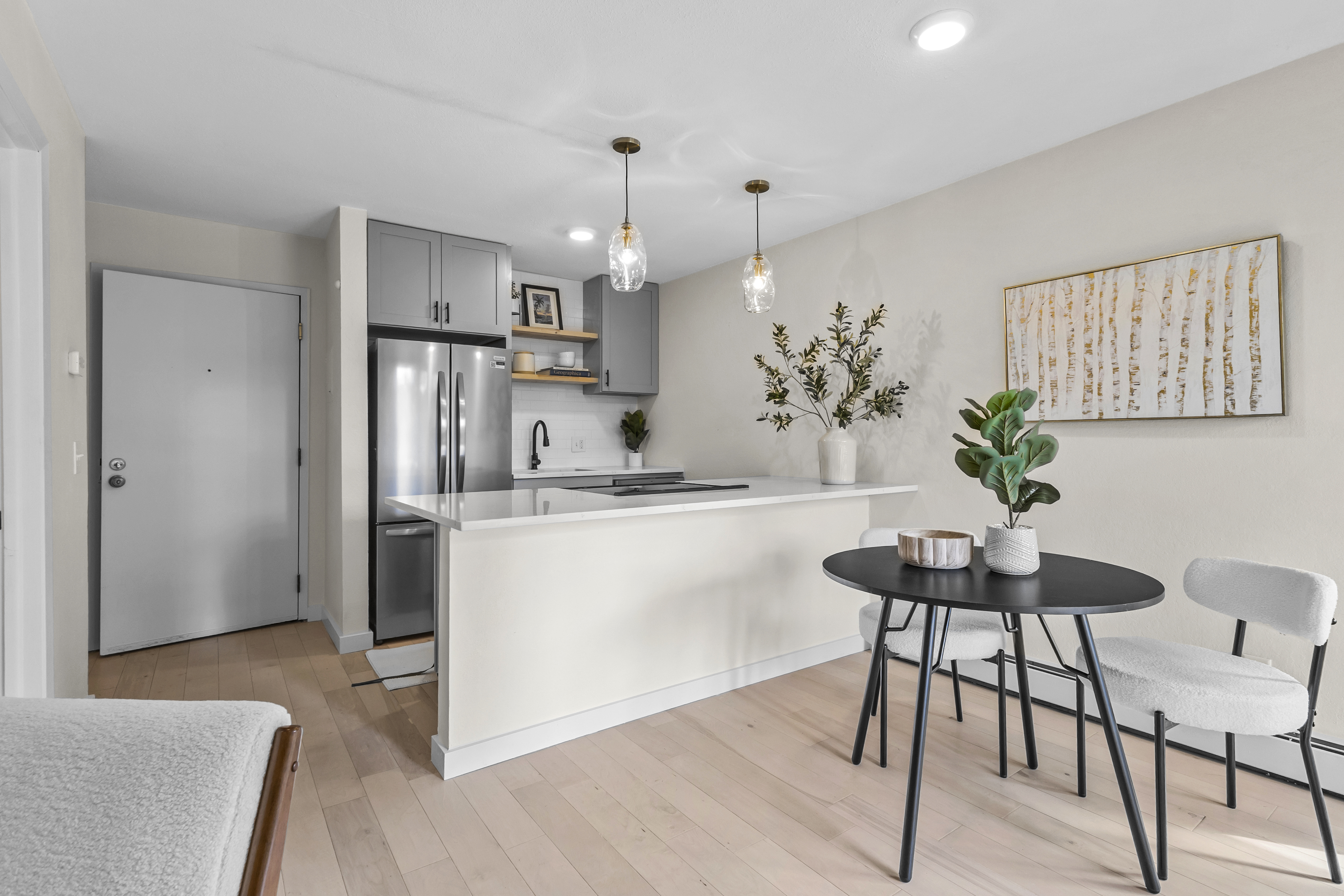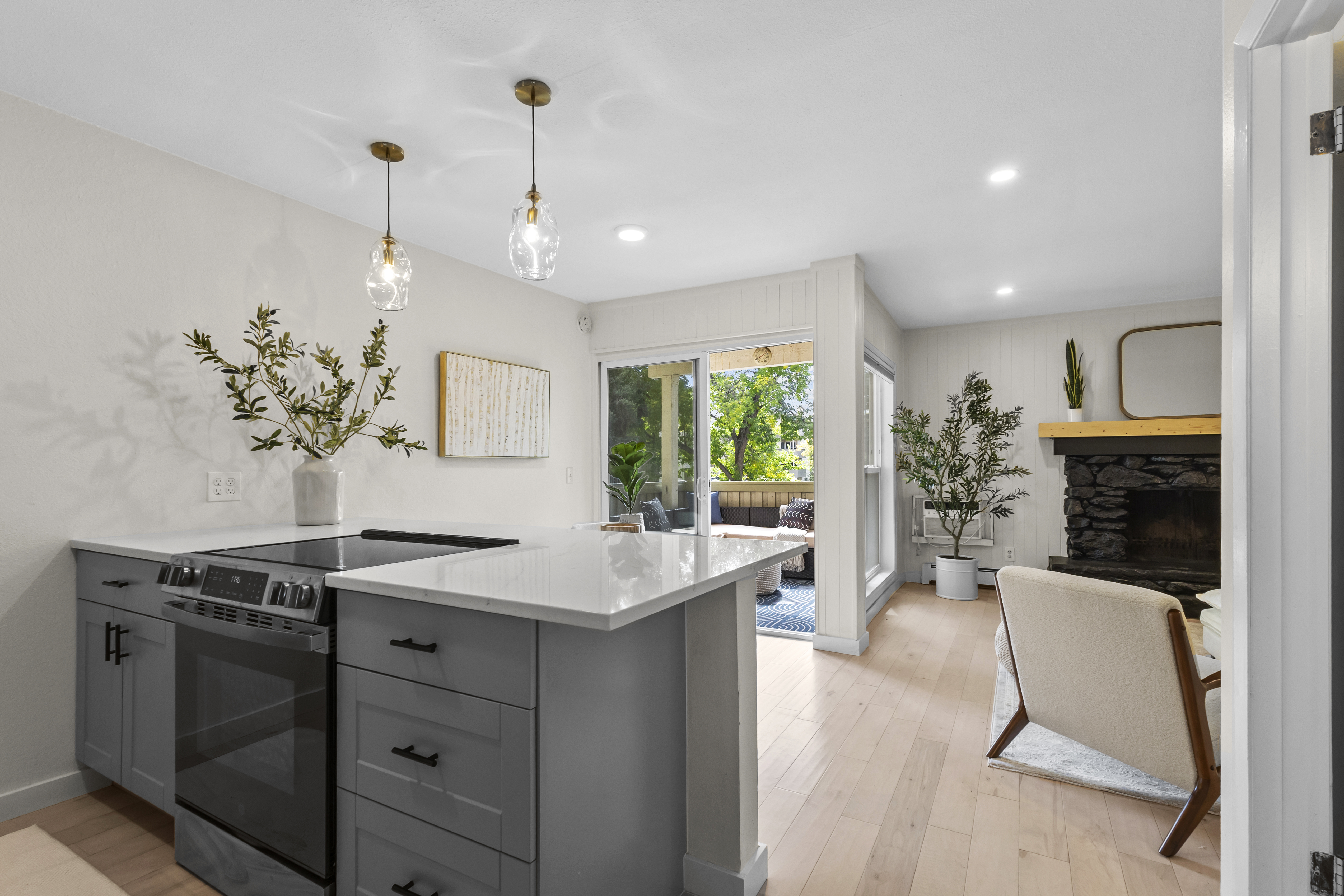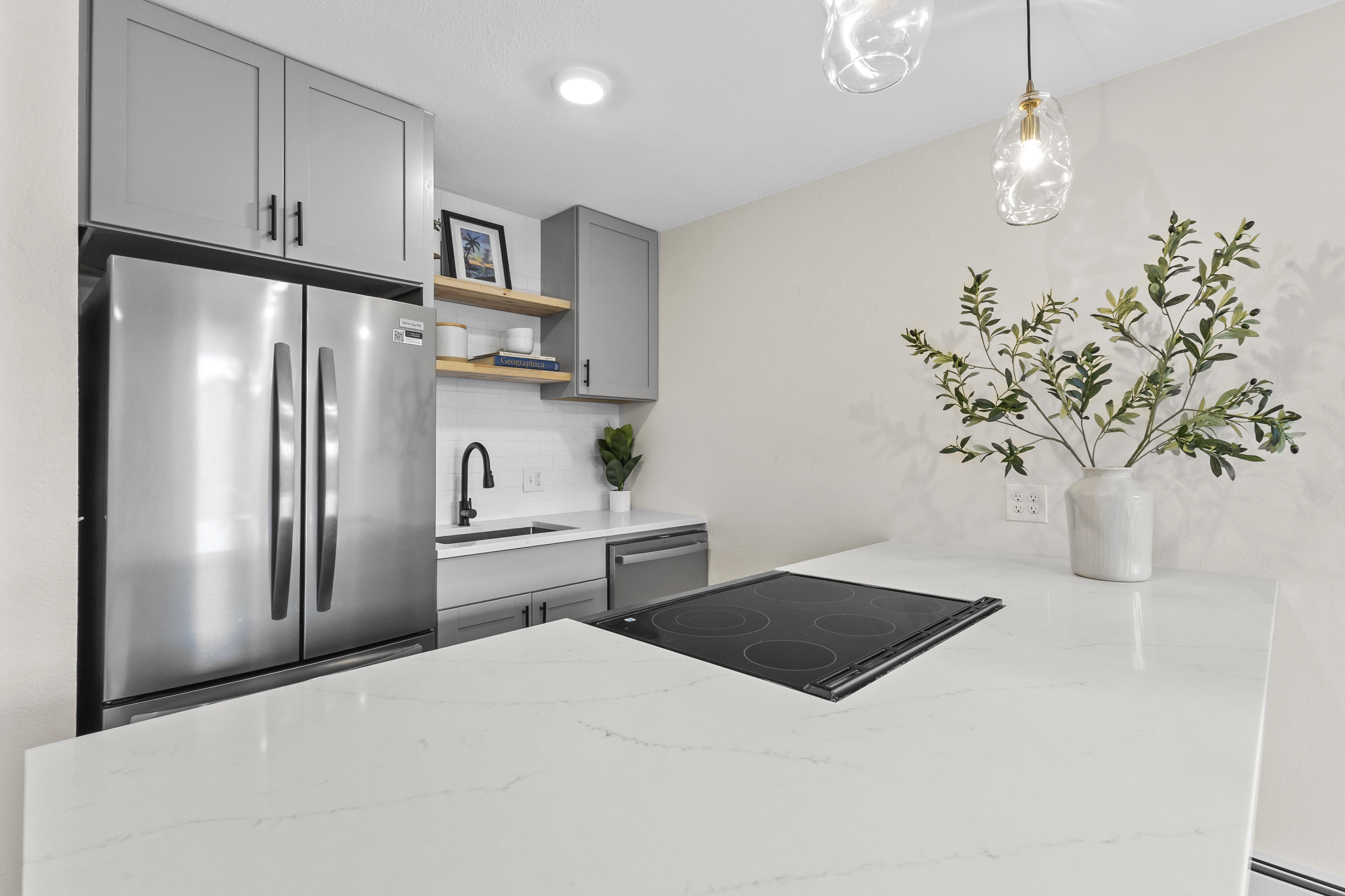 Welcome to this bright, open-concept home that blends modern design with comfort. Recently renovated, this stylish unit features sleek quartz slab countertops, stainless steel appliances, and contemporary gray shaker cabinets that elevate the kitchen's appeal. The full remodel shows with clean lines and a fresh, updated feel throughout the home.
