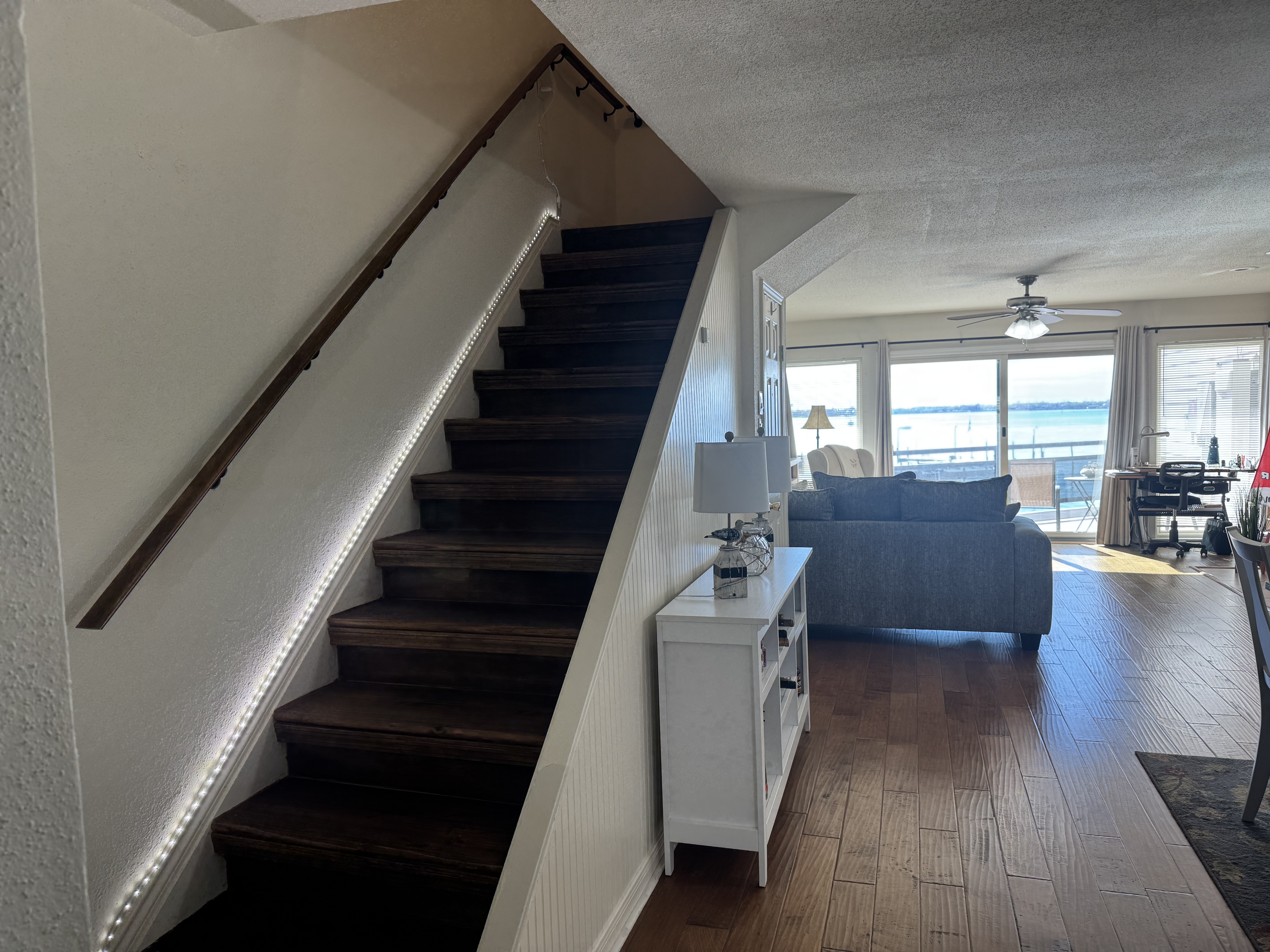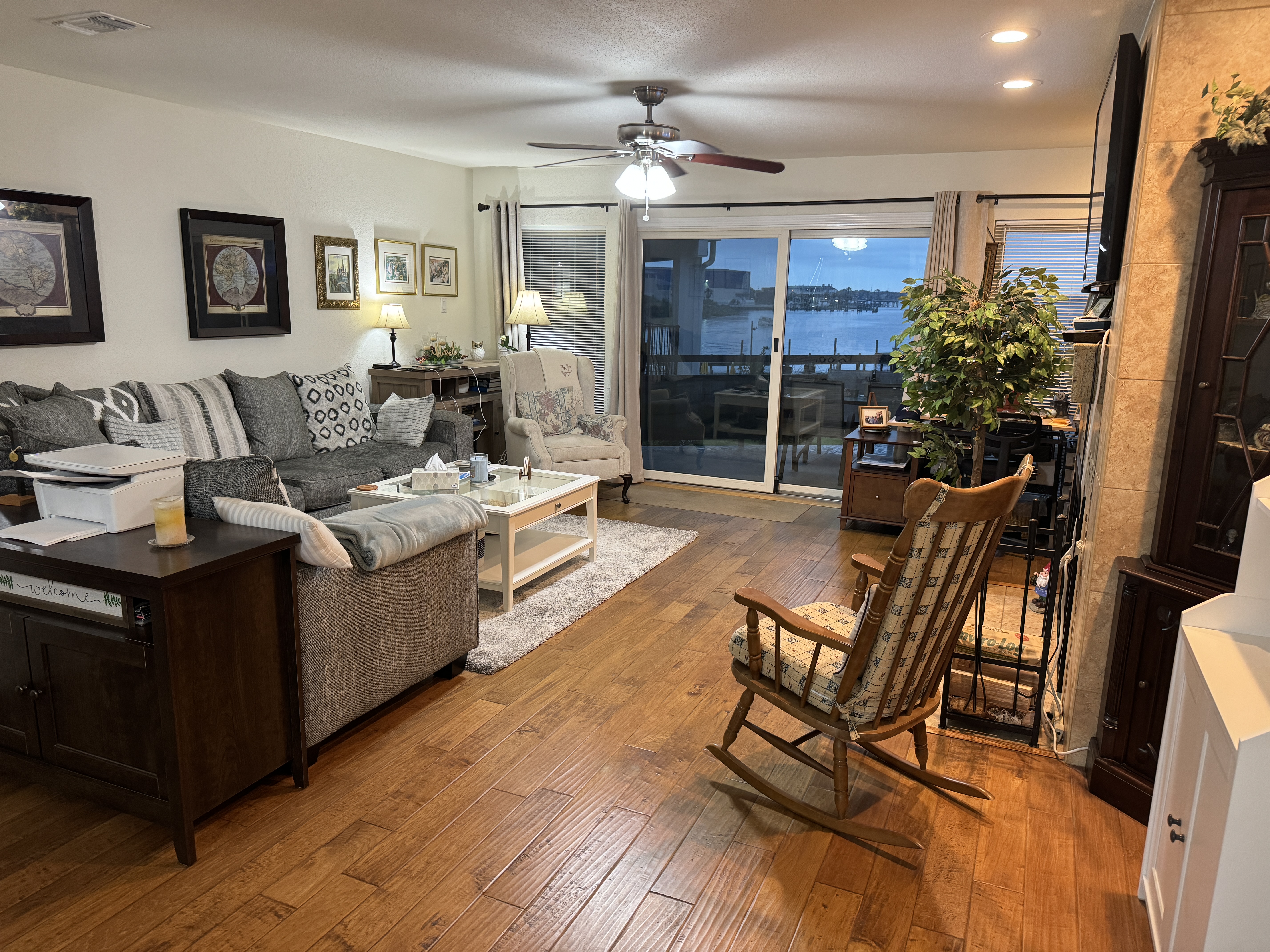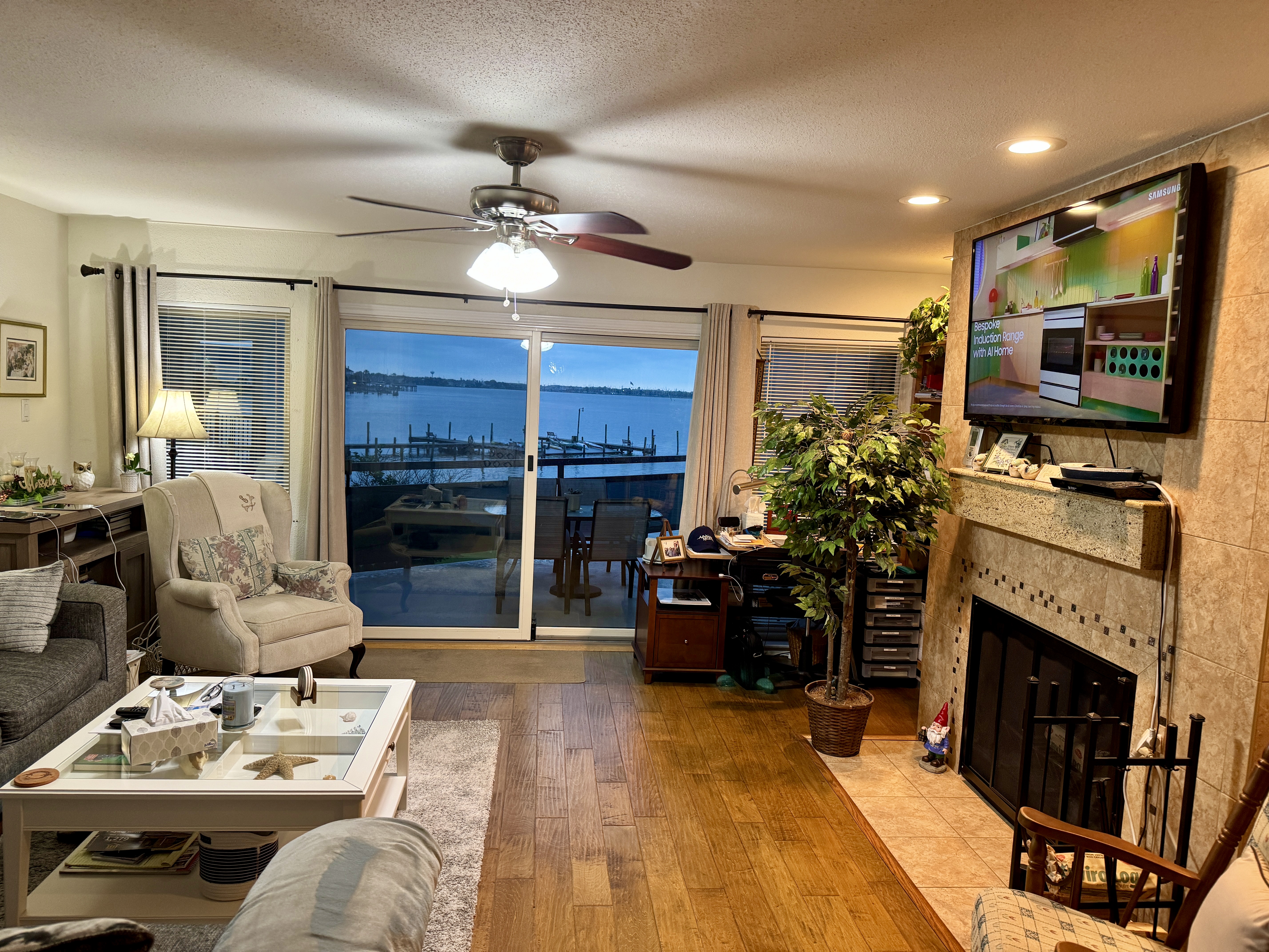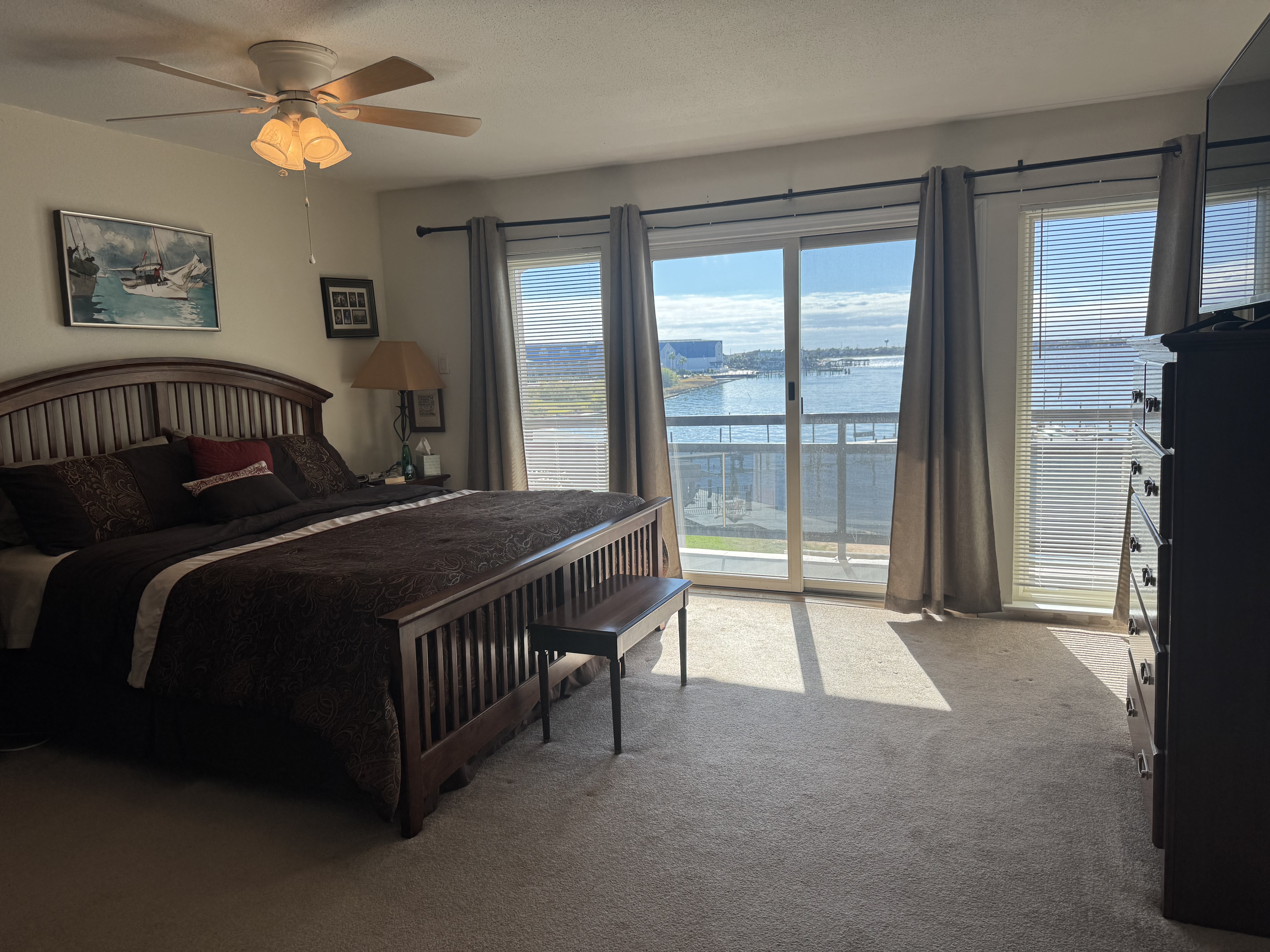 Beautiful Waterfront 2 Bed and 2 1/2 Bath townhouse. The townhouse has three levels. Open concepts kitchen, dining and living room are on one level with a 1/2 bath and a huge balcony facing Clear Lake with wonderful views and sunrises. The upper level contains master bedroom with en suite bathroom, two sinks, walk in shower, and a jetted bathtub, as well as linen closet and a closet with sliding doors. The master bedroom also has its own balcony viewing the lake. The guest bedroom also has an en suite bathroom including a walk in shower. The guest room also has a walk in closet. The lower level has three storage spaces and car port space for 2-3 cars; there is also a deck with views to the lake and a great place to watch outdoor TV. The common area includes a pool, tennis court, hot tub, and our own harbor has a boat slip waiting for your boat. The association collects insurance fees.