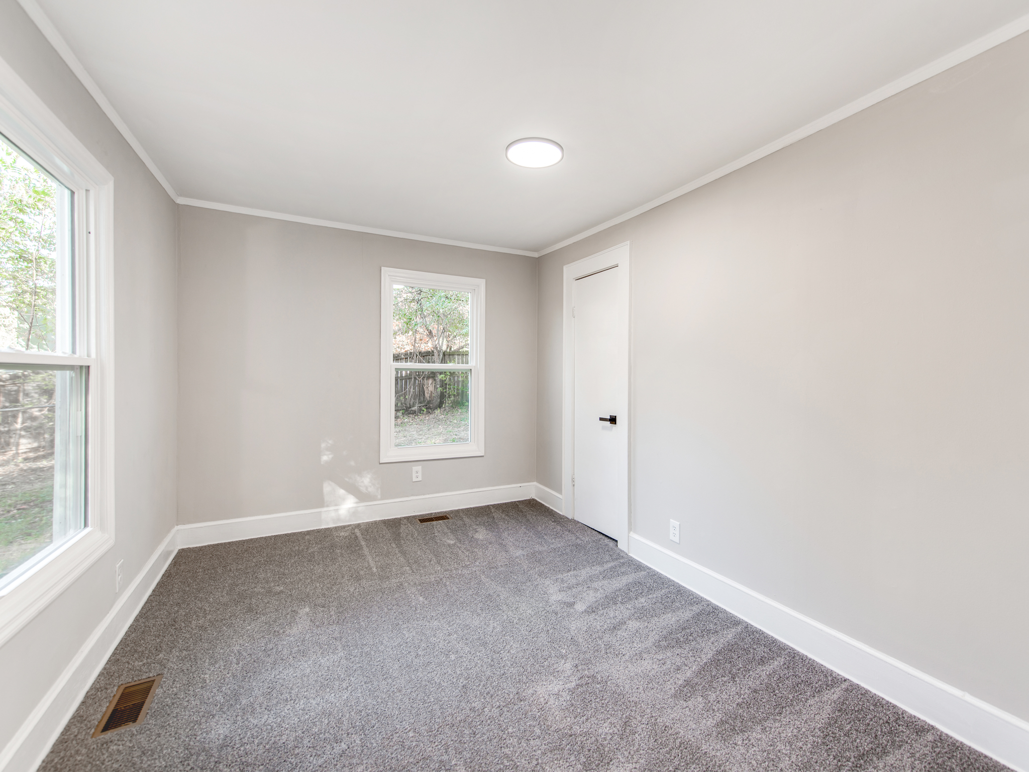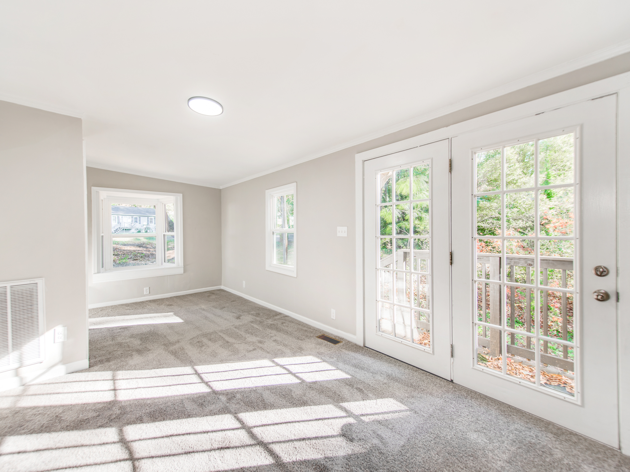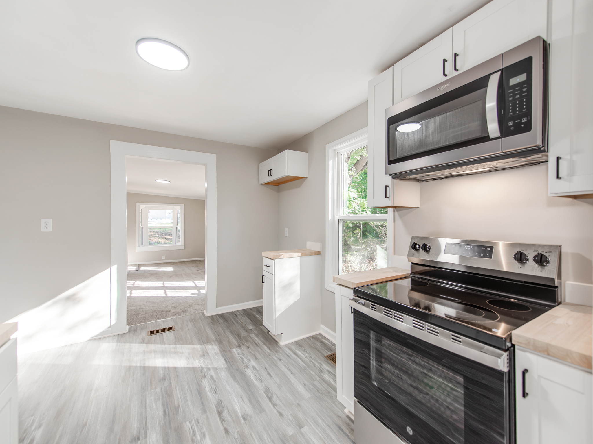 Set on a beautiful 1.4-acre lot, this completely renovated ranch-style home offers the perfect blend of space, comfort, and modern design. With approx. 1,400 sq ft, this 2BR/1BA residence is move-in ready and shines with all-new paint, carpet, luxury vinyl plank flooring, lighting, and fixtures throughout. The kitchen features new cabinets, countertops, and stainless appliances with open flow to the dining area and living room. Updated bathroom, new HVAC, plumbing, and electrical provide worry-free living. Enjoy a covered front porch for relaxing and a spacious back deck overlooking a super-sized, level yard—ideal for gardening, entertaining, or outdoor recreation. The expansive lot offers plenty of room for future additions, play, or privacy. Located in a quiet, established neighborhood near parks, schools, shopping, and downtown Greensboro. This beautifully updated ranch delivers space, efficiency, and charm both inside and out, ready to welcome you home.