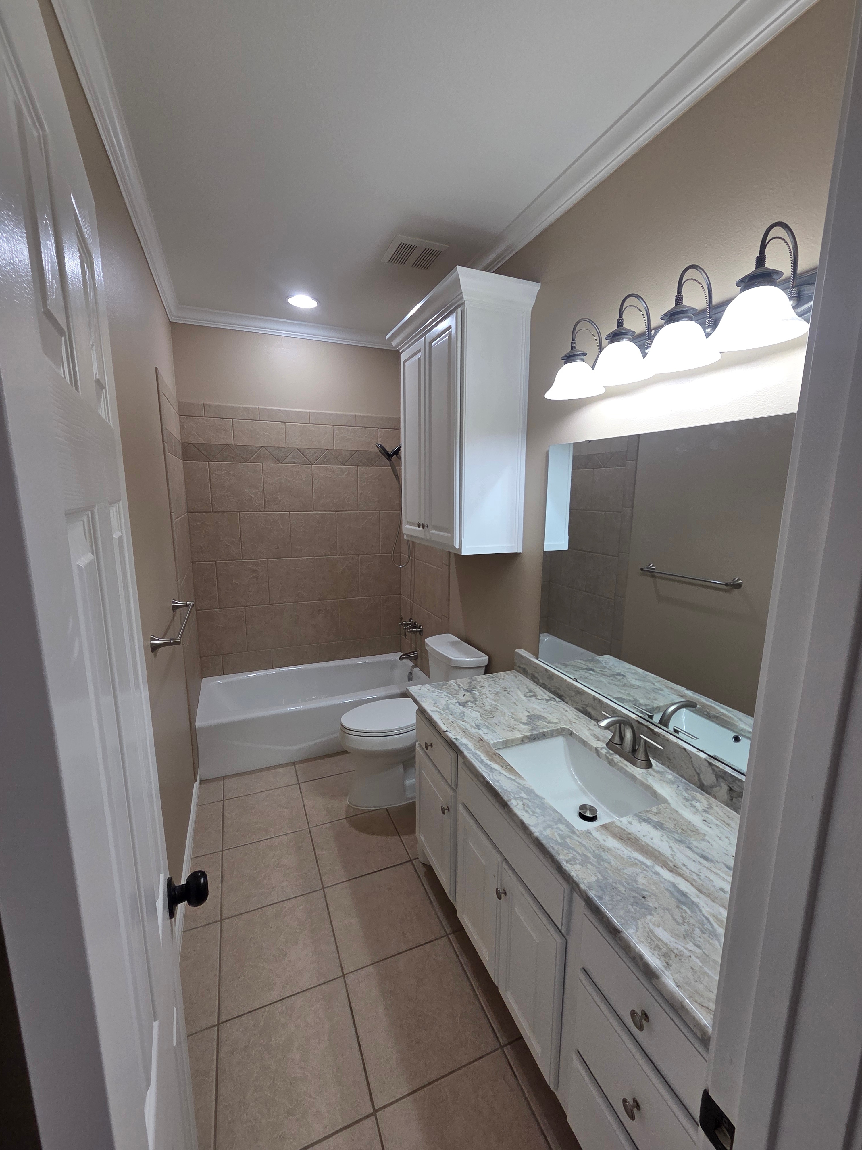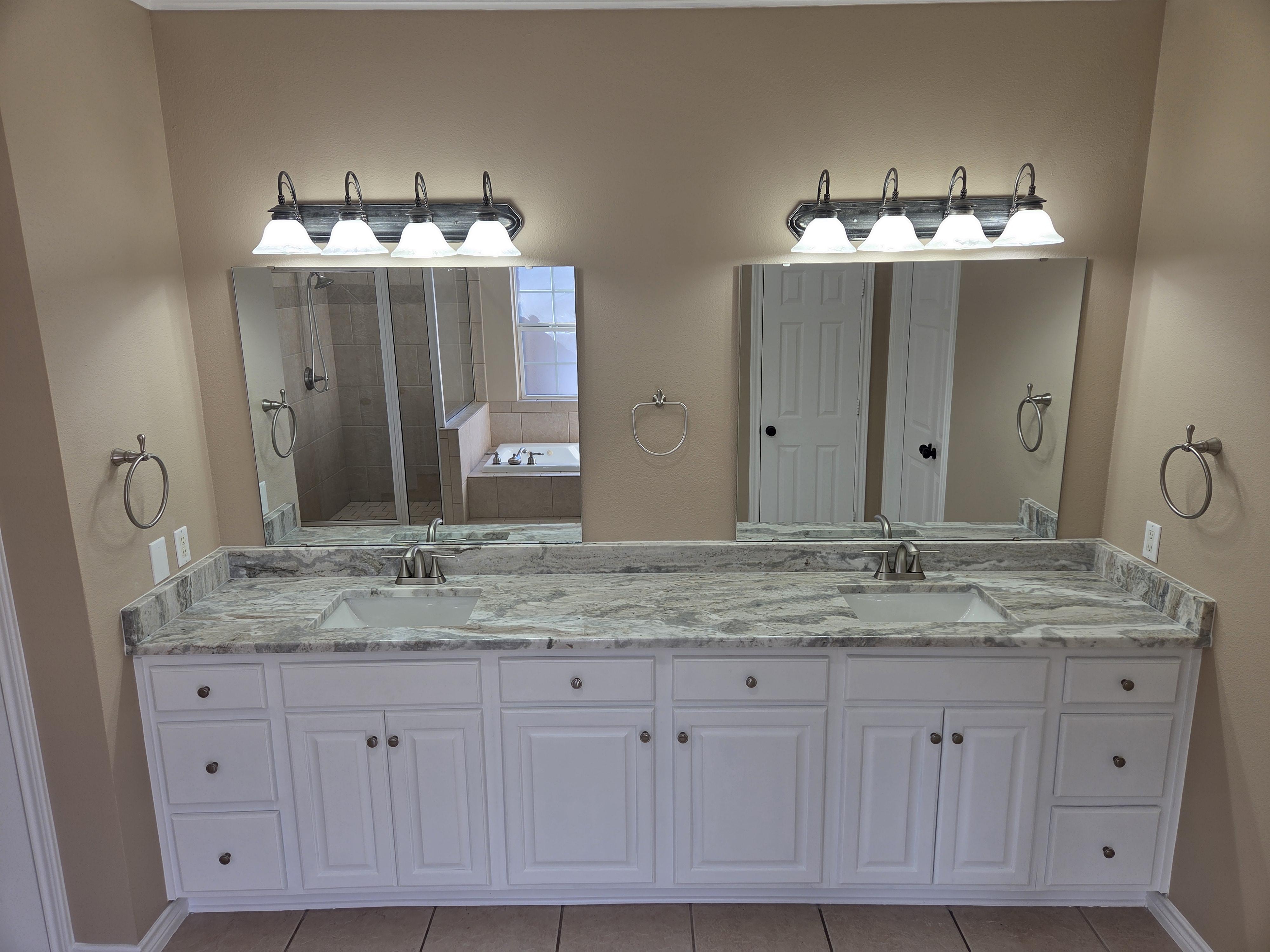 Bathroom cabinets recieved a fresh painting to brighten it up! New marble countertops, faucets, showerheads, and mirrors were added.