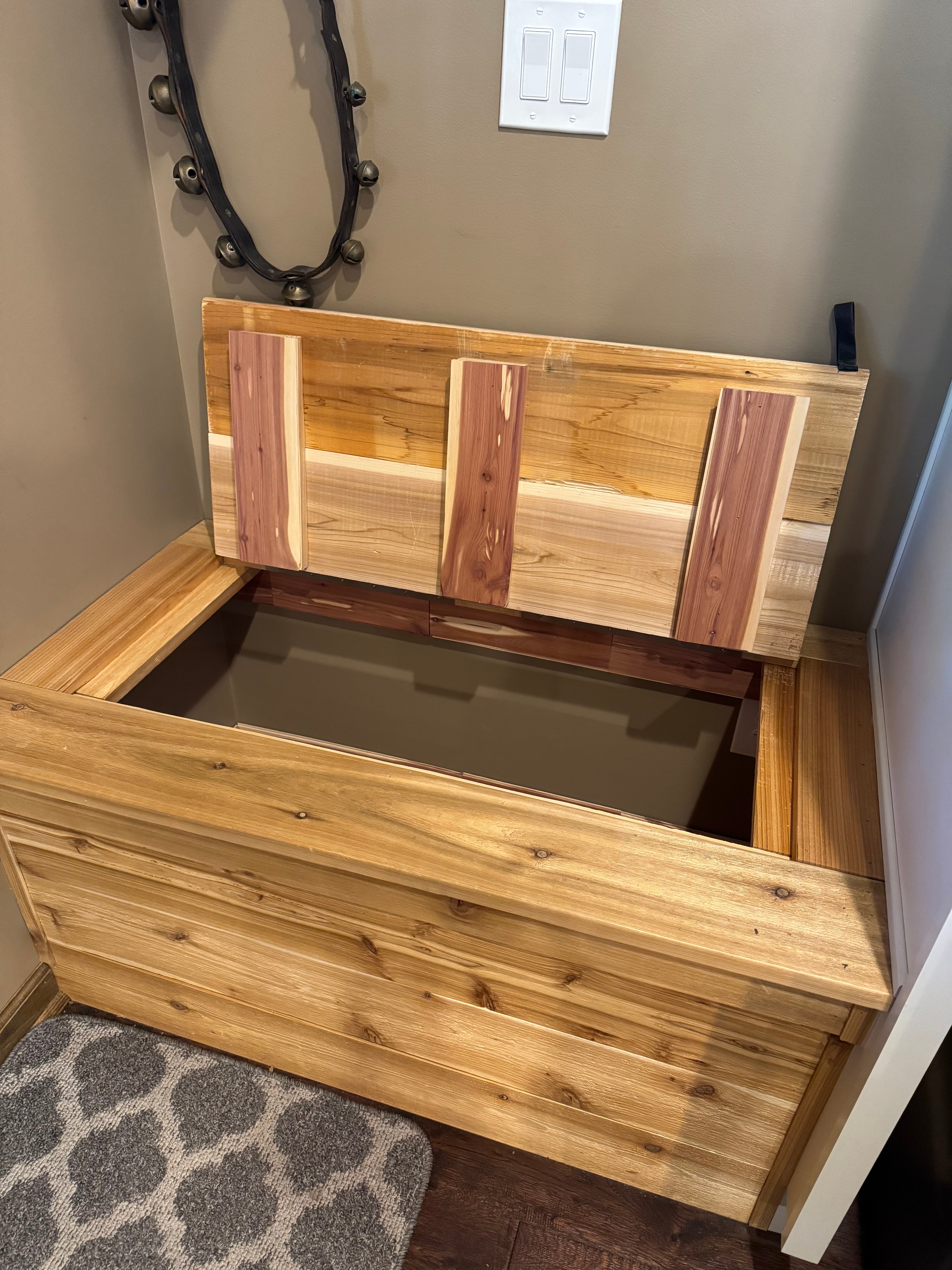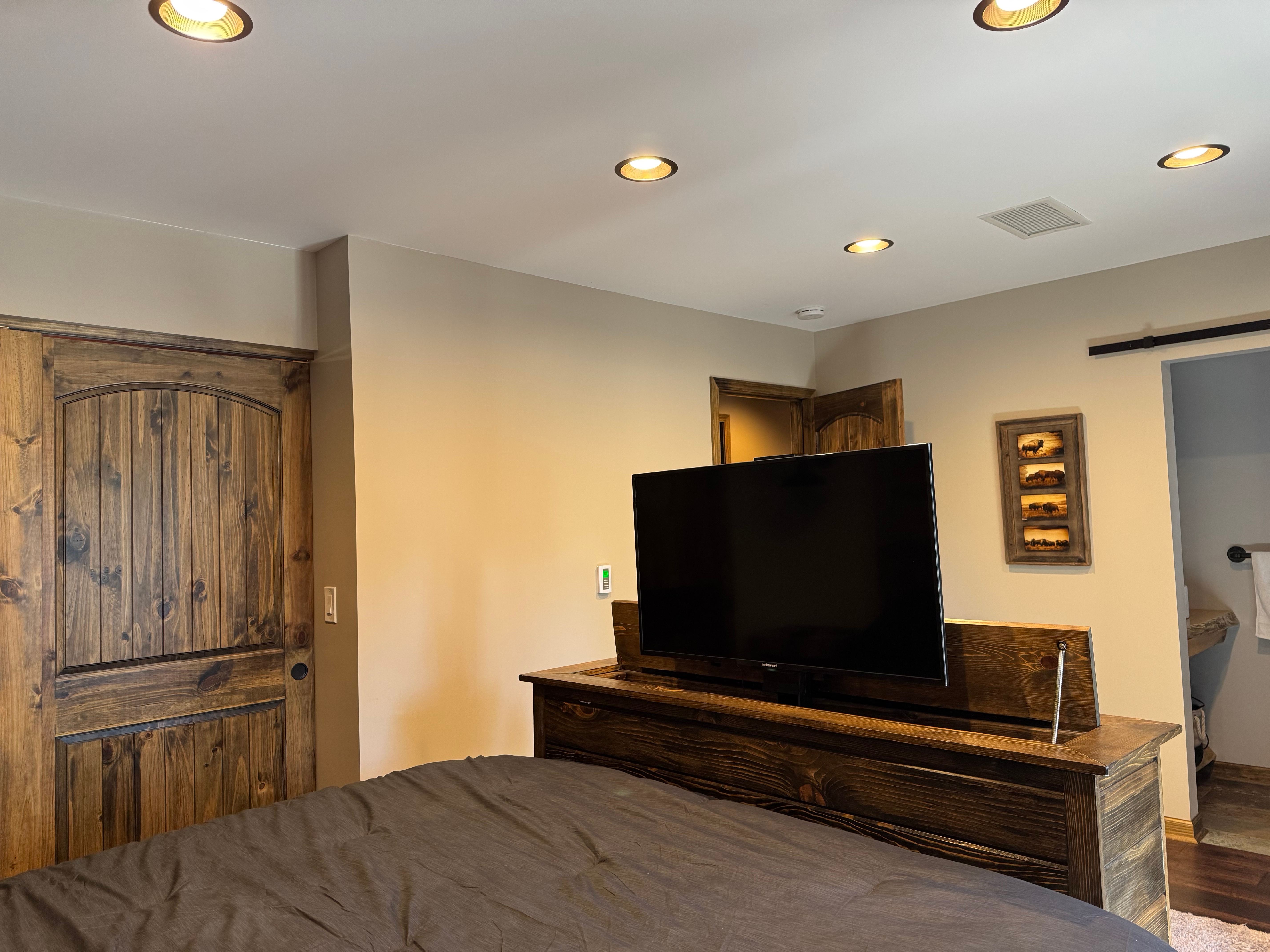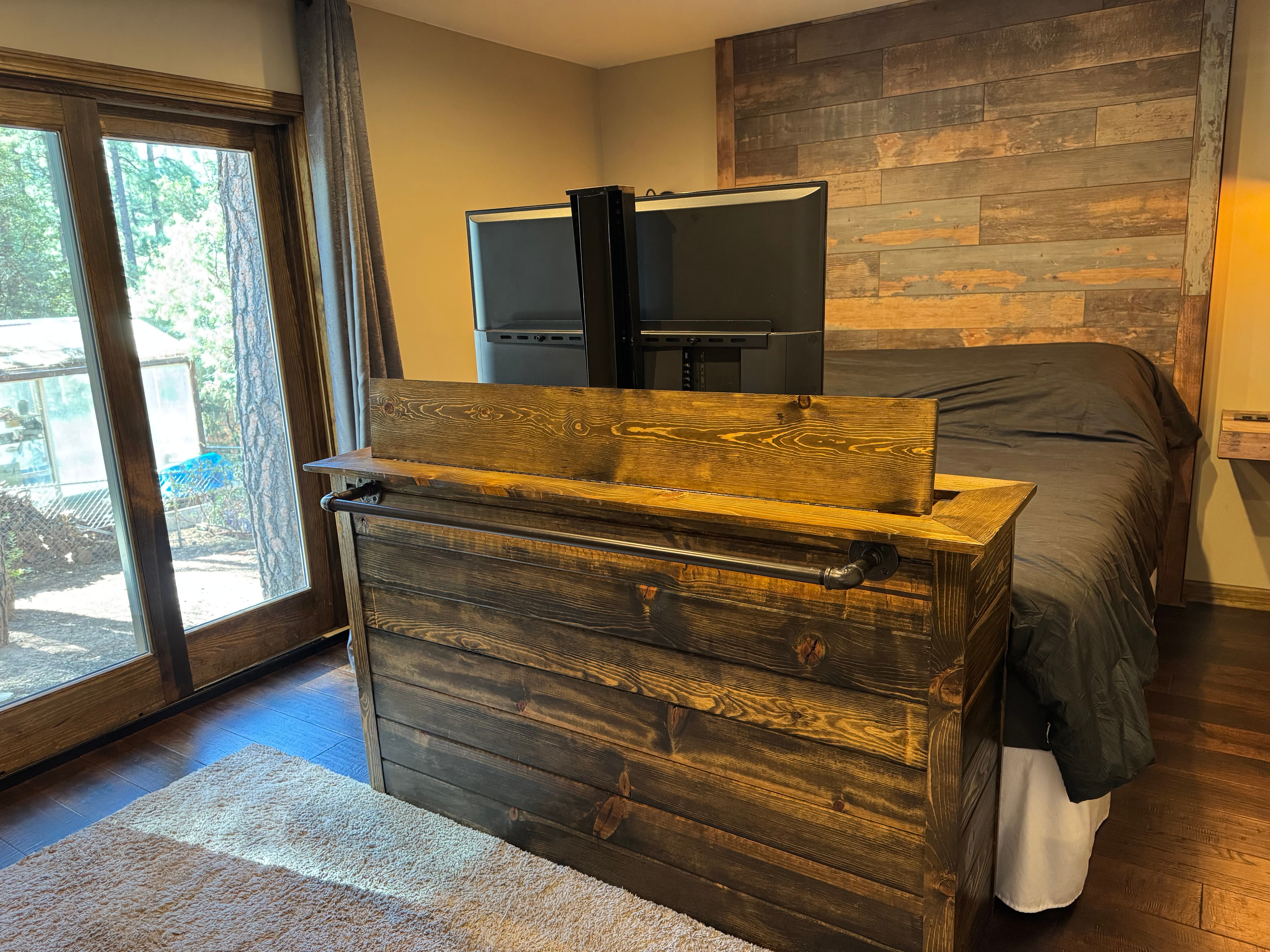 Inside, you'll be wowed by 3 spacious bedrooms, each with cedar-lined closets and plenty of storage for all your needs. There’s even a lovely custom cedar-lined storage bench right at the entrance—perfect for stashing away your shoes, boots, and outdoor gear after a fun day exploring the mountains. Plus, the primary suite comes with a remote-controlled TV stand that you can raise the tv when watching & lower when you want to hide that’s included with the home!