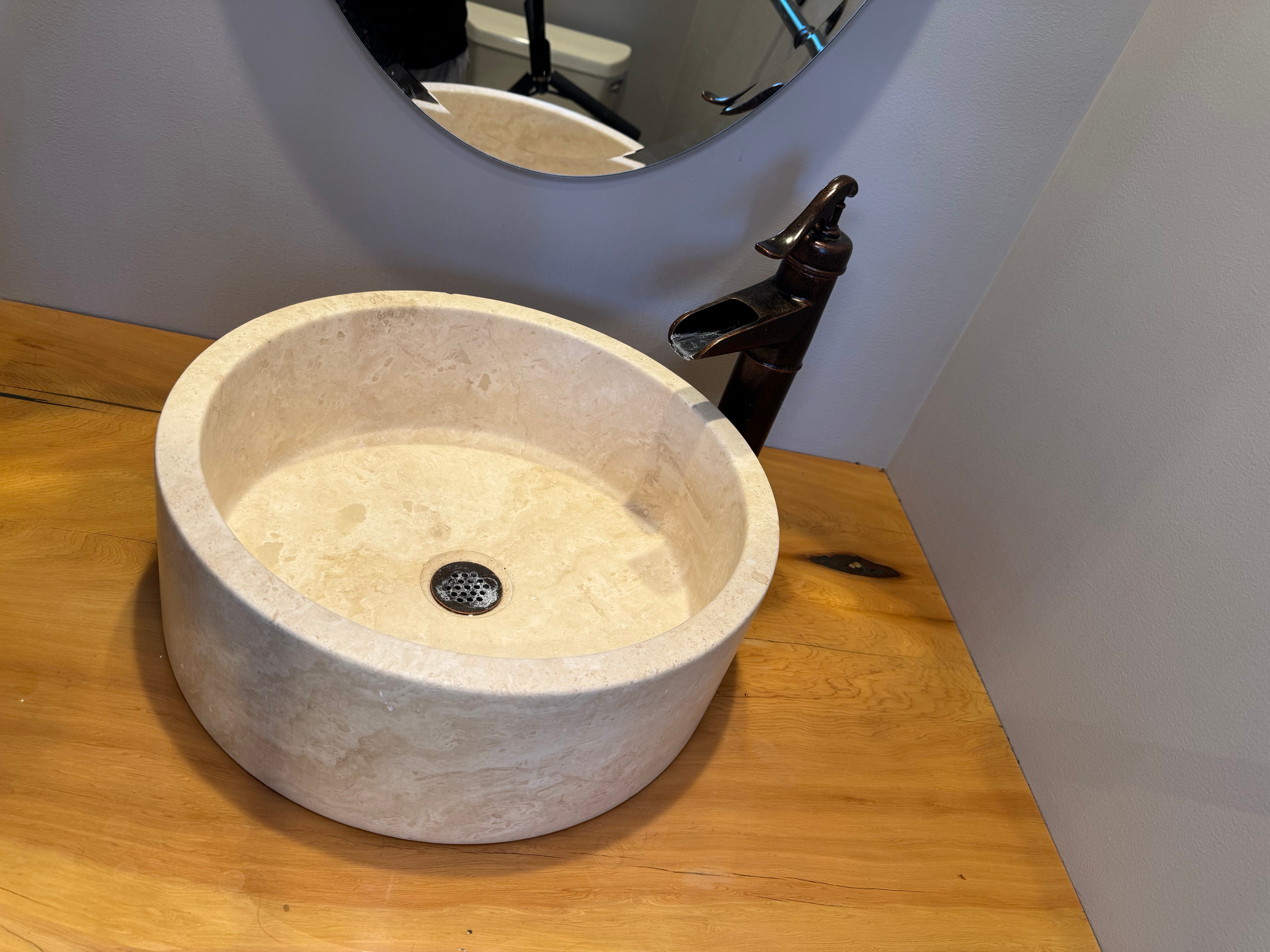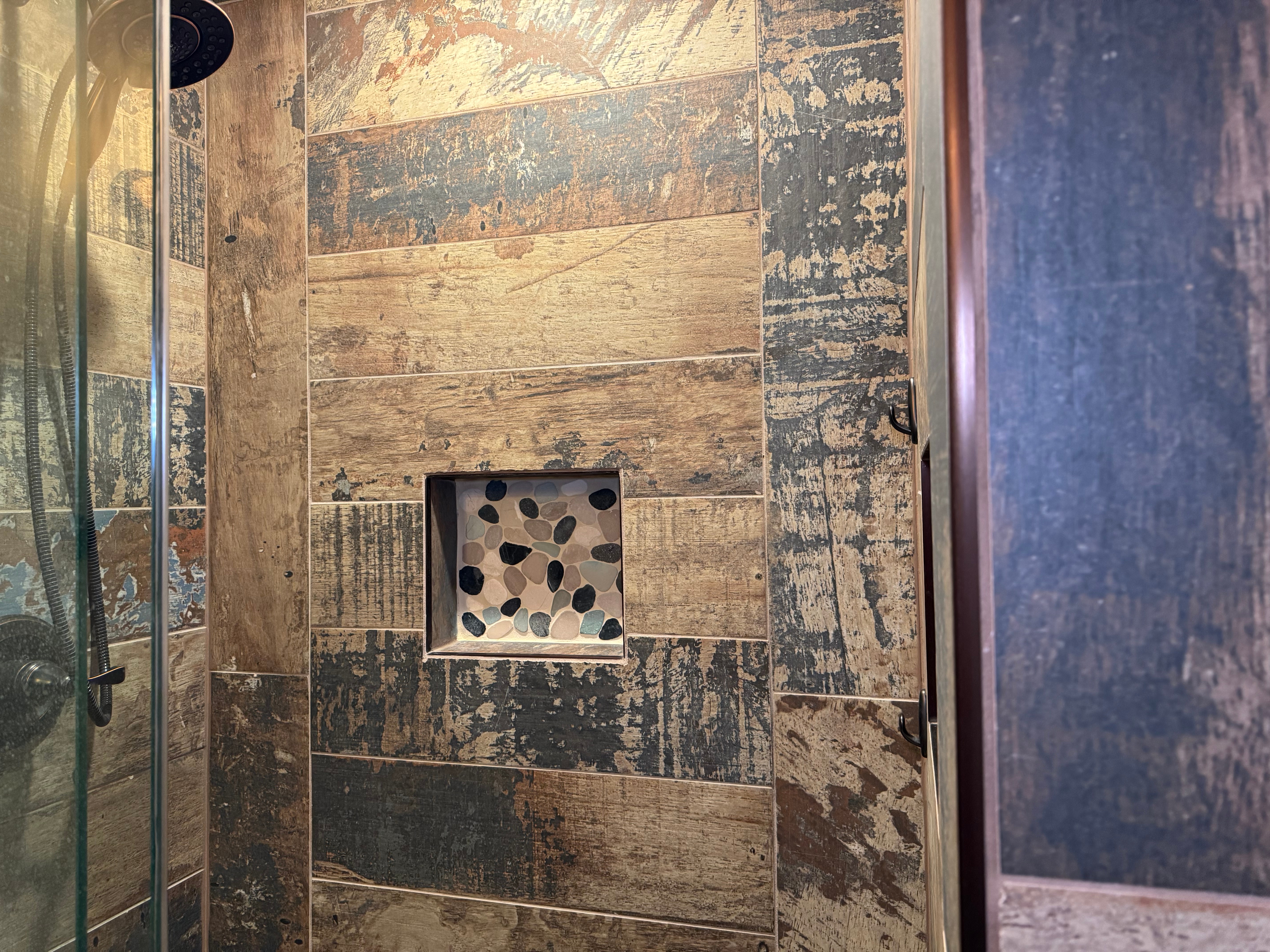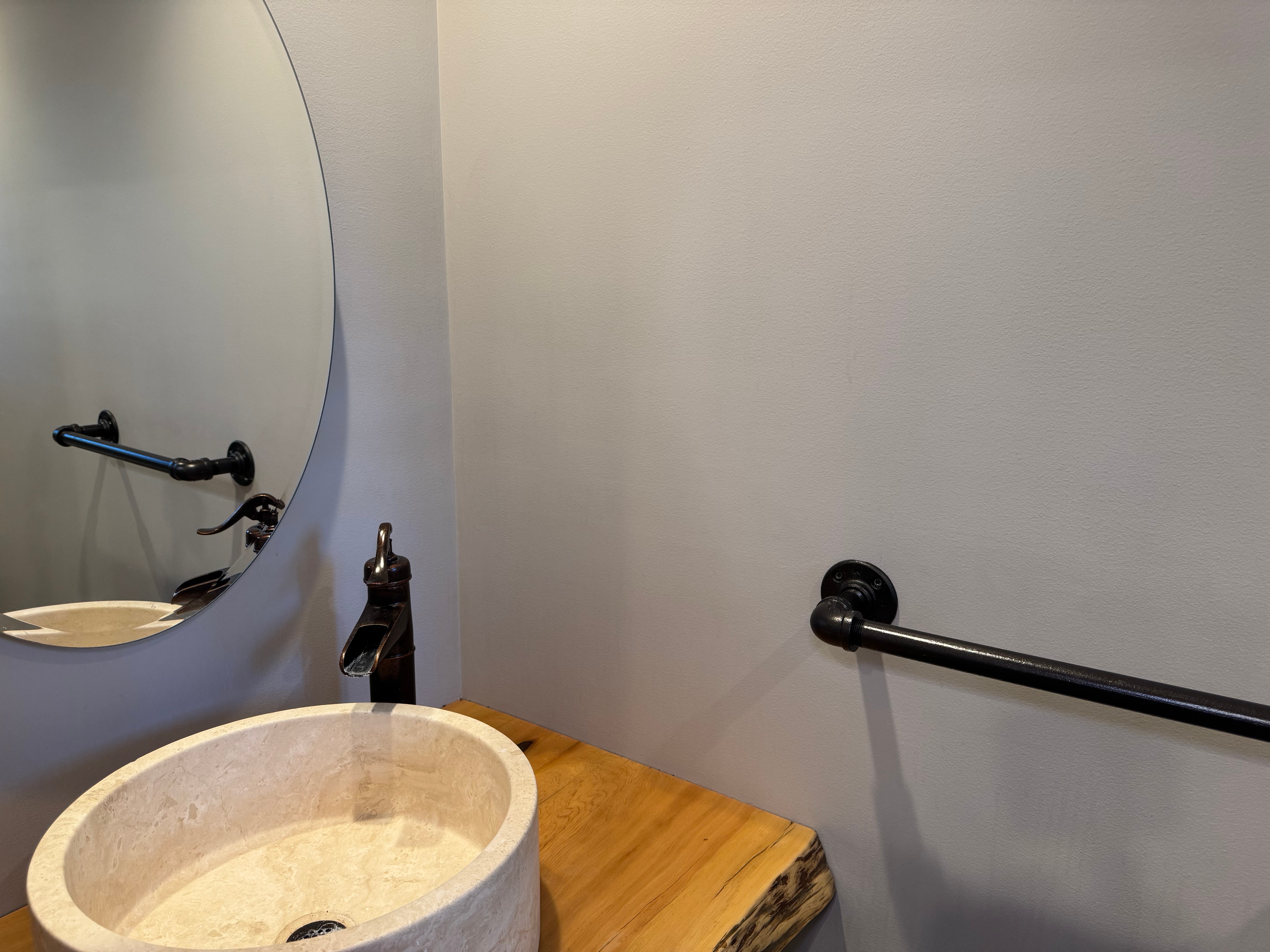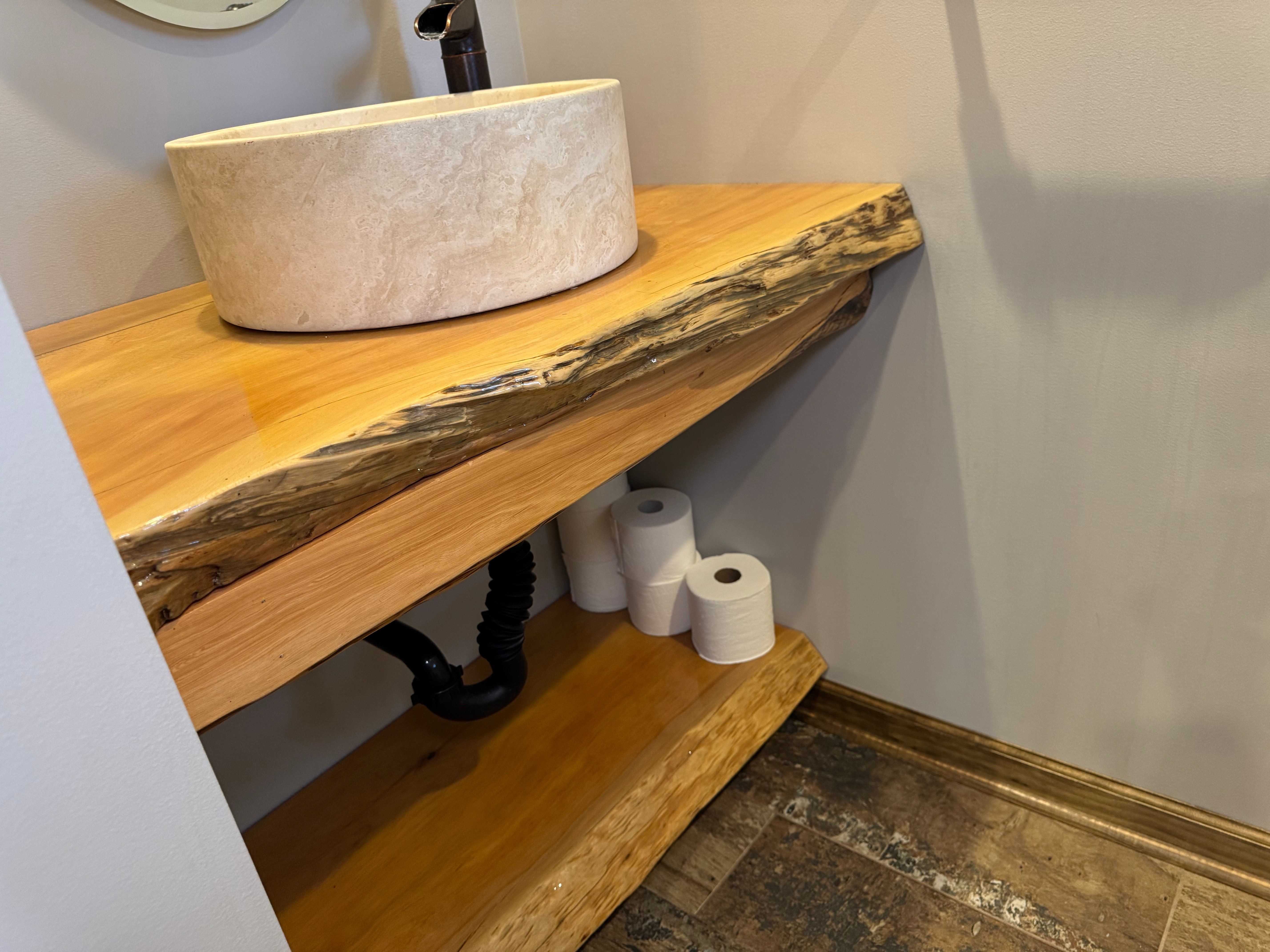 Gorgeous hardwood floors flow throughout the home, adding warmth and character to every space. The full bathroom boasts luxurious heated ceramic tile floors and a beautiful travertine vessel sink atop a live-edge wood countertop, while the half bath has the same lovely spa-inspired touches.