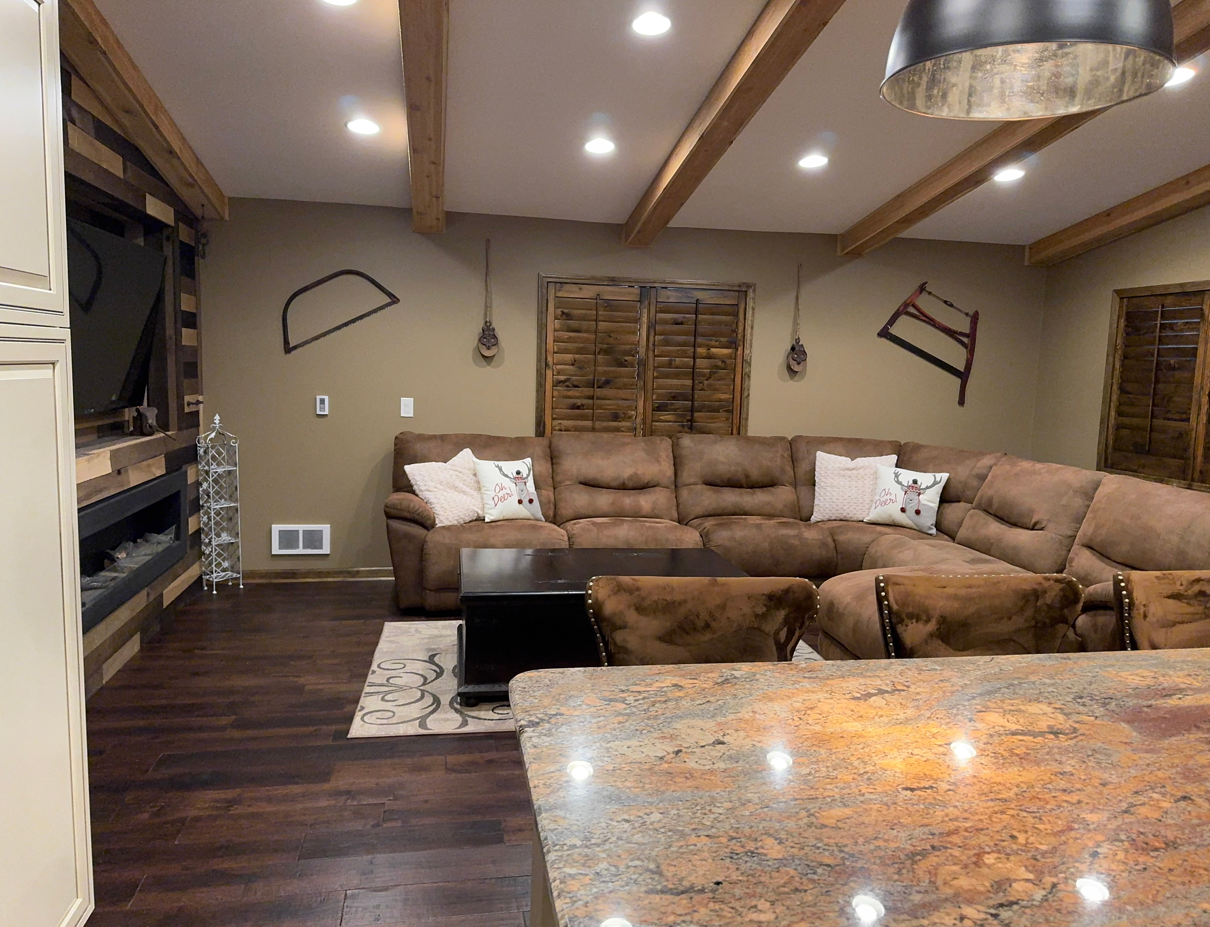 The expansive family room is warm and welcoming, featuring a cozy alcohol-fueled fireplace that sets the scene for relaxing nights or lively gatherings with friends and family.