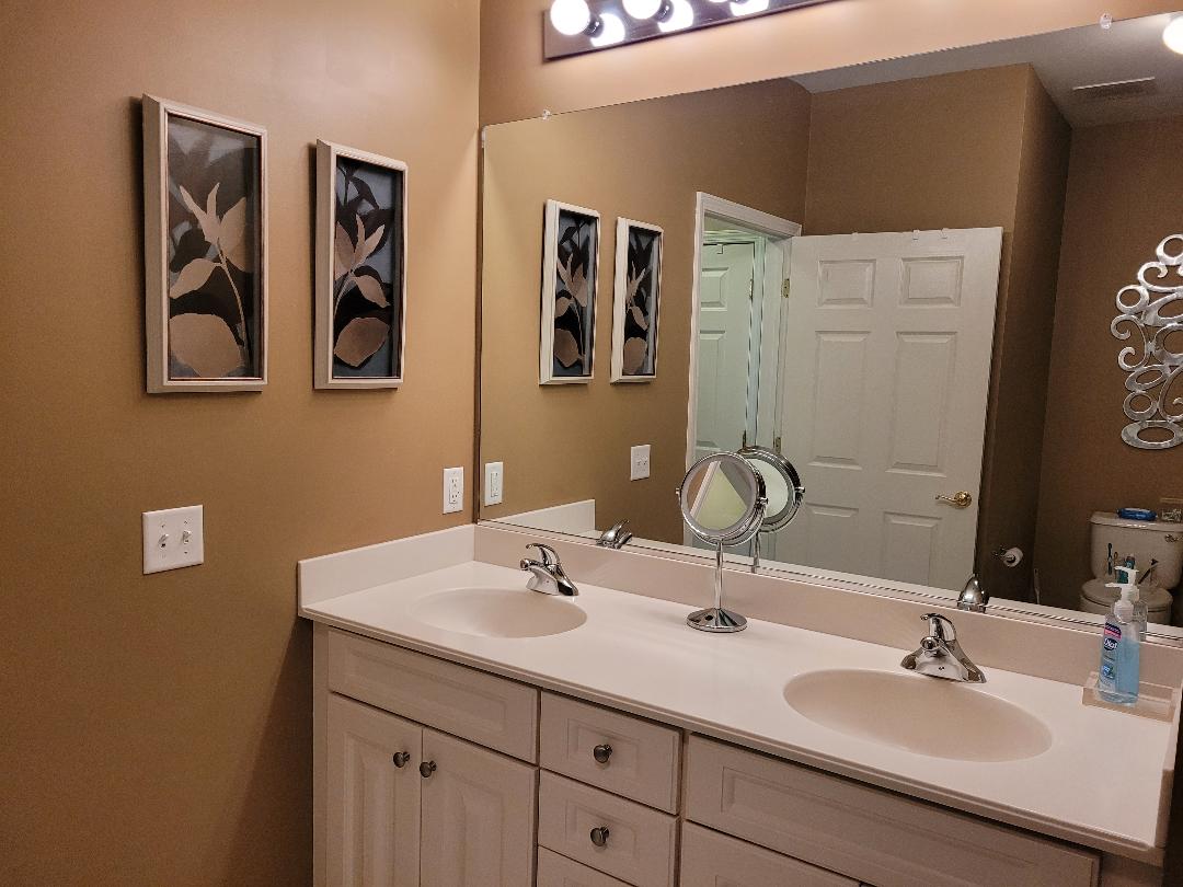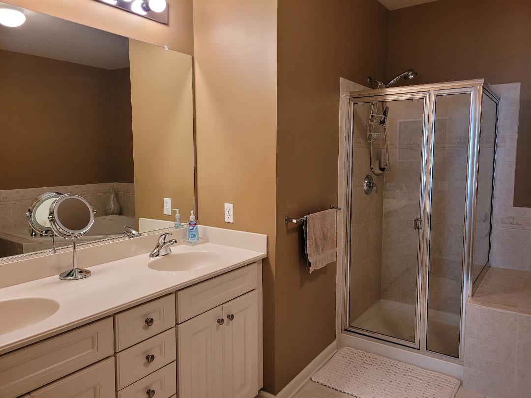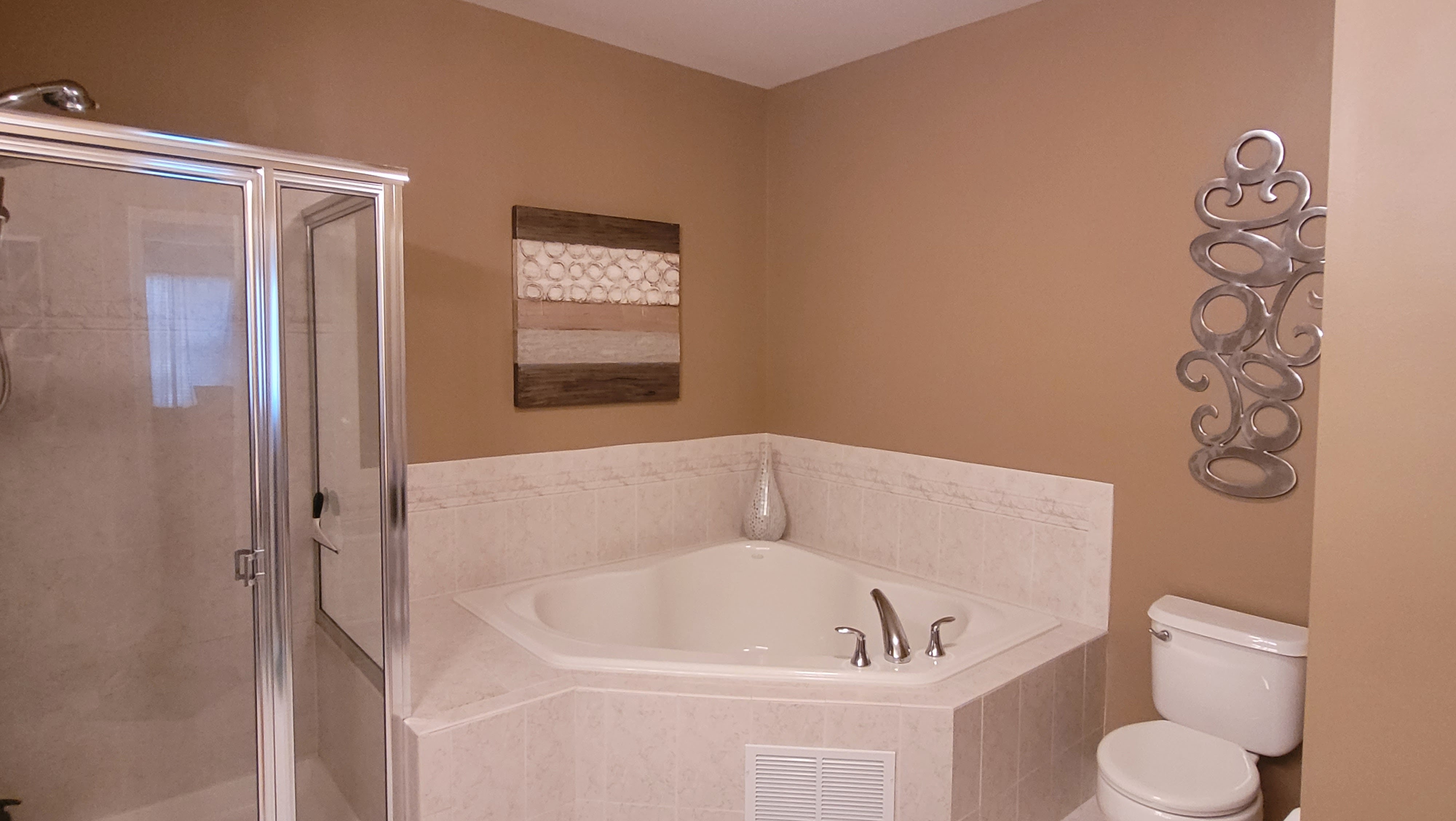 Home is 2800sf with finished basement featuring flex room, living and dining area and additional storage. Main floor has direct entry from attached one car garage into separate laundry room. 9 ft ceilings, beautiful hardwood floors throughout kitchen, dining and living room. Kitchen has upgraded, wood cabinets and newer appliances. Primary suite bathroom has upgraded dual vanity, a large soaking tub, stand up shower and a walk in closet. The second bedroom also offers plenty of room for guests. Guest bathroom is beautifully updated with glass shower enclosure.