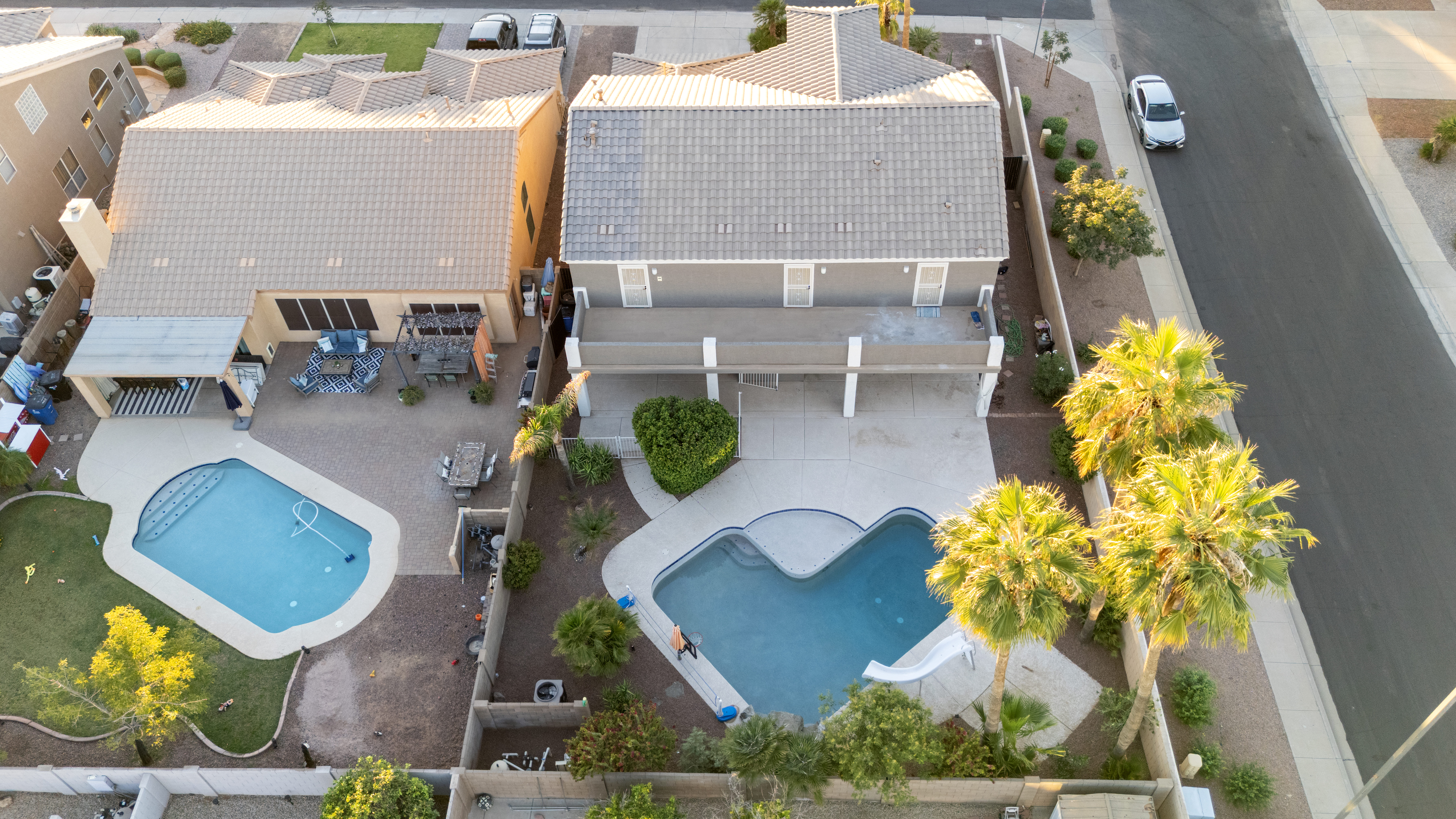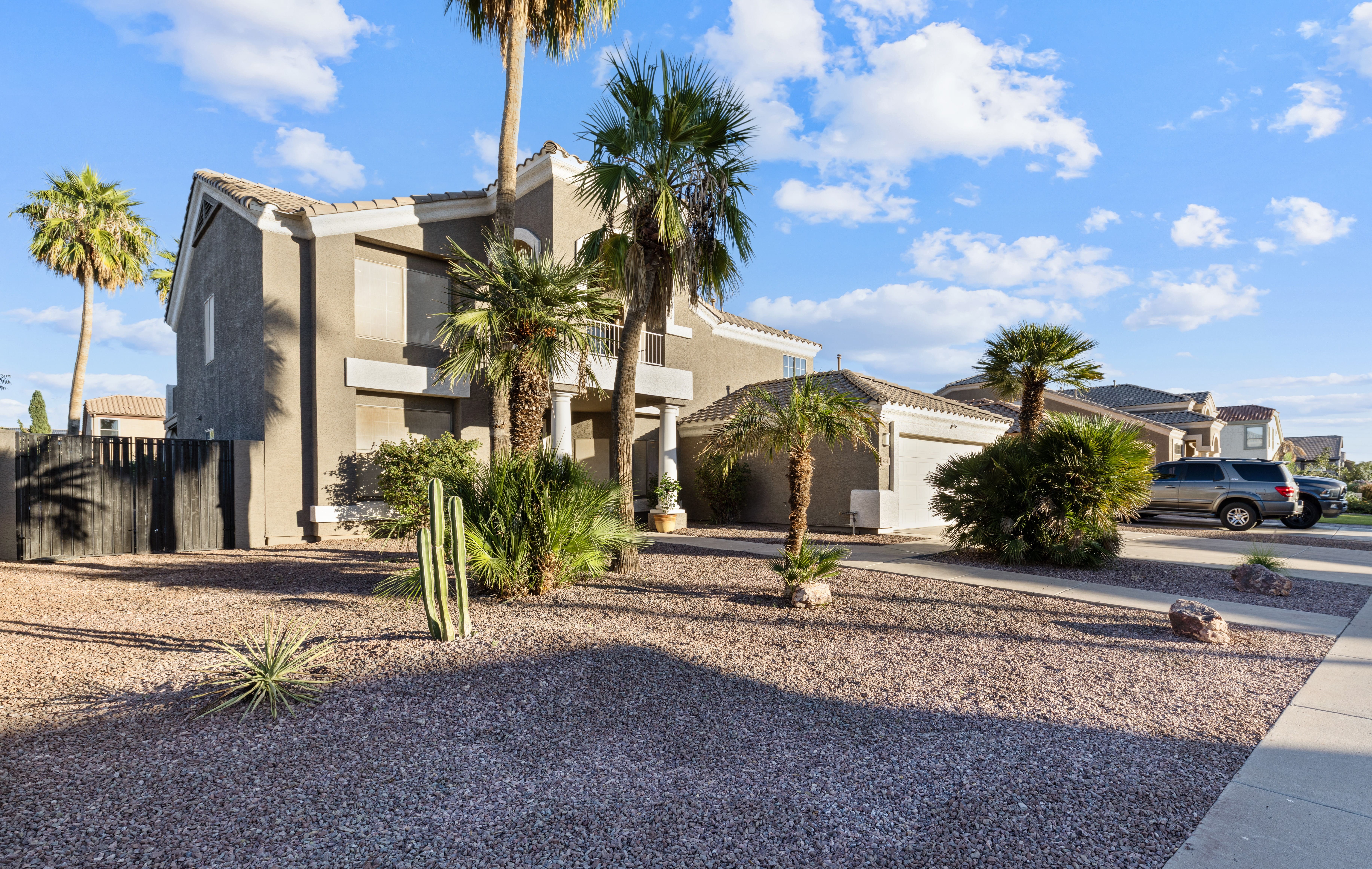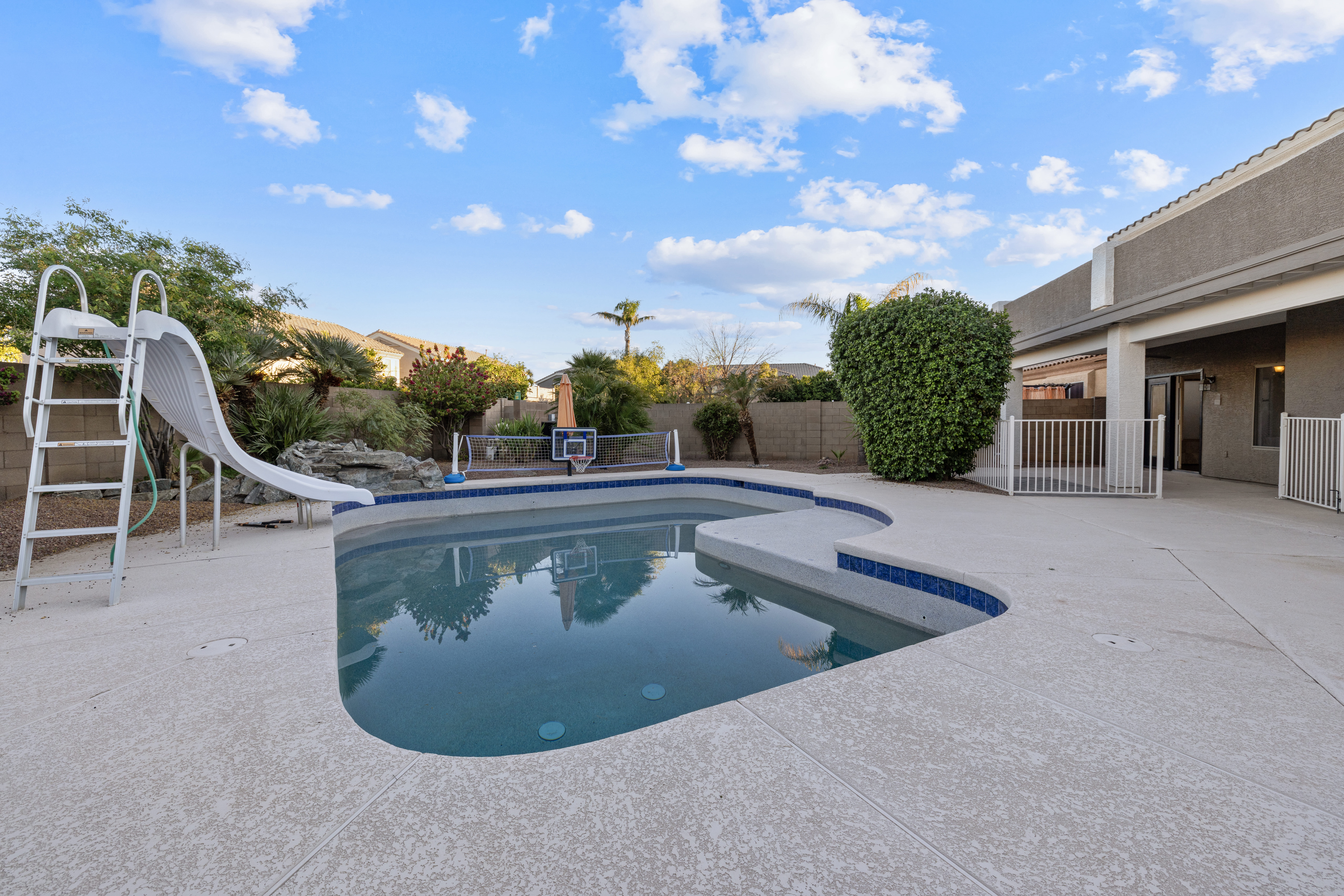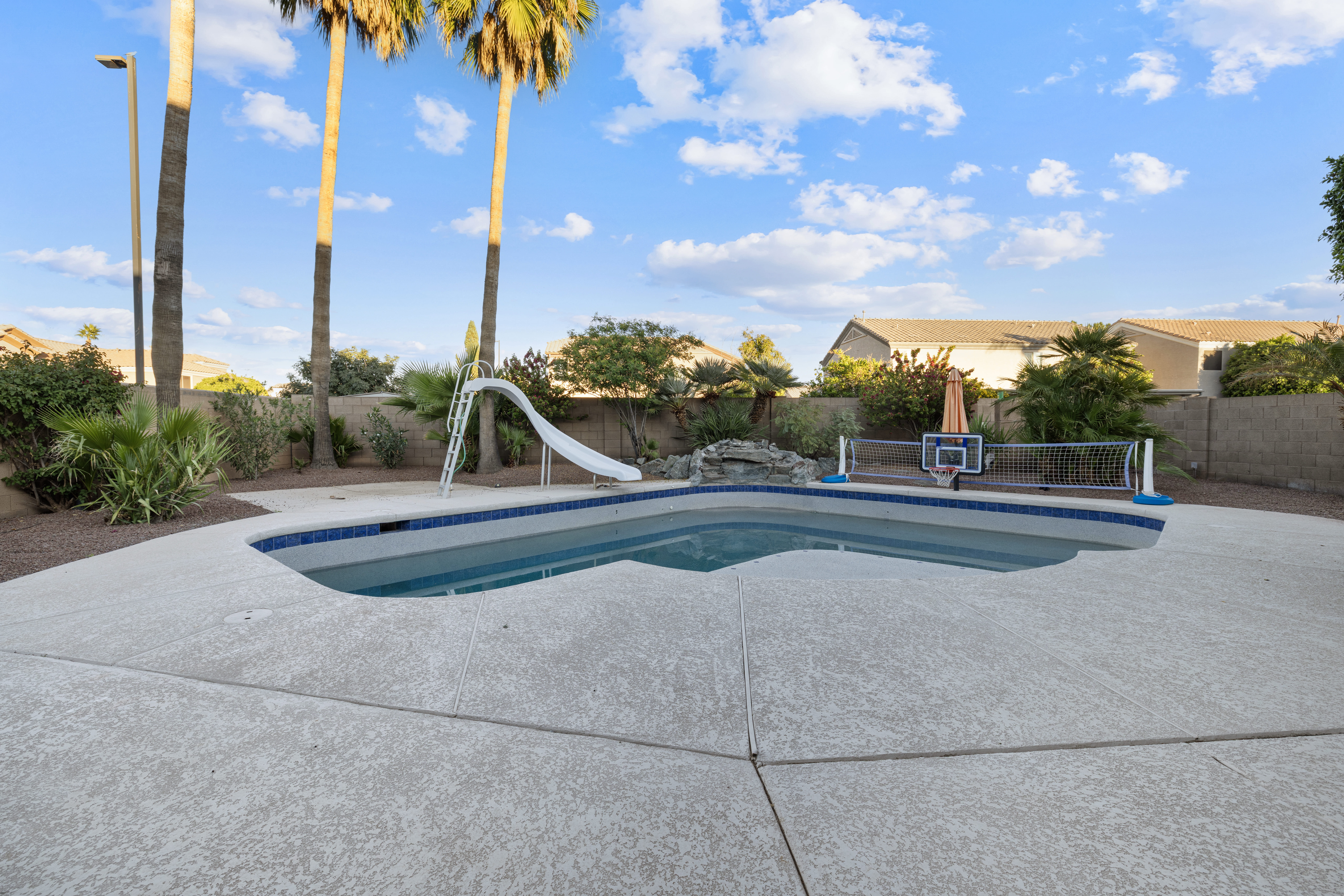 Freshly renovated 5-bed, 3-bath home with RV gate, new interior paint throughout, renewed bathrooms, and brand-new kitchen countertops. The layout features formal living and dining areas, a spacious family room, and an upstairs loft with front and back balconies. The main suite offers vaulted ceilings, a generous closet, dual sinks, and direct balcony access. Enjoy the extended covered patio and sparkling diving pool with waterfall, ideal for relaxing or entertaining. This beautifully updated property blends comfort, space, and style in a well-established Gilbert neighborhood close to parks, schools, shopping, and dining. Move-in ready and waiting for its next chapter, this home provides a great combination of modern updates, flexible living areas, and inviting outdoor space.