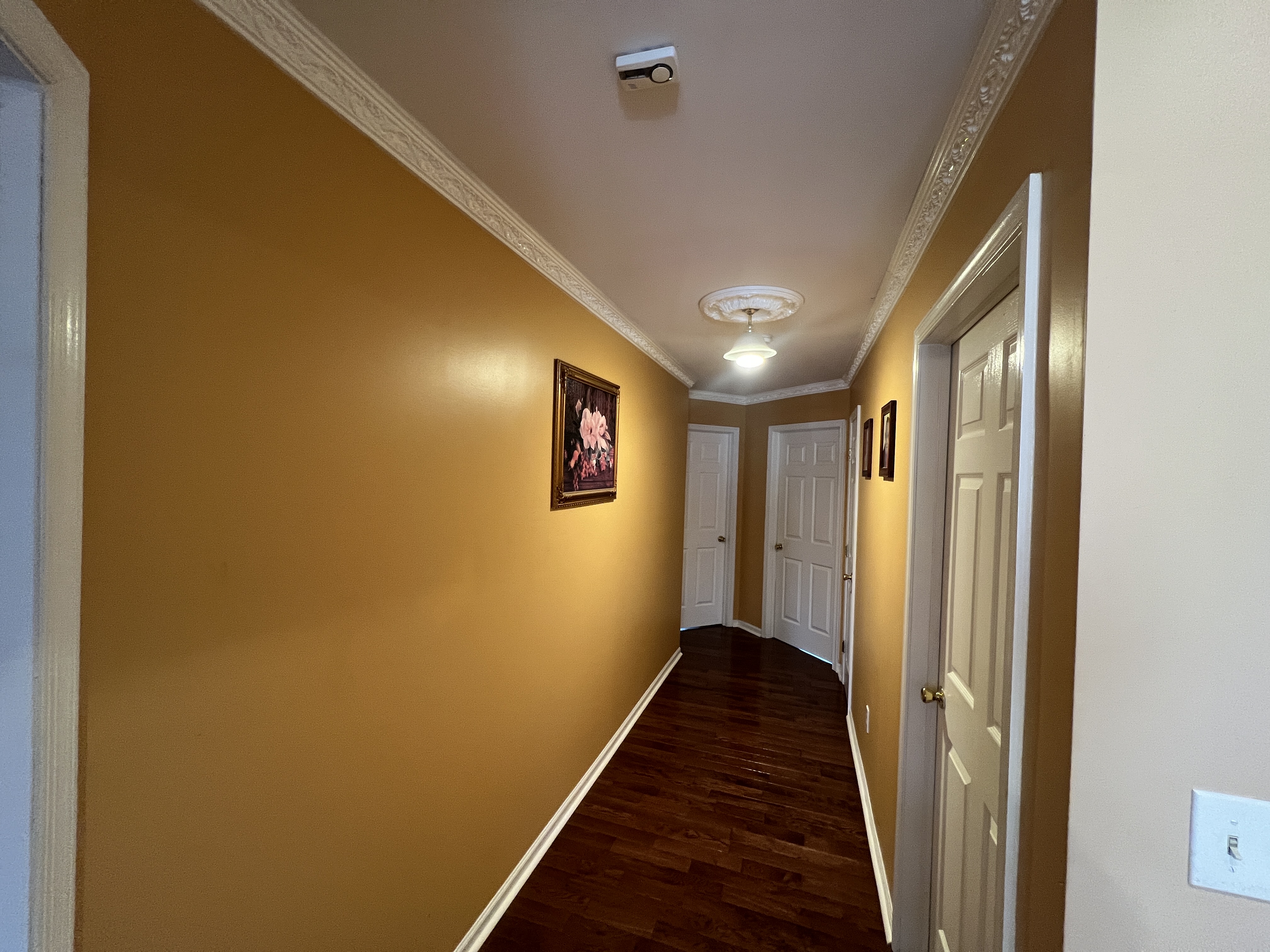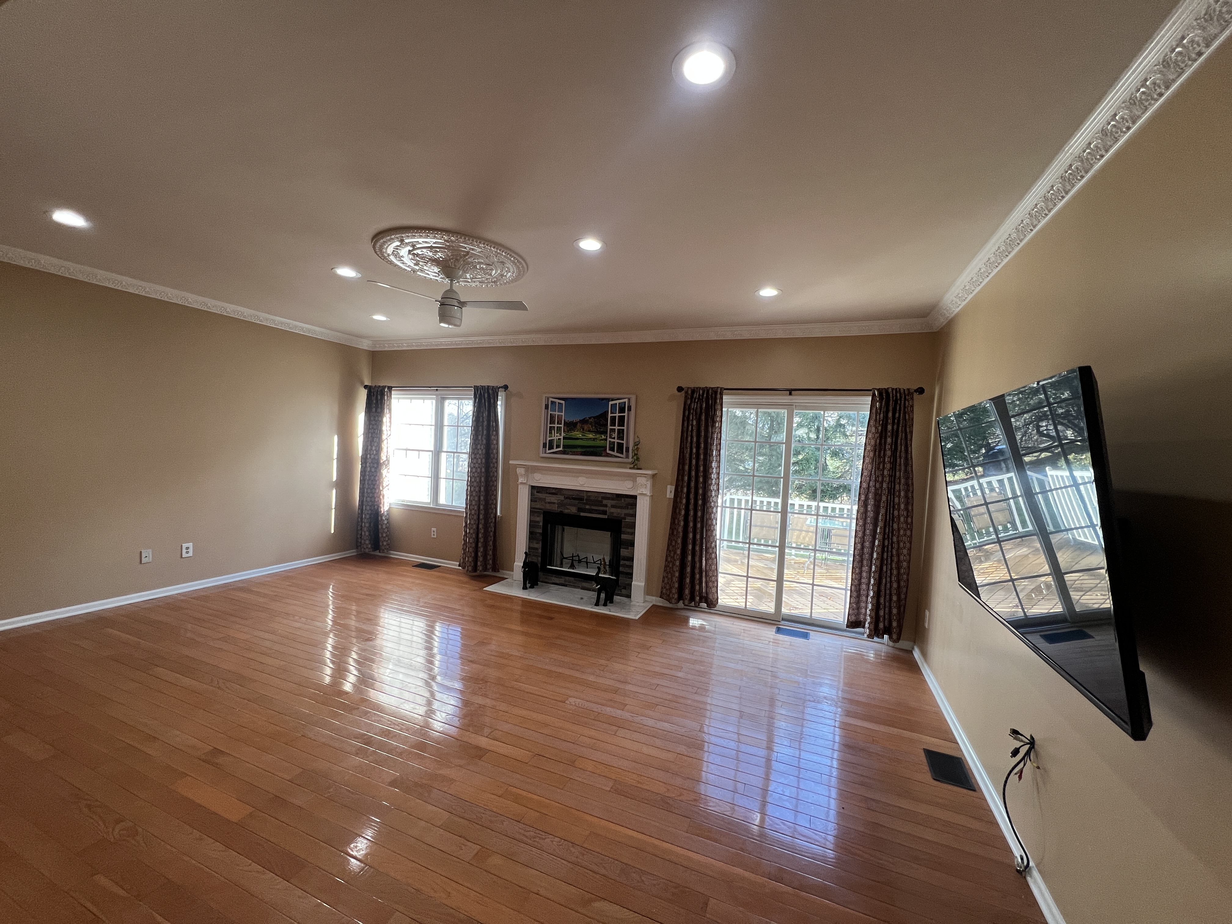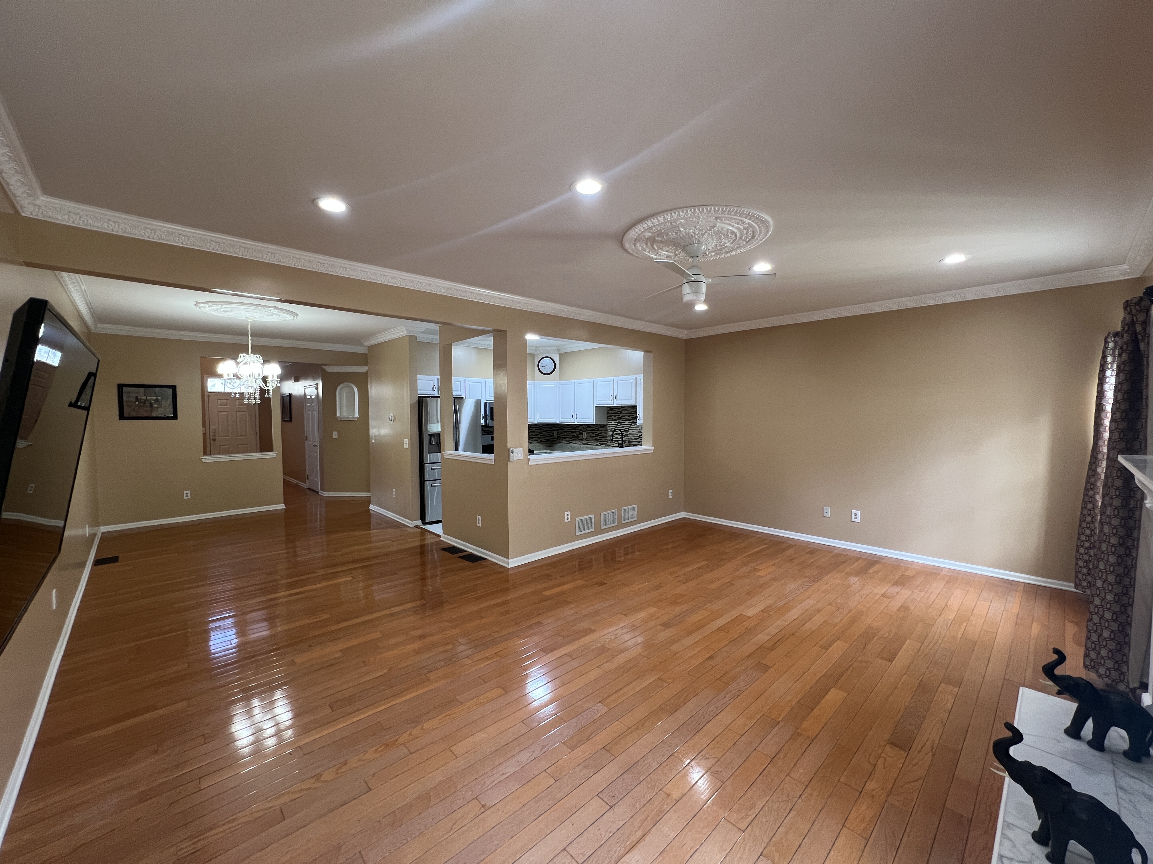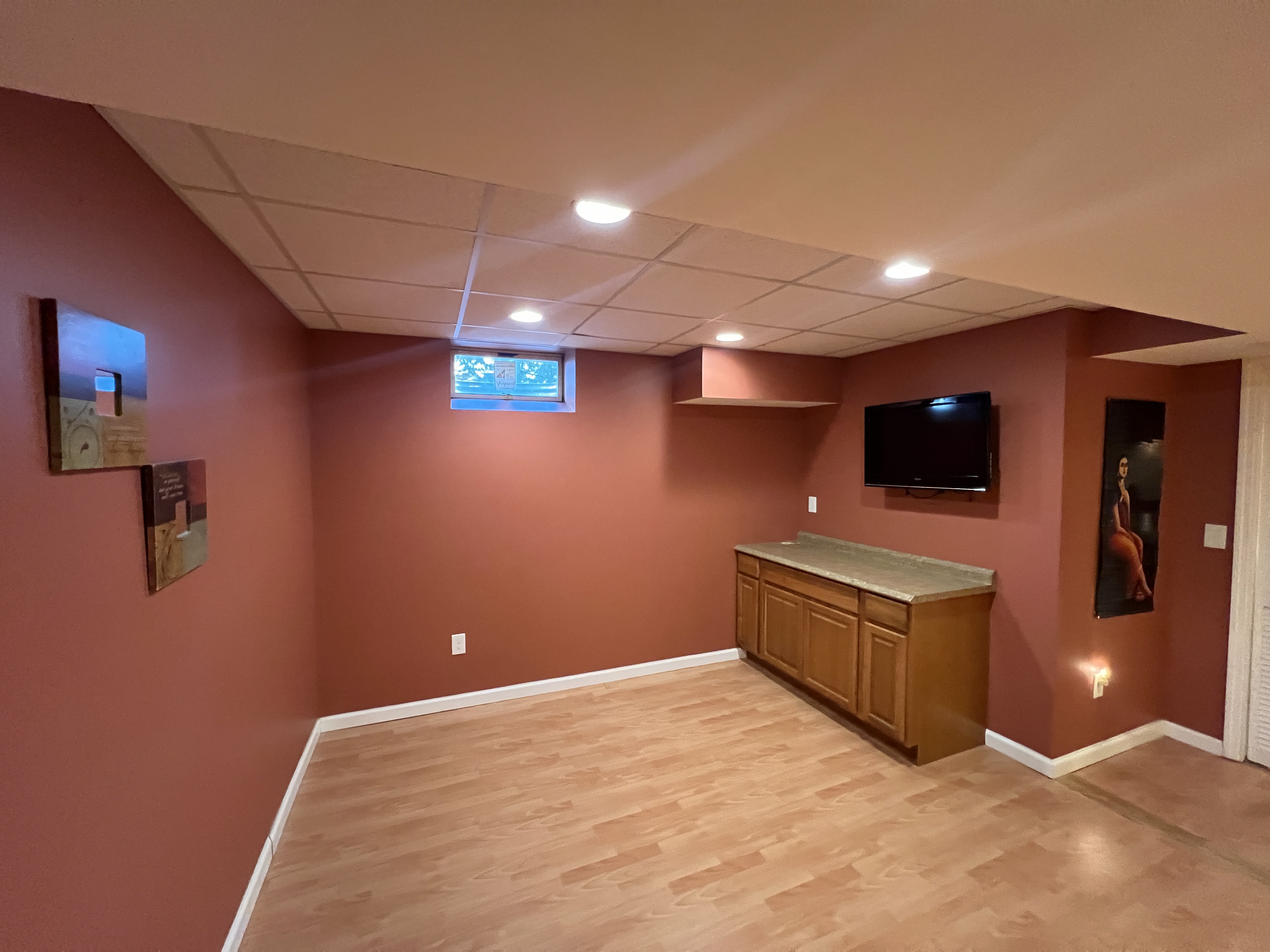 Inside, the main level features elegant hardwood flooring, crown molding, and recessed lighting, creating a warm and modern atmosphere. The upgraded kitchen includes stainless-steel appliances, extended cabinetry, and plenty of storage. The second level offers three spacious bedrooms and two full bathrooms. The primary suite is fully upgraded, and all bedrooms include new hardwood flooring, crown molding, and ceiling fans for added comfort. The finished basement elevates the home with a dedicated home theater, perfect for entertainment. Additional updates include a new water heater and new washer & dryer. A standout feature is the attached garage, equipped with extensive cabinetry for extra storage. With a new roof, fresh interior paint, and thoughtful upgrades throughout, this stunning home is truly move-in ready offering comfort, convenience, and style in one complete package.