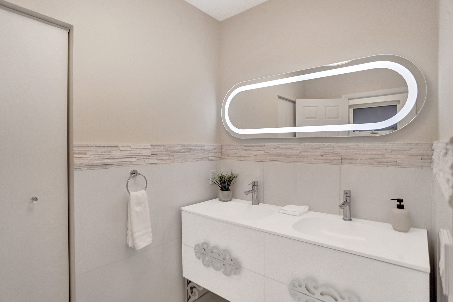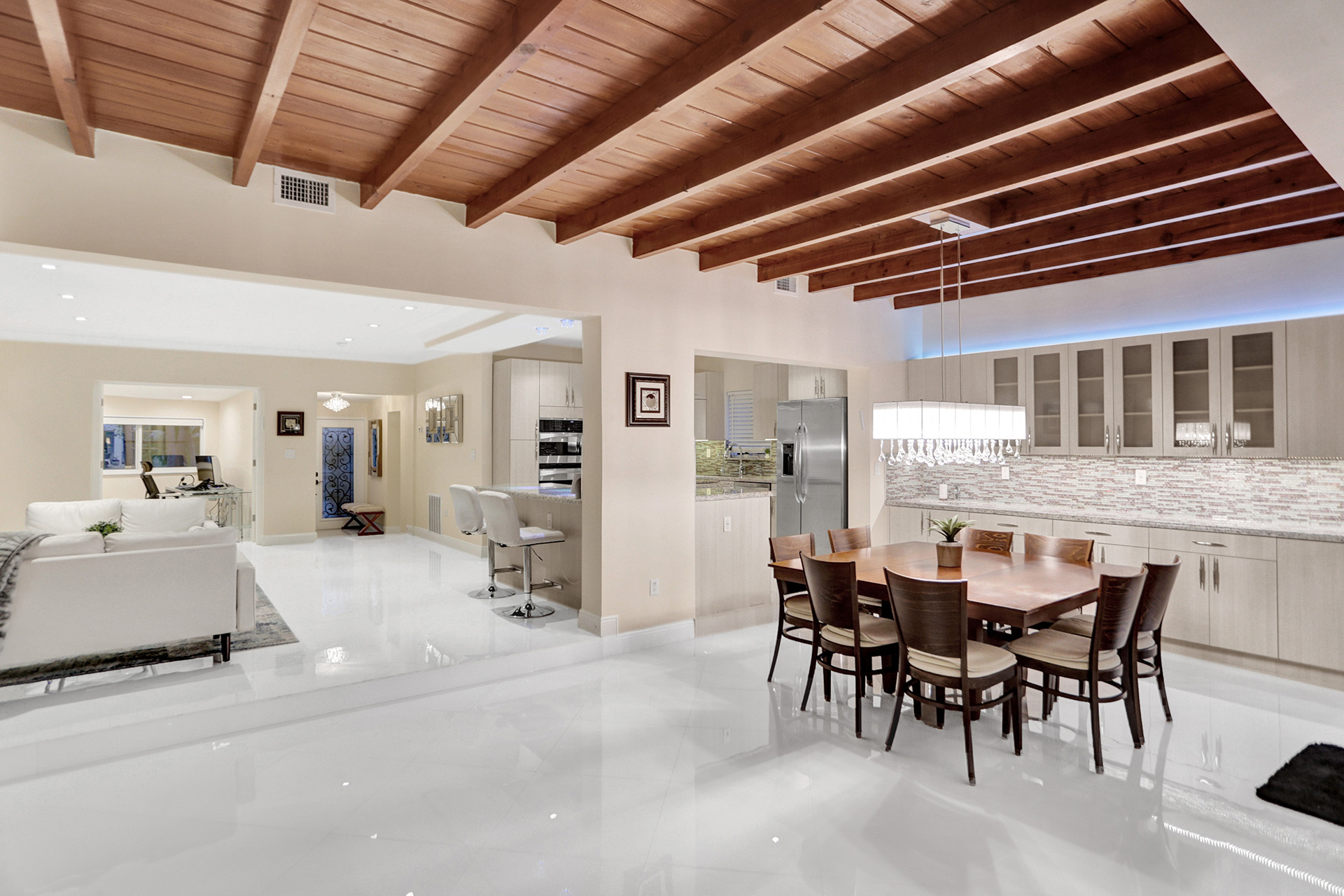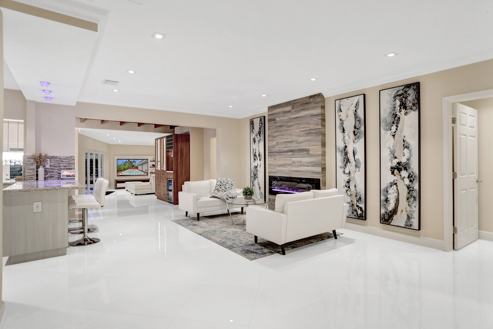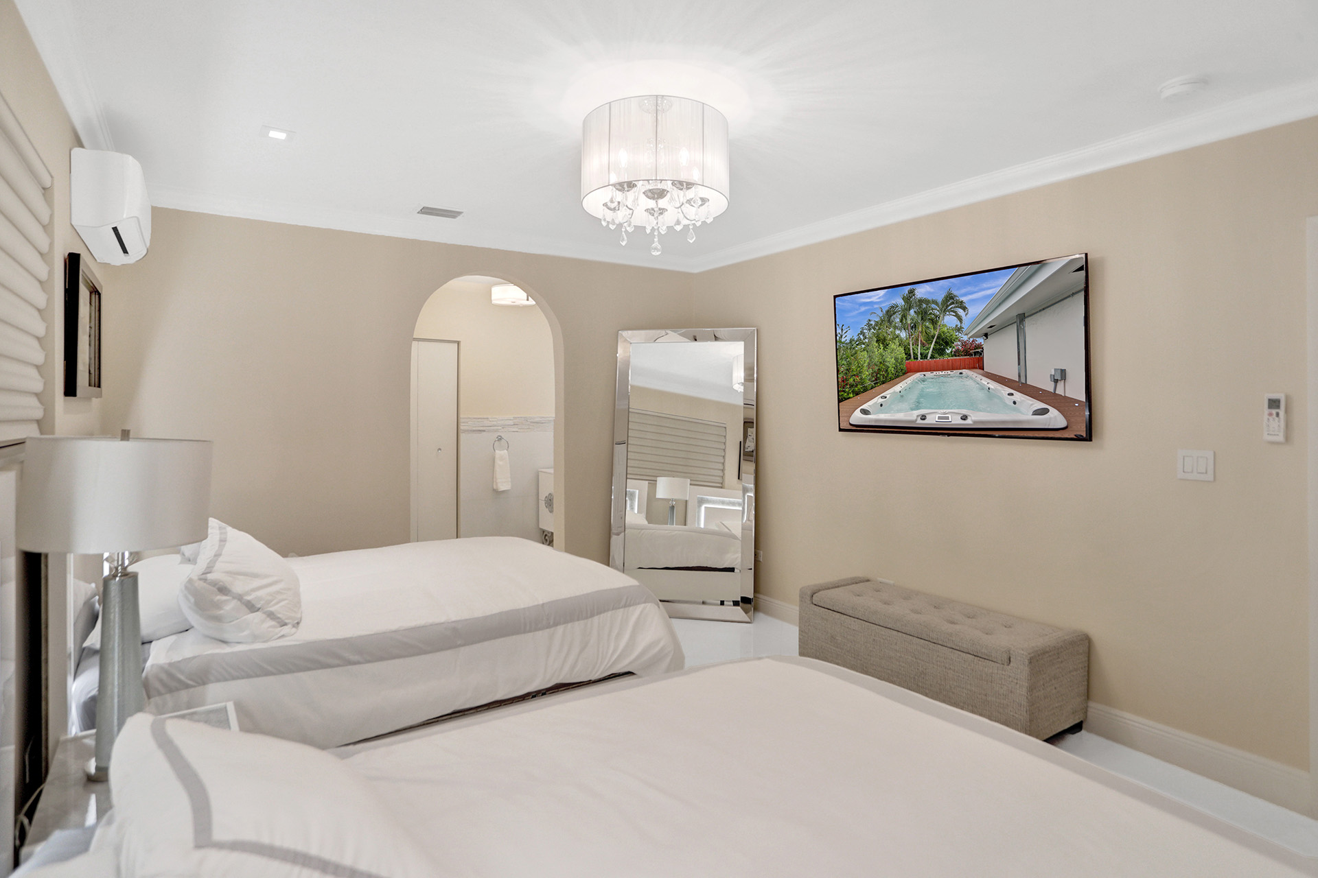Mint-condition modern home in Surfside with a functional layout and strong natural light. Featuring 4 bedrooms plus an additional office room and 3.5 bathrooms. The kitchen is designed for convenience with two sinks and generous storage. Outdoor space is built for entertaining with a grill area, fireplace, and a large sitting/lounge area, along with a private swim spa pool. Comfort features include split and central HVAC systems. Offered with custom furniture. Located near a newly renovated city park, and conveniently near the beach, Surfside Community Center, shopping, dining, and multiple shuls, near the popular IndianCreek island, with easy access to Bal Harbor and Miami Beach. Move-in ready with no construction or renovations needed.