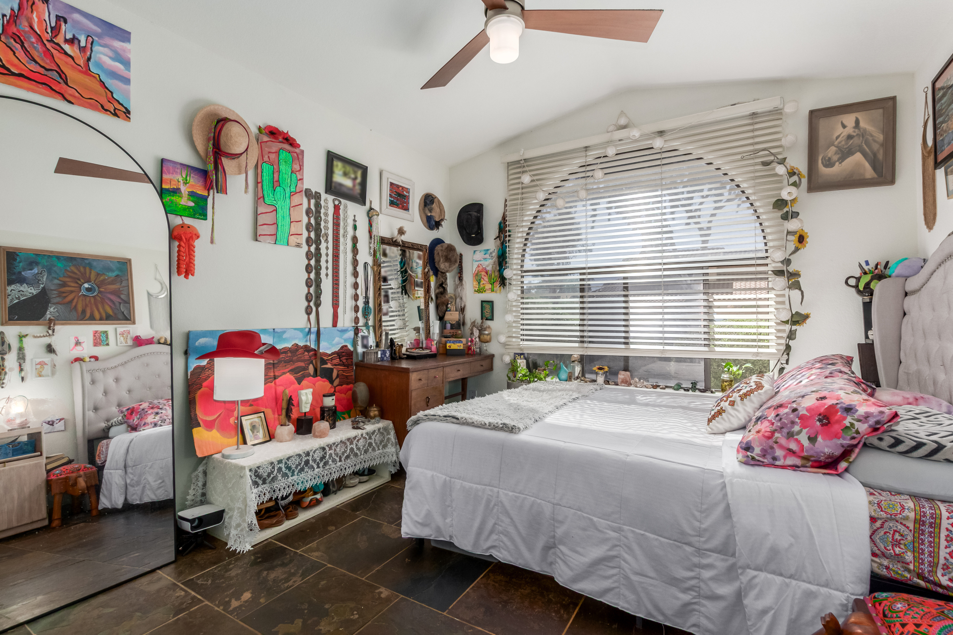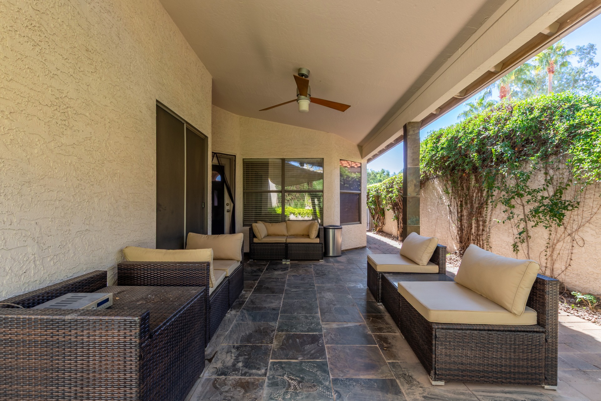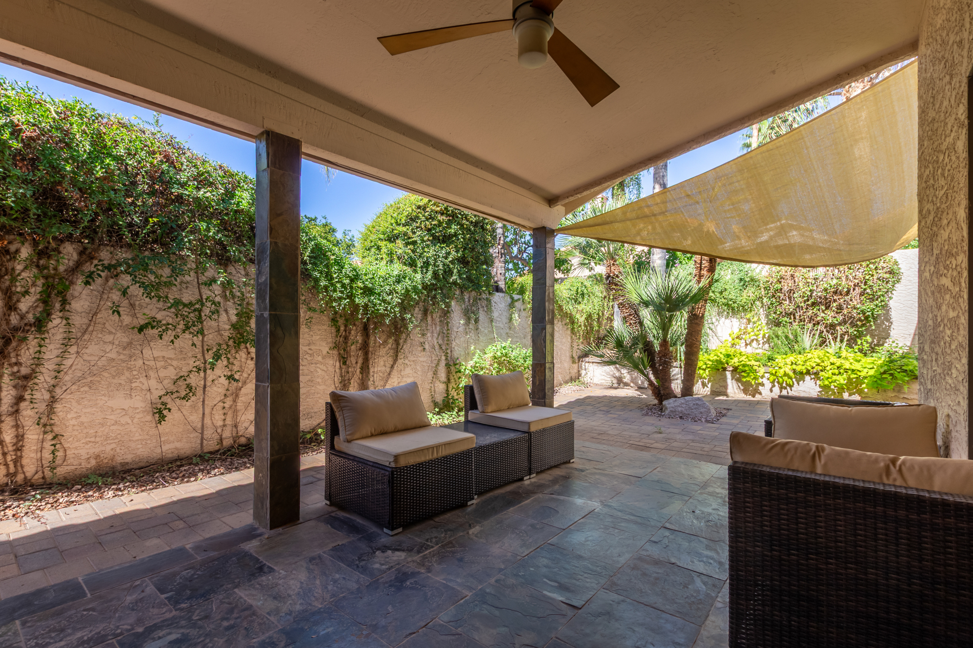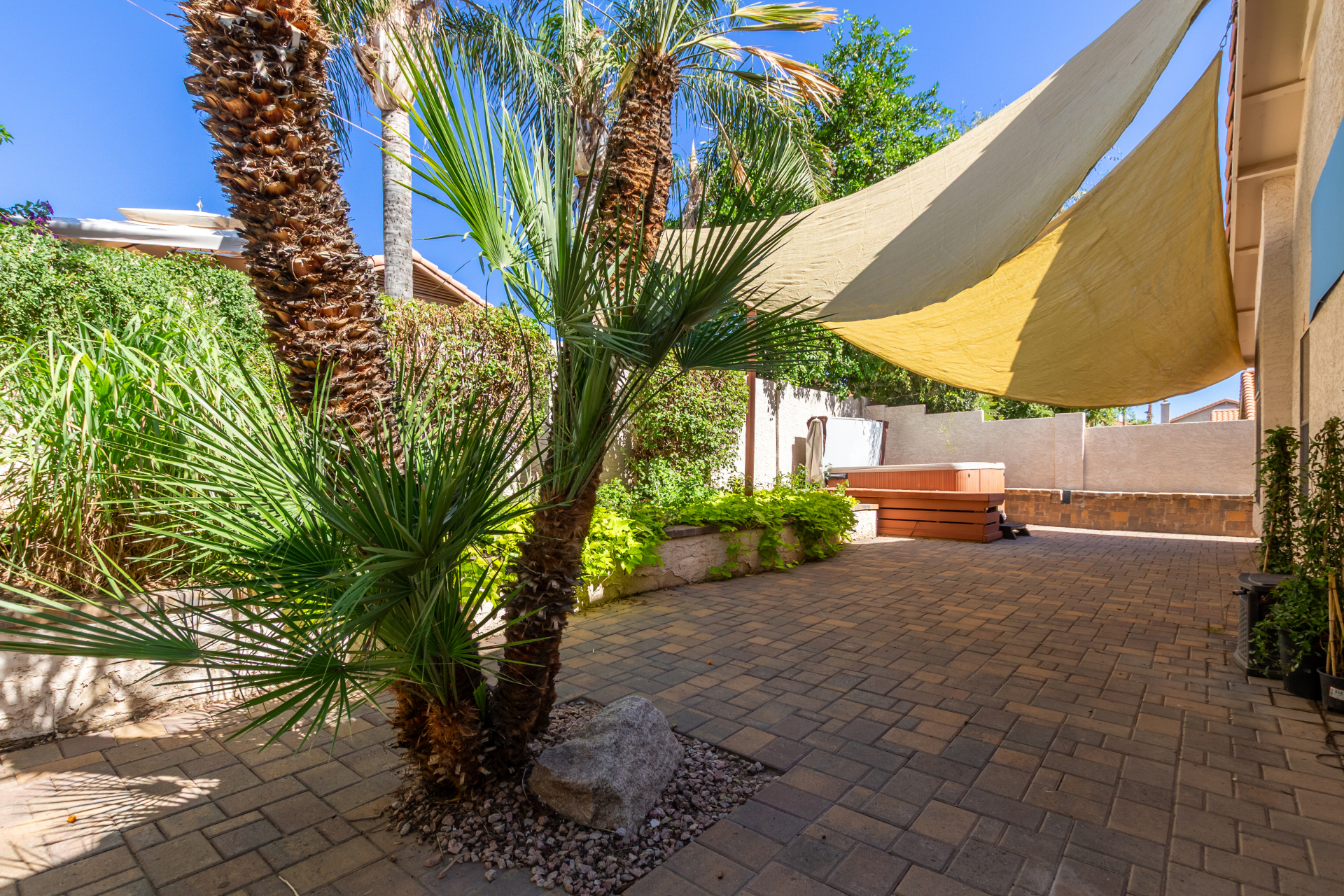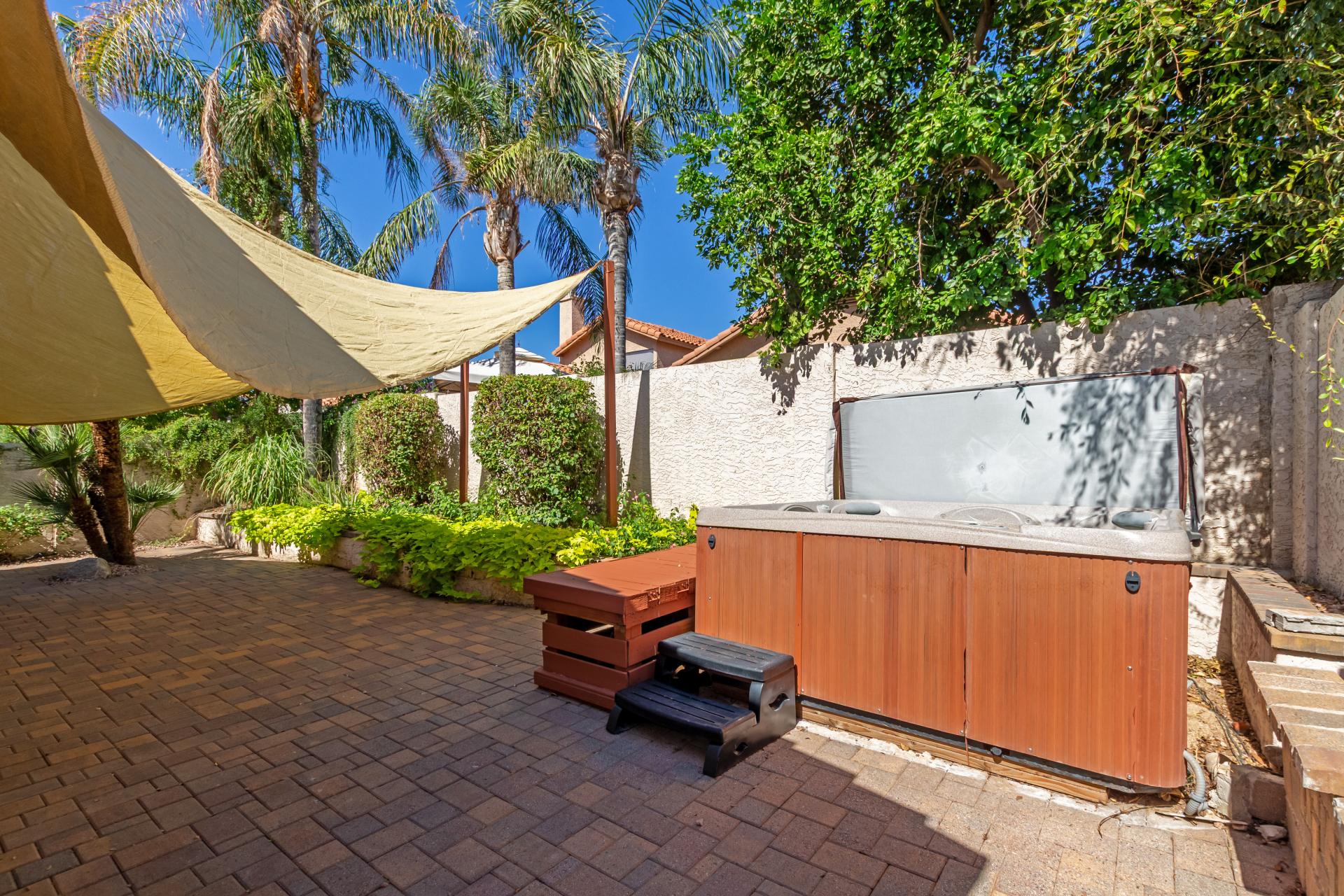 Interior highlights include high ceilings, wood flooring (with minor damage in the den), black tile kitchen countertops, stainless steel appliances, and slate tiled showers. The HVAC system is brand new, and a new spa was recently installed in the pavered backyard.